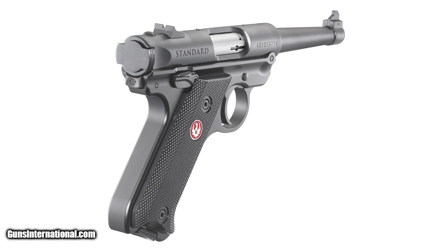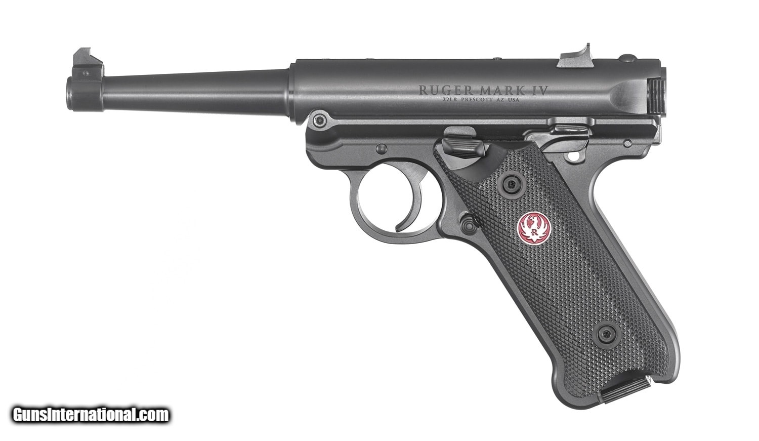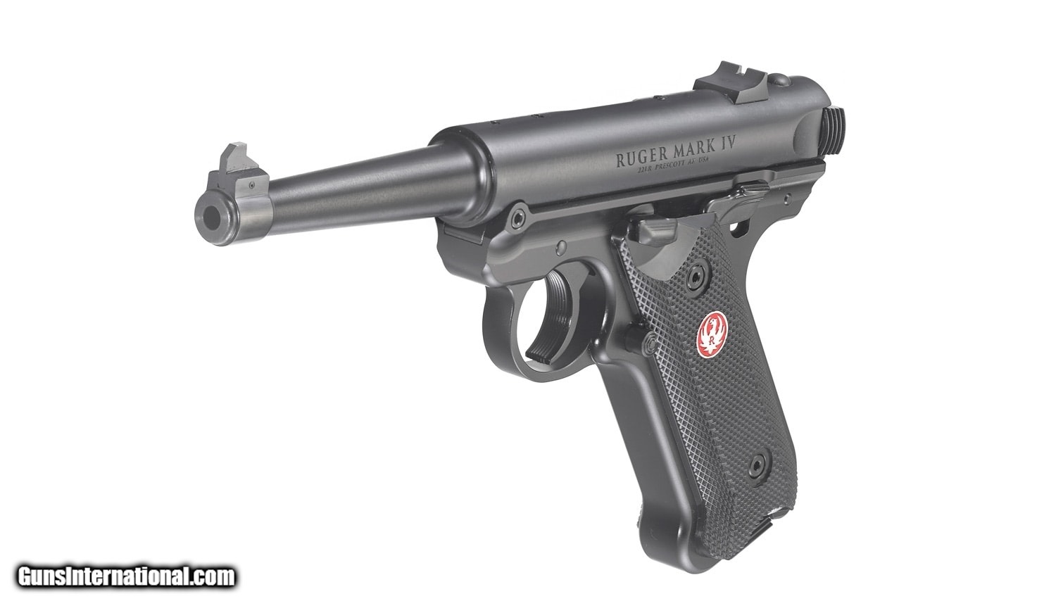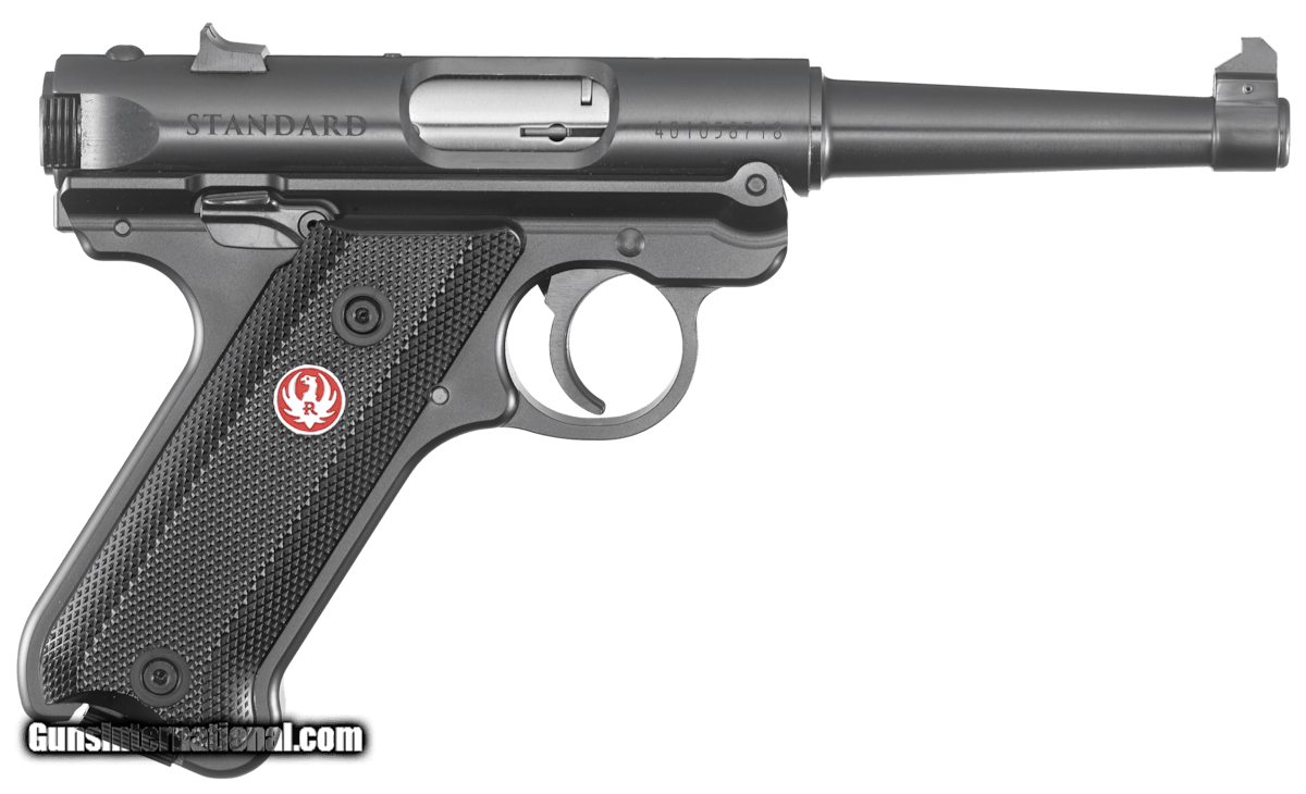 Description: Guns Listing ID: 53364 Maintenance and field-stripping on the Ruger Mark IV Standard is quick and easy thanks to the one-button takedown design that allows the upper receiver to be removed without the use of any tools. Chambered in 22 LR the aluminum grip frame of this rimfired semi-automatic handgun is CNC-machined from a single piece while the grip is smoothly contoured and features replaceable stippled panels to ensure a firm non-slip hold. Other features of the Mark IV Standard include a tapered barrel ambidextrous manual safety that can easily be converted to left-side only and a magazine disconnect prevents discharge if the magazine has been removed. Details Caliber 22 LR - Capacity 10 - Material Alloy Steel - Front Sight Fixed - Barrel Length 4.75 - Grip Frame Aluminum - Grips Checkered Synthetic - Finish Blued - Width 1.20 - Rear Sight Fixed - Barrel Style Tapered - Weight 28.2 oz. - Overall Length 9 - Height 5.40 - Grooves 6 - Twist 116 RH - Simple one-button takedown for quick and easy field-stripping and proper chamber to muzzle cleaning. - A recessed button in the back of the frame allows the upper receiver to tilt up and off of the grip frame without the use of tools. - Ergonomic bolt stop. - Internal cylindrical bolt construction ensures permanent sight to barrel alignment and higher accuracy potential than conventional moving slide designs. - Contoured ejection port and easy-to-grasp bolt ears allow for durable and reliable operation round after round. - Accurate sighting system features fixed sights and drilled and tapped receiver for Weaver- or Picatinny-style rail for easy mounting of optics. - Ambidextrous manual safety positively locks the sear in the SAFE position when applied. Safety can be converted to left-side only with included washer. - Features a conveniently located push-button magazine release on the left side of the frame. - Magazine drops free on release for faster reloading. - Magazine disconnect prevents discharge when the magazine has been removed. - Also includes two 10-round magazines. - One-piece precision CNC-machined grip frame. - Smoothly contoured comfortable grip features natural pointing grip angle with replaceable checkered grip panels for a non-slip hold. SOLD Manufacturer: RUGER Model: MARK IV STANDARD Caliber Info: .22 LR Condition: new Barrels: 4.8 barrel Finish: BLUED |