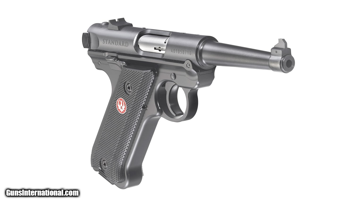 Description: Guns Listing ID: 53364 Maintenance and field-stripping on the Ruger Mark IV Standard is quick and easy thanks to the one-button takedown design that allows the upper receiver to be removed without the use of any tools. Chambered in 22 LR the aluminum grip frame of this rimfired semi-automatic handgun is CNC-machined from a single piece while the grip is smoothly contoured and features replaceable stippled panels to ensure a firm non-slip hold. Other features of the Mark IV Standard include a tapered barrel ambidextrous manual safety that can easily be converted to left-side only and a magazine disconnect prevents discharge if the magazine has been removed. Details Caliber 22 LR - Capacity 10 - Material Alloy Steel - Front Sight Fixed - Barrel Length 4.75 - Grip Frame Aluminum - Grips Checkered Synthetic - Finish Blued - Width 1.20 - Rear Sight Fixed - Barrel Style Tapered - Weight 28.2 oz. - Overall Length 9 - Height 5.40 - Grooves 6 - Twist 116 RH - Simple one-button takedown for quick and easy field-stripping and proper chamber to muzzle cleaning. - A recessed button in the back of the frame allows the upper receiver to tilt up and off of the grip frame without the use of tools. - Ergonomic bolt stop. - Internal cylindrical bolt construction ensures permanent sight to barrel alignment and higher accuracy potential than conventional moving slide designs. - Contoured ejection port and easy-to-grasp bolt ears allow for durable and reliable operation round after round. - Accurate sighting system features fixed sights and drilled and tapped receiver for Weaver- or Picatinny-style rail for easy mounting of optics. - Ambidextrous manual safety positively locks the sear in the SAFE position when applied. Safety can be converted to left-side only with included washer. - Features a conveniently located push-button magazine release on the left side of the frame. - Magazine drops free on release for faster reloading. - Magazine disconnect prevents discharge when the magazine has been removed. - Also includes two 10-round magazines. - One-piece precision CNC-machined grip frame. - Smoothly contoured comfortable grip features natural pointing grip angle with replaceable checkered grip panels for a non-slip hold. SOLD Manufacturer: RUGER Model: MARK IV STANDARD Caliber Info: .22 LR Condition: new Barrels: 4.8 BARREL Finish: BLUED |