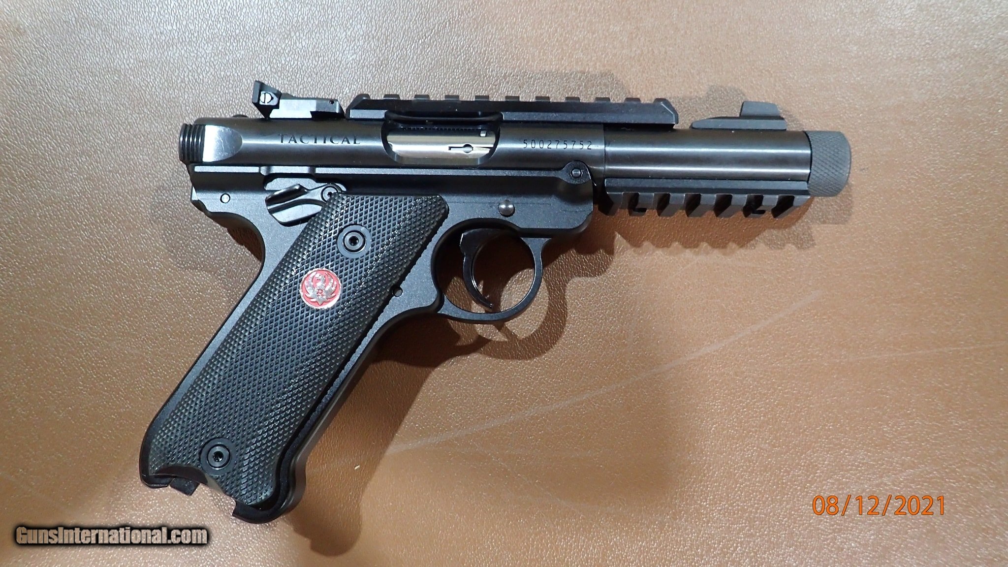Description: Guns Listing ID: 53369 Maintenance and field-stripping on the Ruger Mark IV Standard is quick and easy thanks to the one-button takedown design that allows the upper receiver to be removed without the use of any tools. Chambered in 22 LR the aluminum grip frame of this rimfired semi-automatic handgun is CNC-machined from a single piece while the grip is smoothly contoured and features replaceable stippled panels to ensure a firm non-slip hold. Other features of the Mark IV Standard include a tapered barrel ambidextrous manual safety that can easily be converted to left-side only and a magazine disconnect prevents discharge if the magazine has been removed. Details Caliber 22 LR - Capacity 10 - Material Alloy Steel - Front Sight Fixed - Barrel Length 4.40 - Grip Frame Aluminum - Grips Checkered Synthetic - Finish Black Oxide - Width 1.20 - Rear Sight Adjustable - Barrel Style Threaded - Weight 34.6 oz. - Overall Length 8.50 - Height 5.50 - Grooves 6 - Twist 116 RH - Simple one-button takedown for quick and easy field-stripping and proper chamber to muzzle cleaning. - A recessed button in the back of the frame allows the upper receiver to tilt up and off of the grip frame without the use of tools. - Ergonomic bolt stop. - Internal cylindrical bolt construction ensures permanent sight to barrel alignment and higher accuracy potential than conventional moving slide designs. - Contoured ejection port and easy-to-grasp bolt ears allow for durable and reliable operation round after round. - Accurate sighting system features adjustable rear sight and drilled and tapped receiver for Weaver- or Picatinny-style rail for easy mounting of optics. - Ambidextrous manual safety positively locks the sear in the SAFE position when applied. Safety can be converted to left-side only with included washer. - Features a conveniently located push-button magazine release on the left side of the frame. - Magazine drops free on release for faster reloading. - Magazine disconnect prevents discharge when the magazine has been removed. - Also includes two 10-round magazines. - One-piece precision CNC-machined grip frame. - Smoothly contoured comfortable grip features natural pointing grip angle with replaceable checkered grip panels for a non-slip hold. - Threaded barrel and top and bottom picatinny rails for attaching tactical accessories. SOLD Manufacturer: RUGER Model: MARK IV TACTICAL Caliber Info: .22 LR Condition: new Barrels: 4.4 barrel Finish: BLACK |