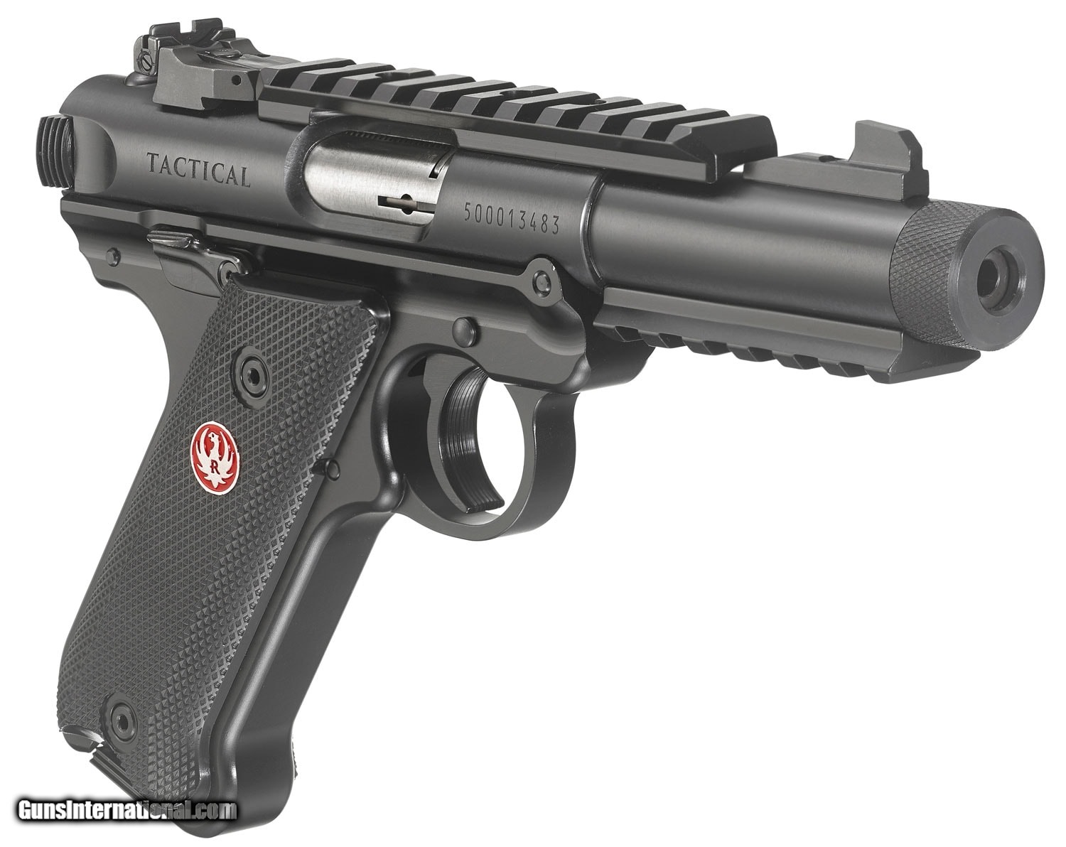 Description: Guns Listing ID: 53369 Maintenance and field-stripping on the Ruger Mark IV Standard is quick and easy thanks to the one-button takedown design that allows the upper receiver to be removed without the use of any tools. Chambered in 22 LR the aluminum grip frame of this rimfired semi-automatic handgun is CNC-machined from a single piece while the grip is smoothly contoured and features replaceable stippled panels to ensure a firm non-slip hold. Other features of the Mark IV Standard include a tapered barrel ambidextrous manual safety that can easily be converted to left-side only and a magazine disconnect prevents discharge if the magazine has been removed. Details Caliber 22 LR - Capacity 10 - Material Alloy Steel - Front Sight Fixed - Barrel Length 4.40 - Grip Frame Aluminum - Grips Checkered Synthetic - Finish Black Oxide - Width 1.20 - Rear Sight Adjustable - Barrel Style Threaded - Weight 34.6 oz. - Overall Length 8.50 - Height 5.50 - Grooves 6 - Twist 116 RH - Simple one-button takedown for quick and easy field-stripping and proper chamber to muzzle cleaning. - A recessed button in the back of the frame allows the upper receiver to tilt up and off of the grip frame without the use of tools. - Ergonomic bolt stop. - Internal cylindrical bolt construction ensures permanent sight to barrel alignment and higher accuracy potential than conventional moving slide designs. - Contoured ejection port and easy-to-grasp bolt ears allow for durable and reliable operation round after round. - Accurate sighting system features adjustable rear sight and drilled and tapped receiver for Weaver- or Picatinny-style rail for easy mounting of optics. - Ambidextrous manual safety positively locks the sear in the SAFE position when applied. Safety can be converted to left-side only with included washer. - Features a conveniently located push-button magazine release on the left side of the frame. - Magazine drops free on release for faster reloading. - Magazine disconnect prevents discharge when the magazine has been removed. - Also includes two 10-round magazines. - One-piece precision CNC-machined grip frame. - Smoothly contoured comfortable grip features natural pointing grip angle with replaceable checkered grip panels for a non-slip hold. - Threaded barrel and top and bottom picatinny rails for attaching tactical accessories. SOLD Manufacturer: RUGER Model: MARK IV TACTICAL Caliber Info: .22 LR Condition: new Barrels: 4.4 barrel Finish: BLACK |