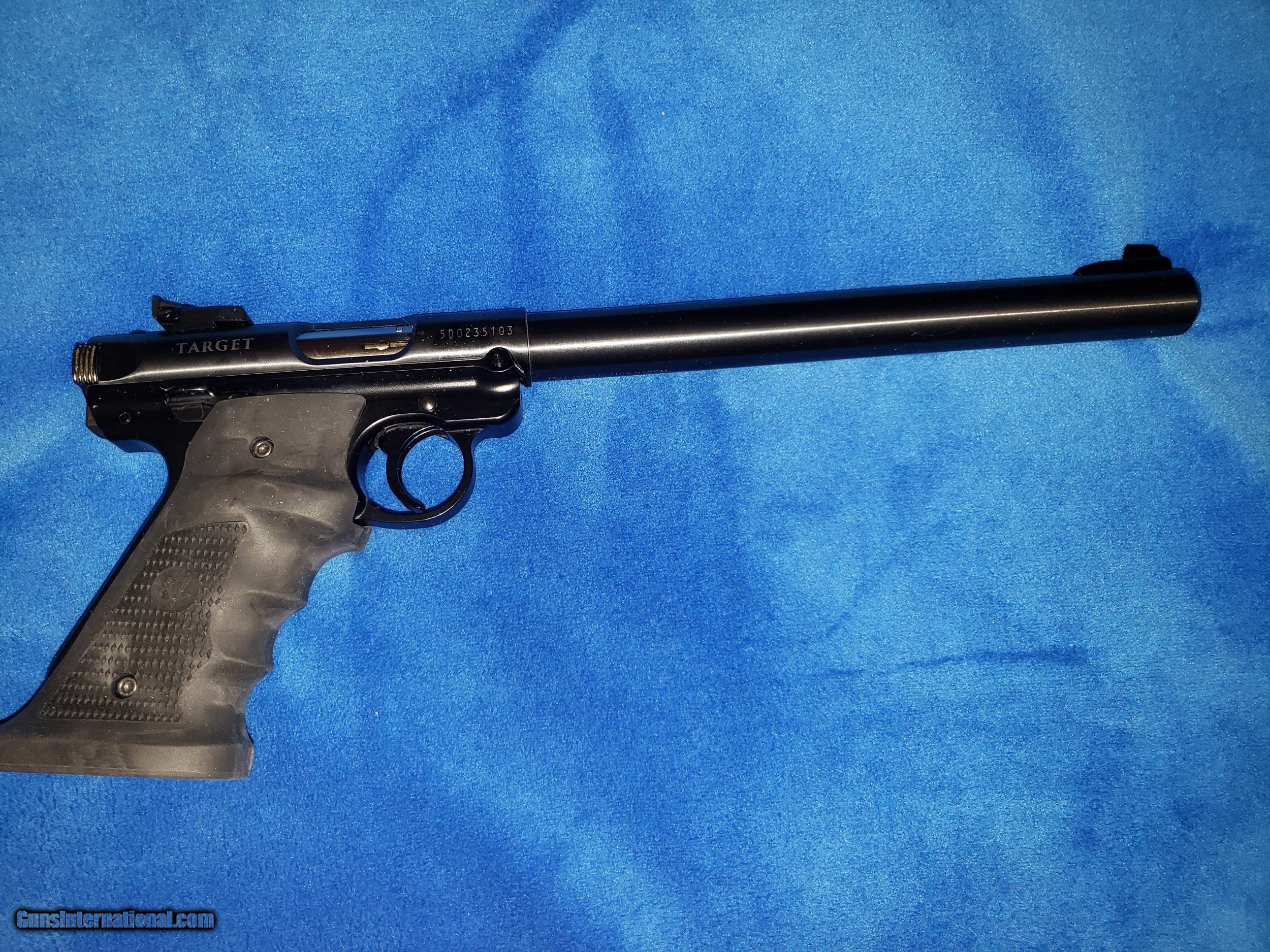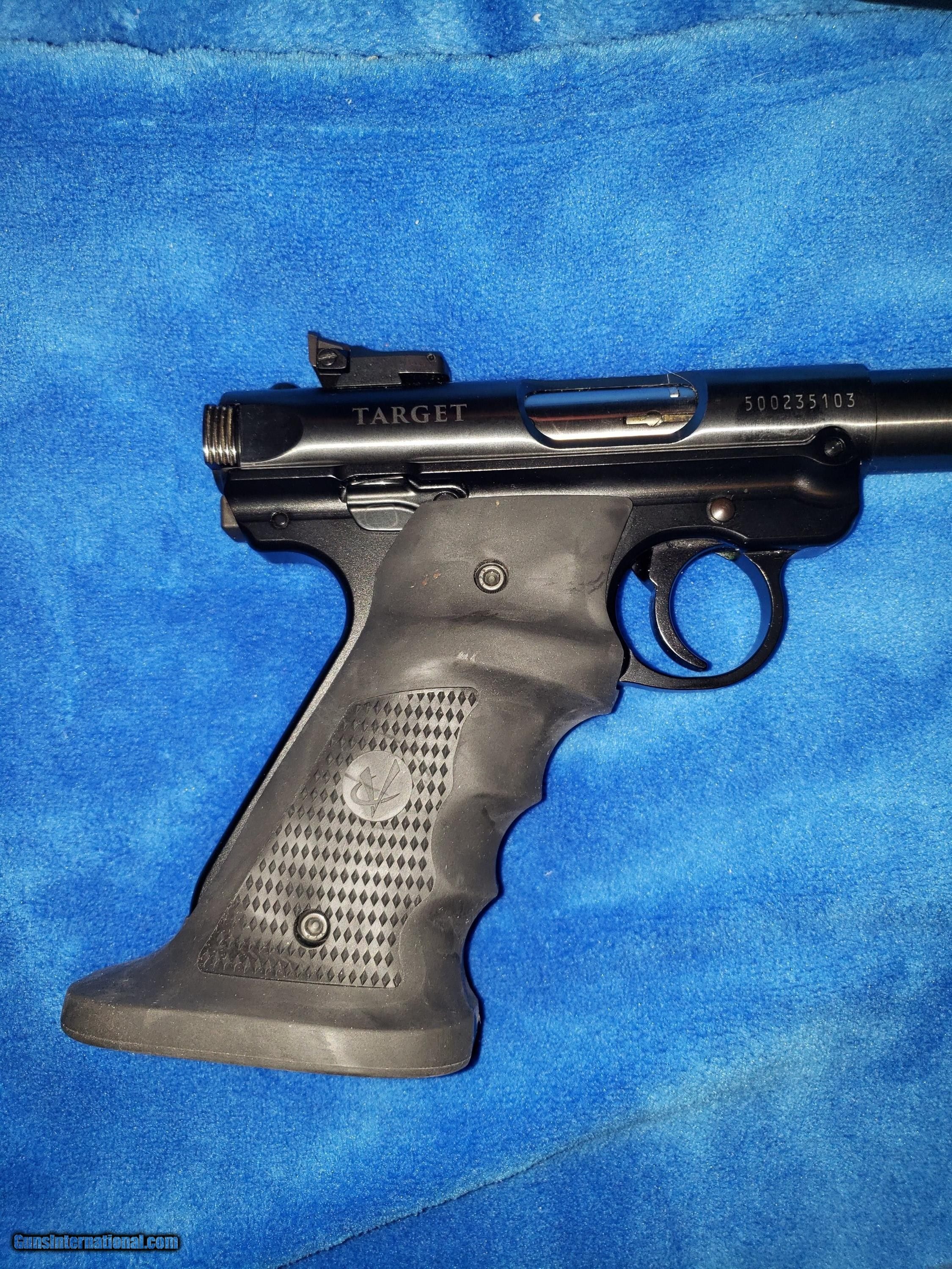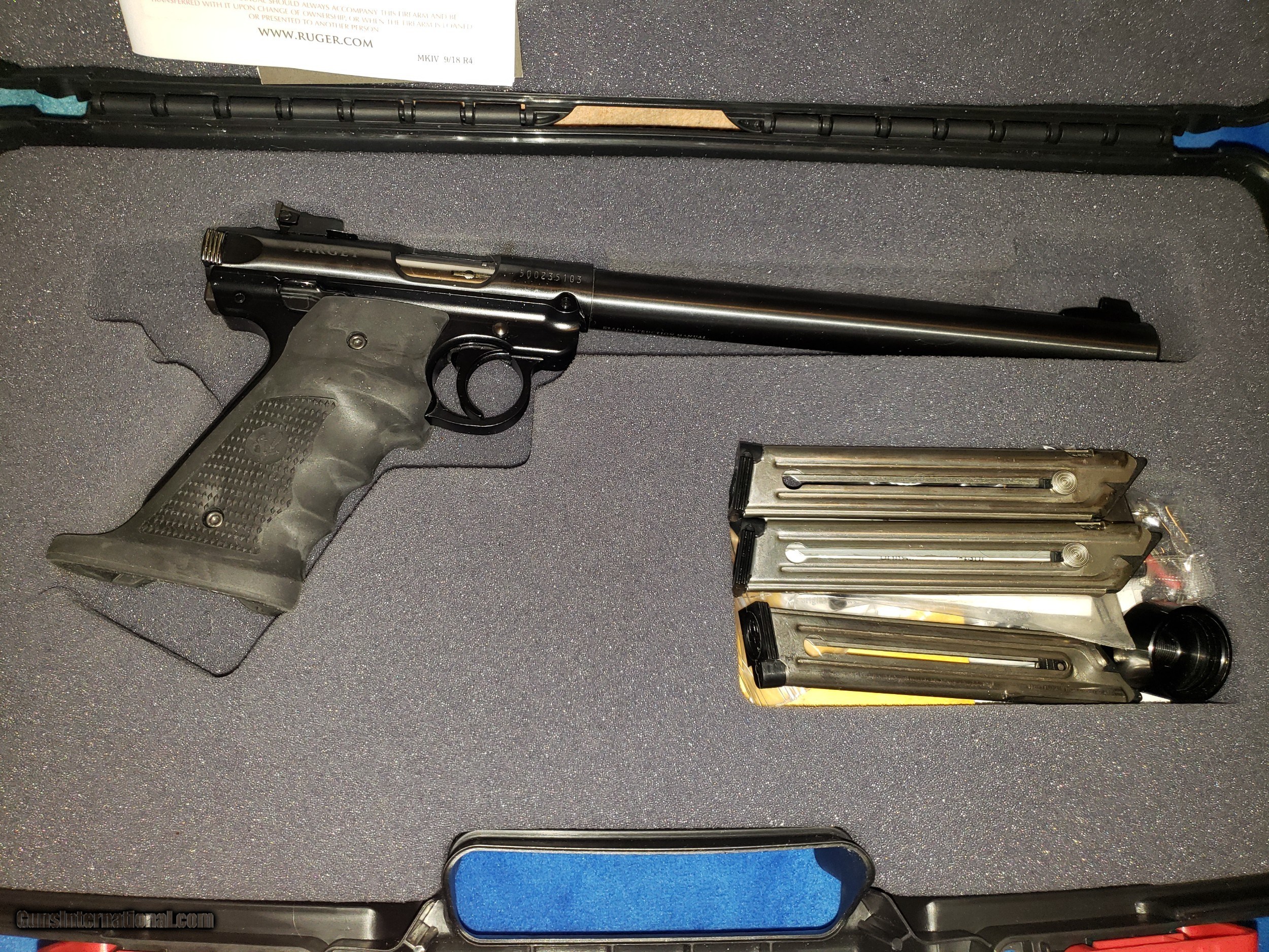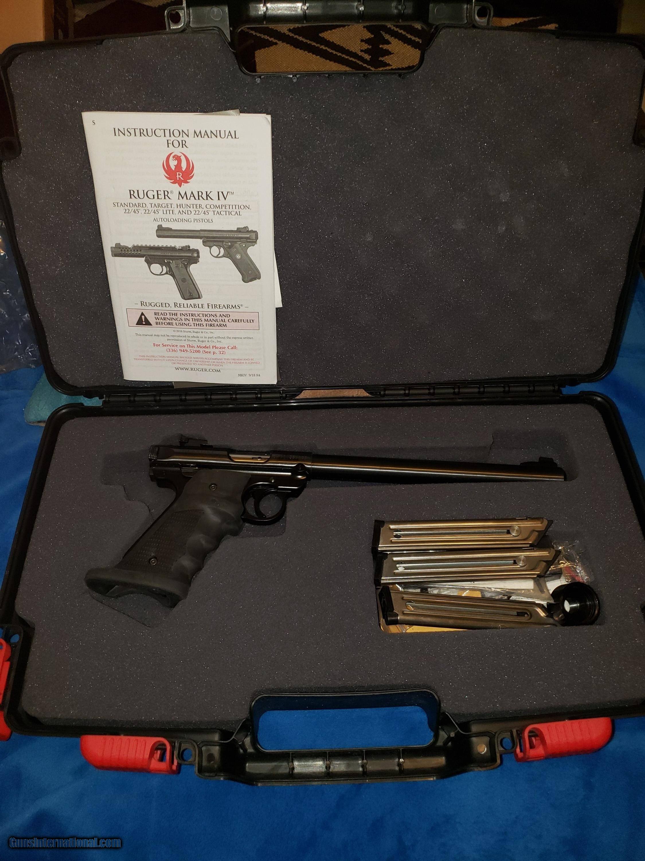 Description: Ruger MK IV .22 auto 10" bull barrel "Target Model with large Ruger Range case. beautiful custom wrap around Grips Almost new!! Perfect bore. Comes with 4 magazines. All original paperwork and manuals Will consider trade. For hammer shotgun double barrel breach loading need not be nitro SOLD |