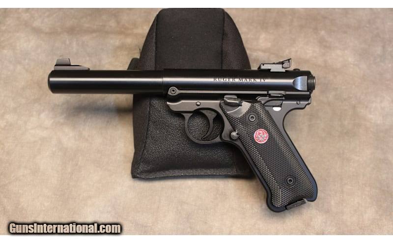 Description: This Ruger MK IV target is in excellent condition. It comes with the box, manual and one spare 10 round magazine. It would make an excellent target or small game hunting gun. Ruger target pistols are known for their accuracy and durability. .22 Long Rifle SOLD Chambers: .22 Long Rifle Metal Condition: Excellent Bore Condition: Excellent Barrels: 5.5 Weight: 35.6 oz Sights: "Black rear adjustable for elevation and windage, black front post Item Location: Columbia, MO |