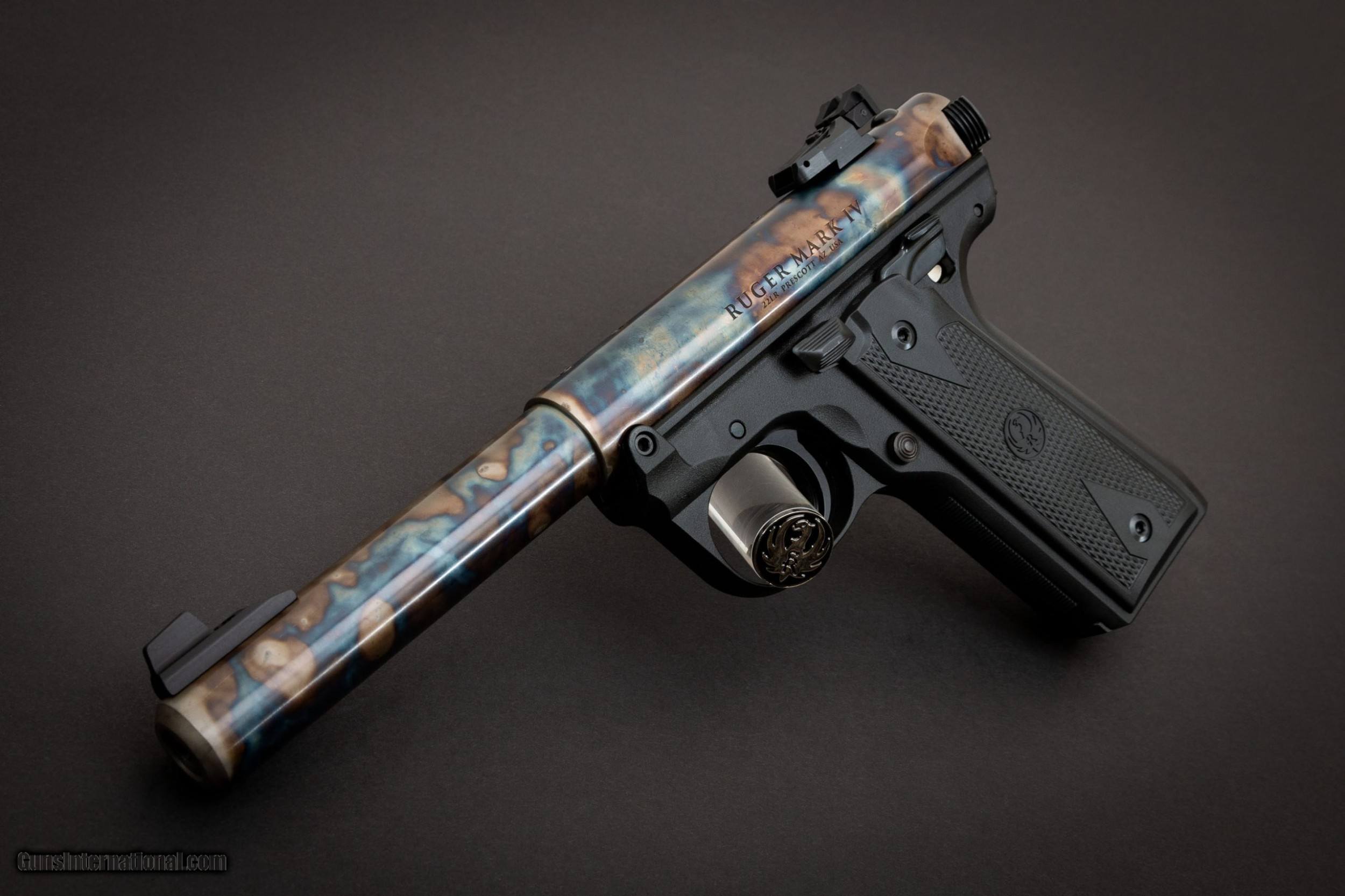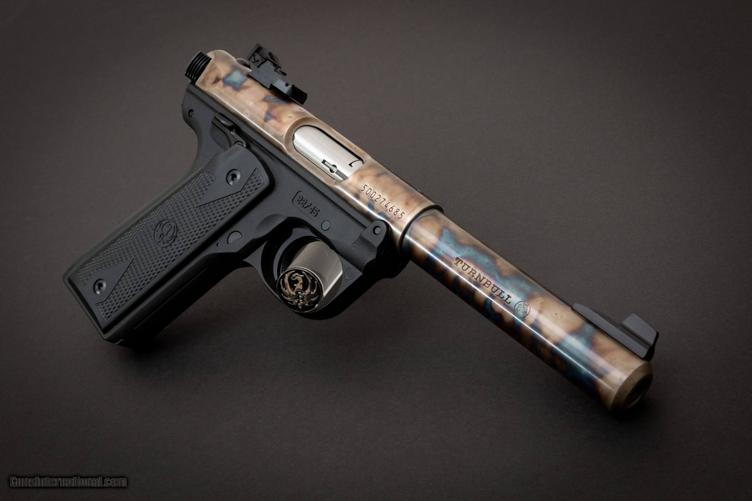 Description: The Ruger Mark IV .22LR is an improved version of the Ruger Mark III, which was known for its accuracy and reliability. The Mark IV’s simple, one-button takedown makes field-stripping and proper chamber-to-muzzle cleaning a breeze. The Mark IV 22/45 features a polymer frame and synthetic checkered grips. We polish the tube and barrel, and then color case harden it using Turnbull’s traditional bone charcoal method, which has been our signature for decades. Includes 2 ten-round magazines. Personalization options are available. *Not CA or MA compliant Contact us for more information and additional photographs. SOLD Handgun Caliber: .22 Long Rifle Manufacturer: Ruger Model: Mark IV 22/45 Serial Number: 500274685 Barrel Length: 5.5 Condition: New Action: Semi-Automatic Finish: Turnbull Bone Charcoal Case Hardening Sights: Front Fixed, Rear Adjustable Item Location: NY |