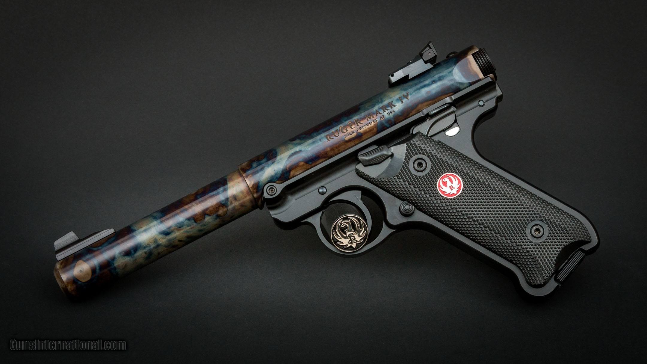 Description: The Ruger Mark IV .22LR is an improved version of the Ruger Mark III, which was known for its accuracy and reliability. The Mark IV’s simple, one-button takedown makes field-stripping and proper chamber-to-muzzle cleaning a breeze. Our process involves polishing the tube and barrel and then color case hardening it using Turnbull’s traditional bone charcoal method, which has been our signature for decades. Includes 2 ten-round magazines. *Not CA or MA compliant Call 585-657-6338 to purchase. Contact us for more information and additional photographs. SOLD Handgun Caliber: .22 Long Rifle Manufacturer: Ruger Model: Mark IV Target Serial Number: 500590076 Barrel Length: 5.5 Condition: New Barrel Type: Round Bull Barrel Action: Semi-Automatic Weight: 35.6 oz. Sights: Front Fixed, Rear Adjustable Item Location: Upstate New York, Finger Lakes Region |