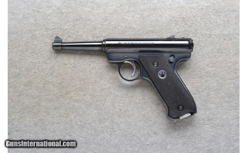 Description: This Ruger Automatic Pistol Model is a semi-auto pistol in .22 LR Cal. It has a 4.75 inch barrel. A blade front and notch rear sight. The grip is a checkered black plastic with a Ruger eagle on the left side panel. .22 Long Rifle SOLD Chambers: Semi-Auto 10 round magazine. Metal Condition: Very good. A few minor handling marks. Bore Condition: Very good. Barrels: 4.75 inch. Triggers: Grooved. Weight: 36 oz, Sights: Blade front. Notch rear. Item Location: Richfield, WI |