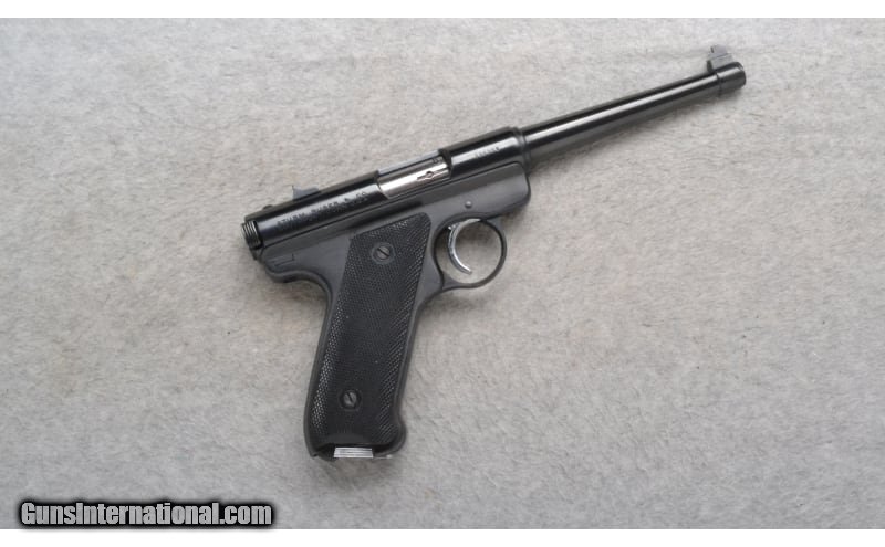 Description: This Ruger Model Automatic Pistol is a 10 shot semi-auto pistol in .22 Long Rifle Cal. It has a 6 inch barrel. A blade front sight and notch rear sight. The grip panels are a checkered hard black plastic. The trigger is grooved. .22 Long Rifle SOLD Chambers: 10 round magazine. Metal Condition: Excellent. Bore Condition: Excellent. Barrels: 6 inch. Weight: 38 oz. Sights: Blade front. Notch rear. Item Location: Altoona, IA |
