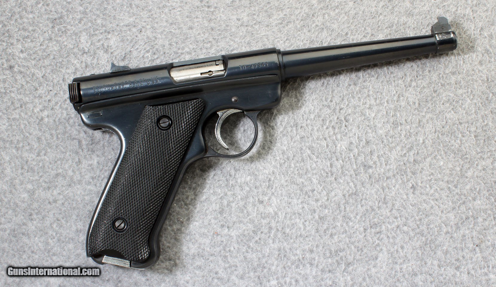 Description: Description: The Ruger Standard Automatic Pistol is simple, rugged, and affordable. The internal cylindrical bolt construction design delivers higher accuracy potential by ensuring permanent alignment. Durable steel frame and 6 inch barrel, fixed Patridge blade front and drift adjustable rear sight result in accuracy shot after shot. The smoothly contoured grip sports a natural pointing grip angle and checkered non-slip grip panels. This is great pistol for target shooting, small game hunting and plinking. Manufactured 1970. .22 Long Rifle SOLD Metal Condition: "Very good, with scratches Bore Condition: Excellent Barrels: 6 inch barrel Triggers: Single action Weight: 37 oz. Sights: Drift adjustable rear sight with Patridge blade front Item Location: Lehi, UT |