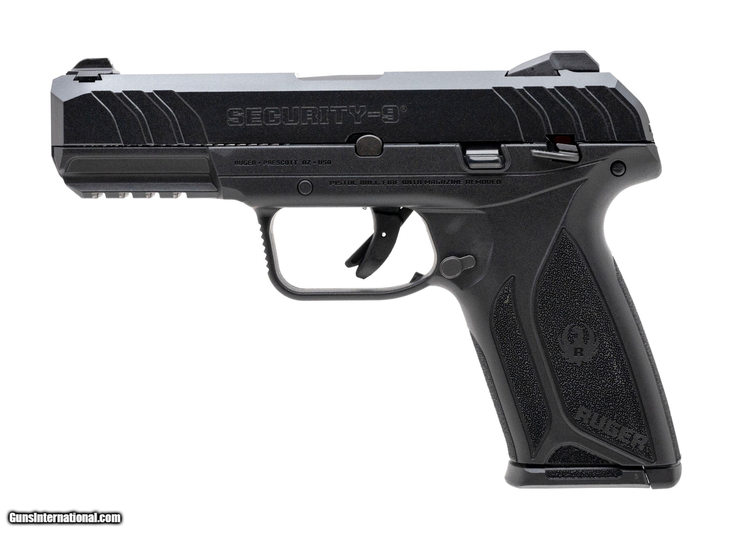 Description: "Ruger Security-9 Pistol. 9mm with a 4"" barrel. Ruger compact polymer frame pistol with an black oxide finish and 3-dot sight. New. UPC: 736676038107 (STOCK PHOTO) SOLD |
