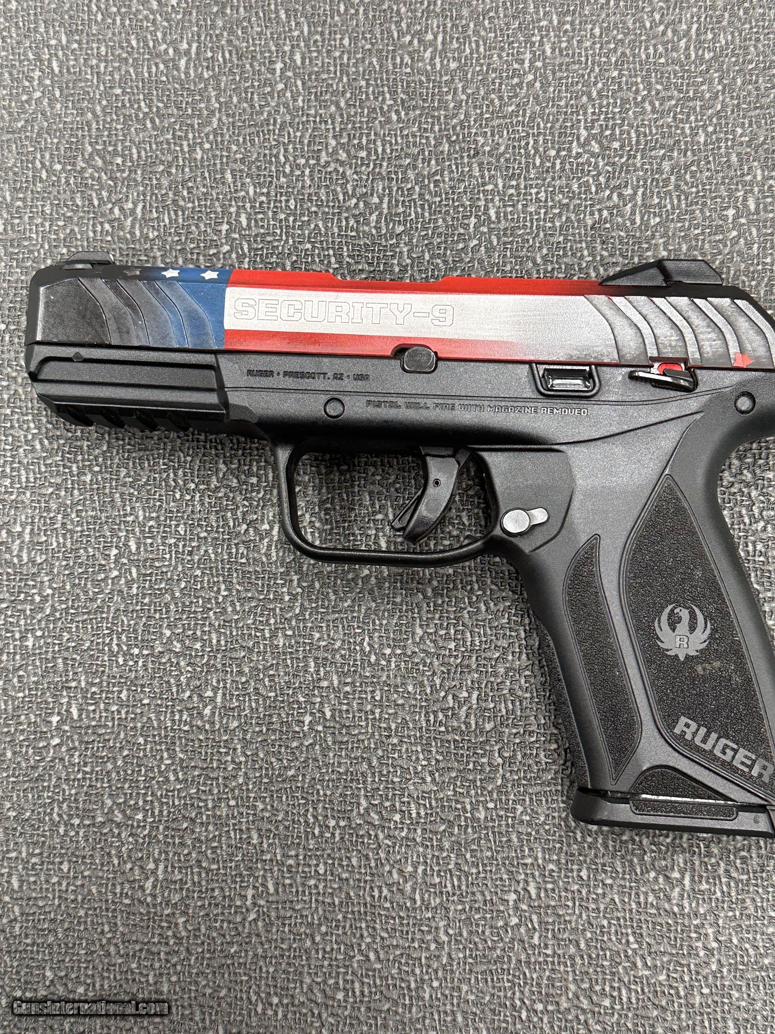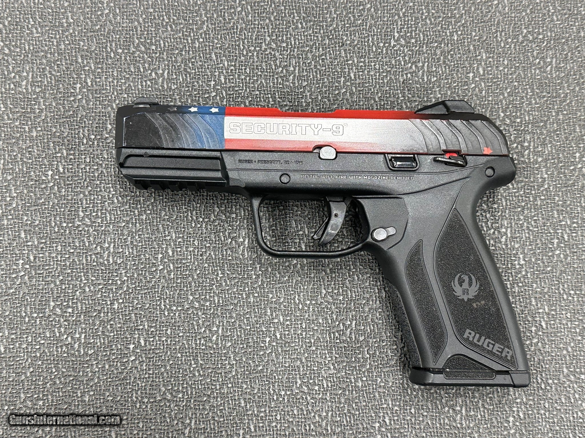 Description: Guns Listing ID: 1298382 Used Ruger Security 9 with American flag cerakote. Minor flaws. SOLD Manufacturer: RUGER Model: SECURITY 9 Caliber Info: 9MM LUGER (9X19 PARA) Condition: Used - Non-Certified Barrels: 4 BARREL Finish: AMERICAN FLAG/BLACK |