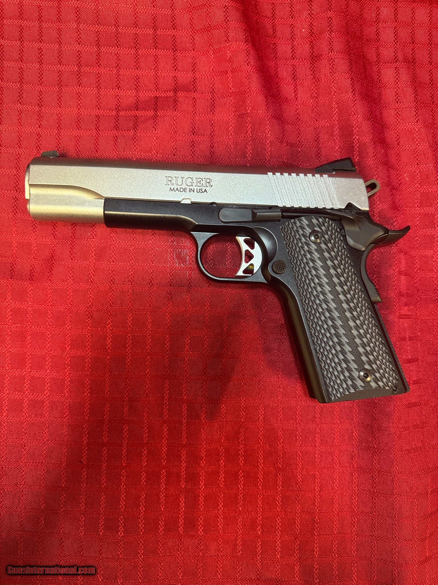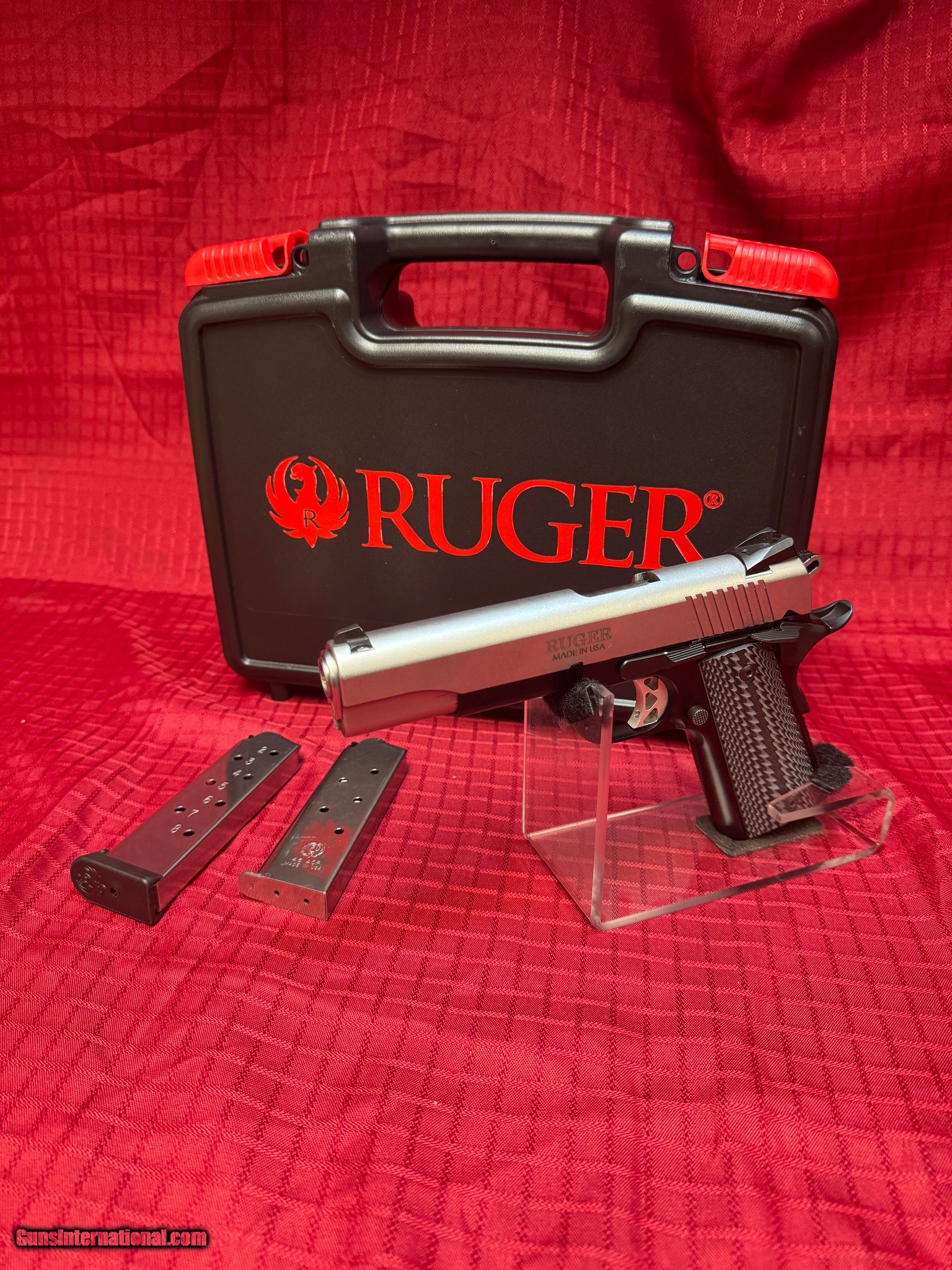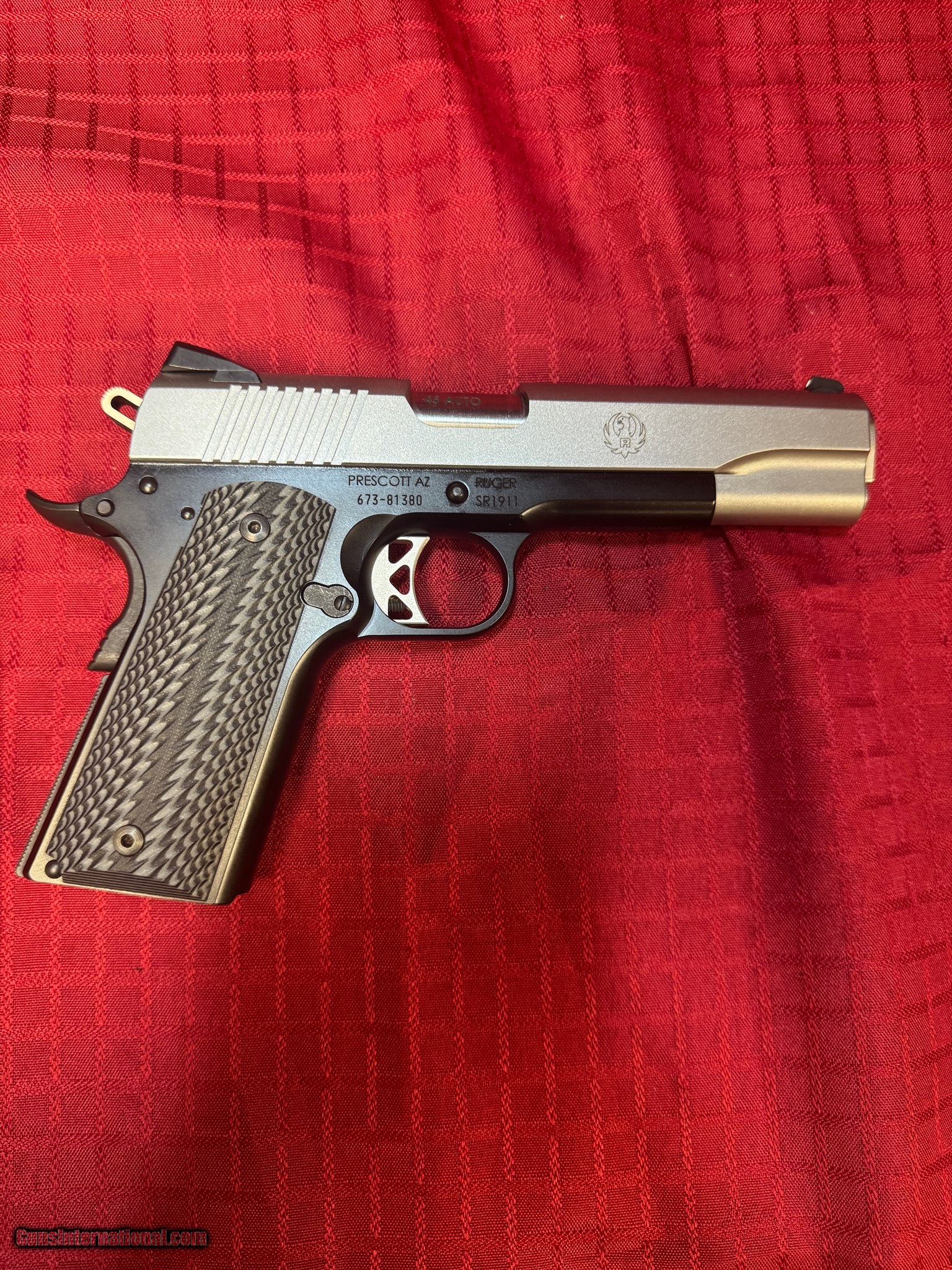Description: Guns Listing ID: 542502 RUGER SR1911 - .45 ACP - TWO 8 RD MAGAZINES - 5 \" BARREL, CASE The Ruger SR1911 in .45 ACP is a modern rendition of the classic 1911 pistol, known for its reliability and accuracy. It features a 5-inch stainless steel barrel and slide, with a black anodized aluminum frame (or all stainless steel for some models). The pistol boasts a crisp, single-action trigger pull and Novak-style 3-dot sights. It typically comes with hardwood or G10 grips and a checkered mainspring housing for a secure grip. LIKE NEW CONDITION!! Manufacturer: RUGER Model: SR1911 Caliber: .45ACP Magazines: TWO - 8 RD MAGAZINES Sights: FIXED Weight: 39 OZ Overall Length: 8.67\" Barrel Length: 5\" SERIAL NUMBER: 673-81380 SKU NUMBER: DJ1031537 SOLD Manufacturer: RUGER Model: SR1911 Caliber Info: .45 ACP Condition: Used - Non-Certified Barrels: 5" BARREL Action: SEMI AUTOMATIC Finish: black & silver |