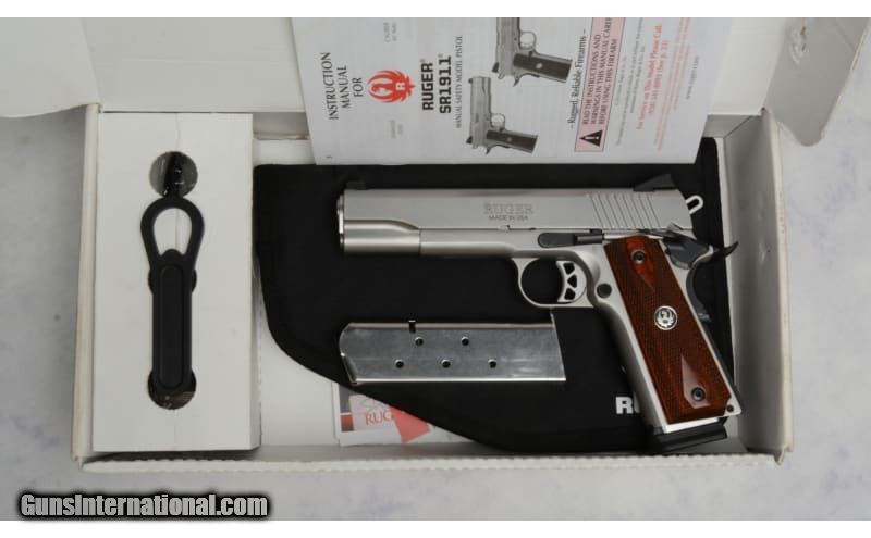 Description: This Ruger SR1911 features; 5" Barrel chambered in .45 Auto, Titanium Firing Pin, Skeletonized Hammer, Adjustable Skeletonized Aluminum Trigger, Drift Adjustable 3-Dot Sights, Oversized Beavertail Grip Safety & Extended Thumb Safety, and Hardwood Grips. Includes Factory Box, Soft Case, One (1) 8-Round Magazine, One (1) 7-Round Magazine, Retainer Wrench, and Manual. .45 Auto SOLD Chambers: .45 Auto Metal Condition: Excellent Wood Condition: Excellent Bore Condition: Excellent Barrels: 5 Sights: Drift Adjustable 3-Dot Item Location: Green Bay |