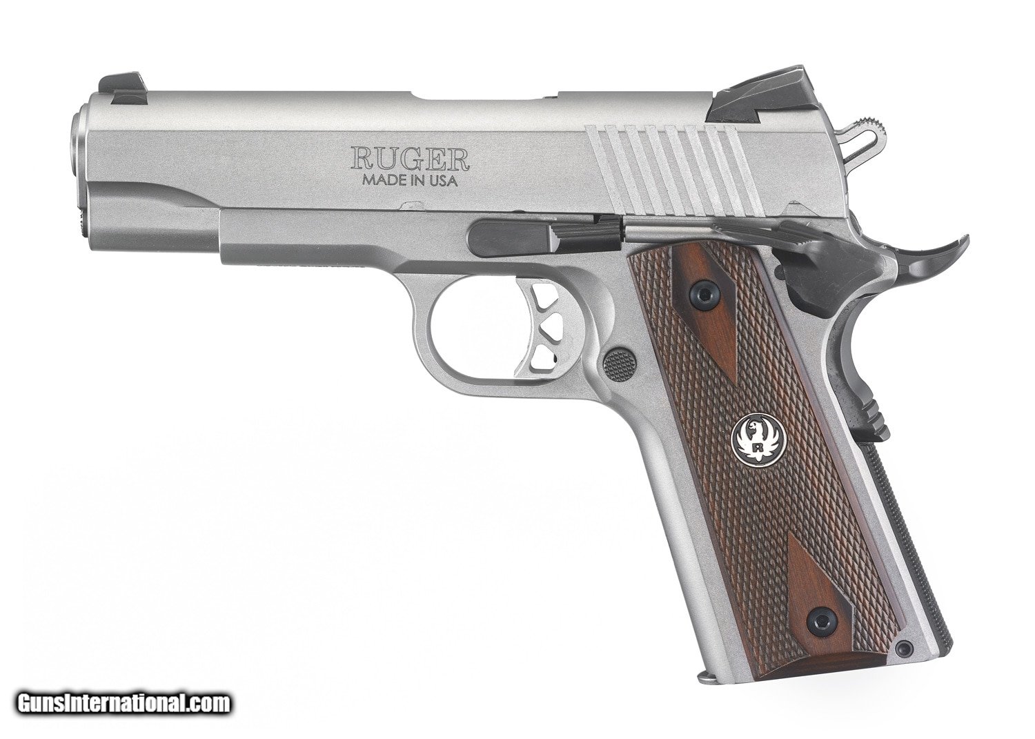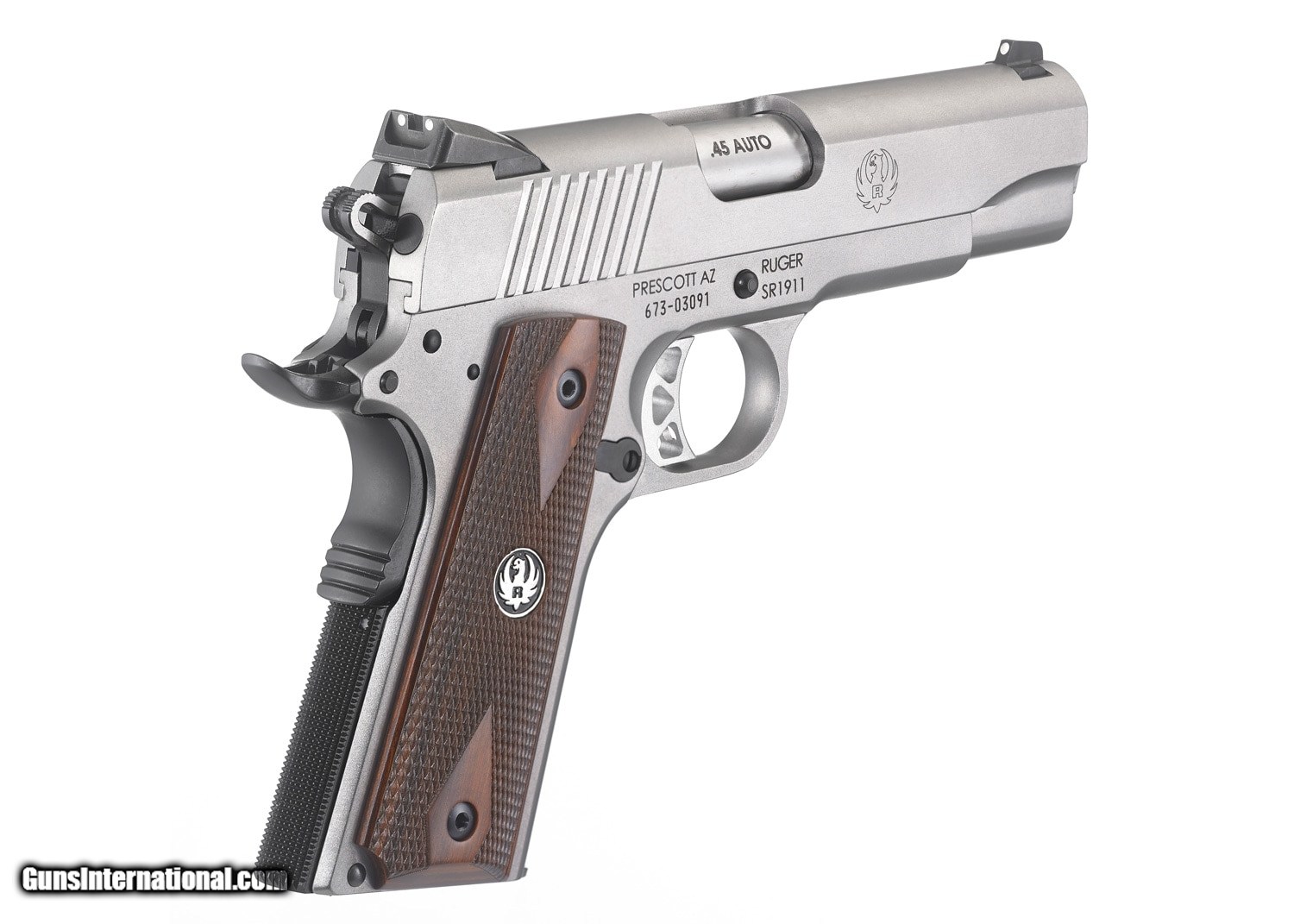 Description: Guns Listing ID: 53250 Modeled after the classic M1911, this Ruger SR1911 is chambered in 45 ACP and offers a winning combination with a lightweight aluminum frame, shorter barrel, and commander-length slide. This American-made pistol is crafted using CNC-controlled machining processes to ensure a superior slide-to-frame fit and smooth slide action. Other standard features include a beaver-tail grip safety, extended magazine release, oversized thumb safety, and a skeletonized hammer and trigger. An excellent option for personal defense, this pistol sports double diamond checkered hardwood grips work with the checkered mainspring housing to ensure a firm grasp with each shot fired. The SR1911 accepts most standard and aftermarket 1911 accessories. SOLD Manufacturer: RUGER Model: SR1911 COMMANDER-STYLE Caliber Info: .45 ACP Condition: new Barrels: 4.25 BARREL |