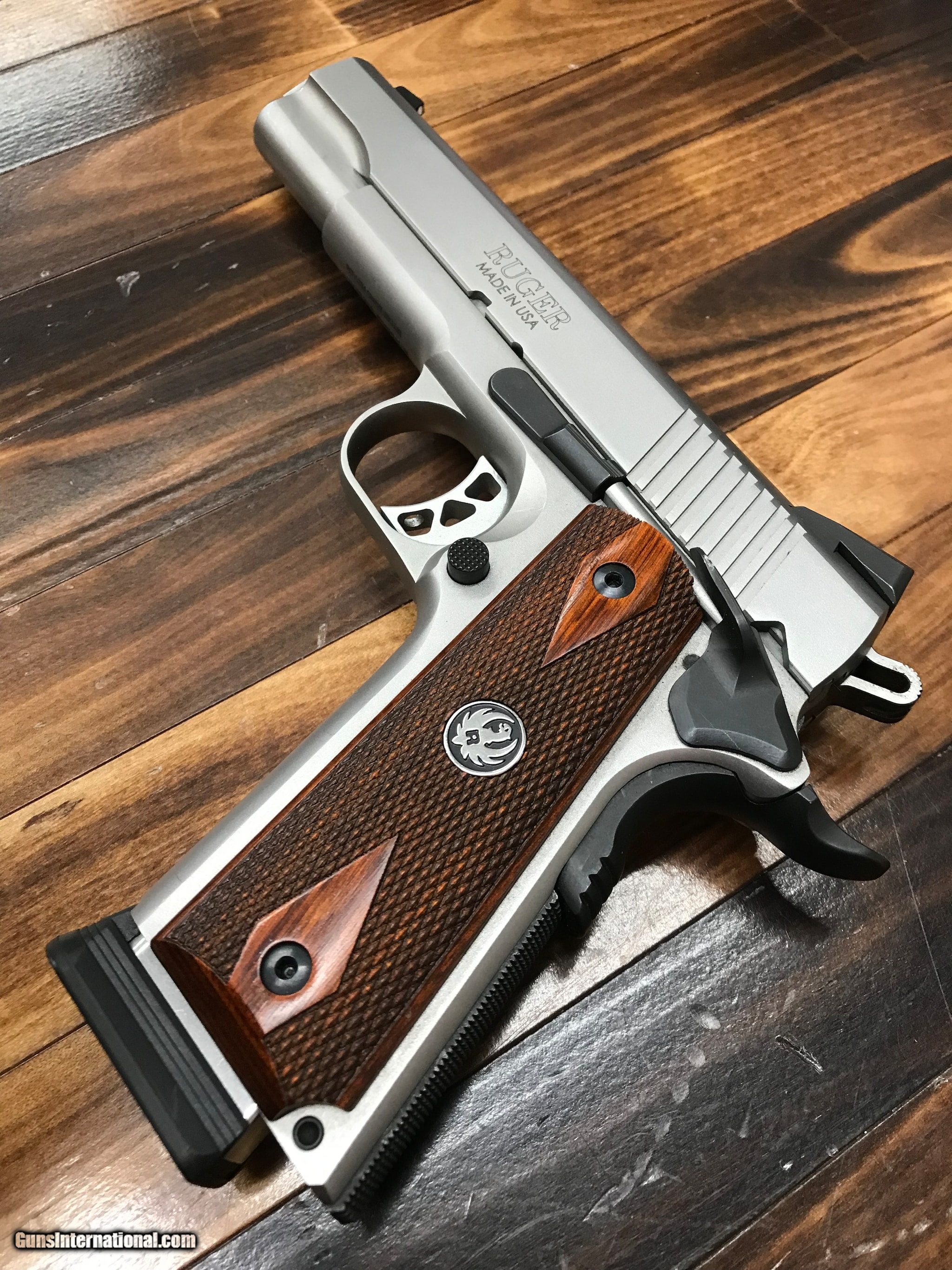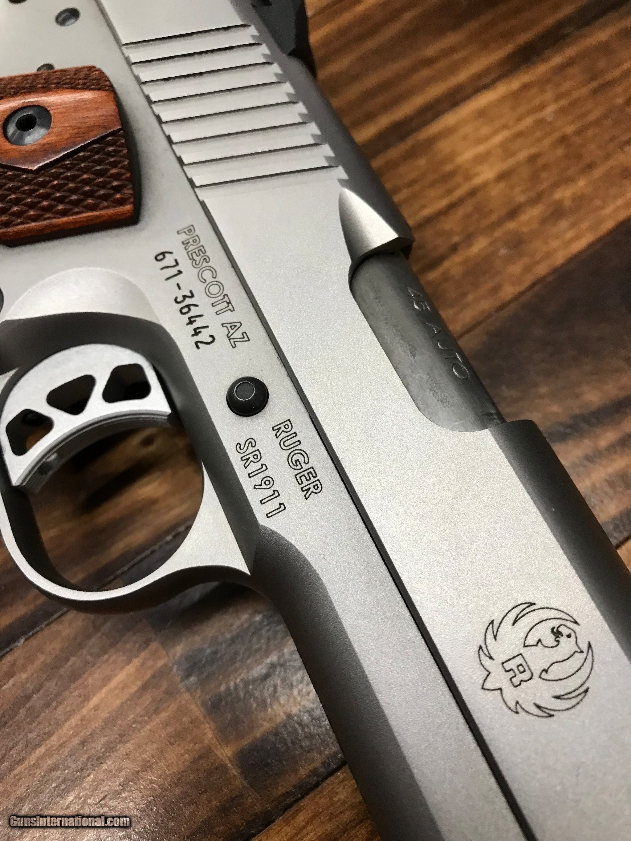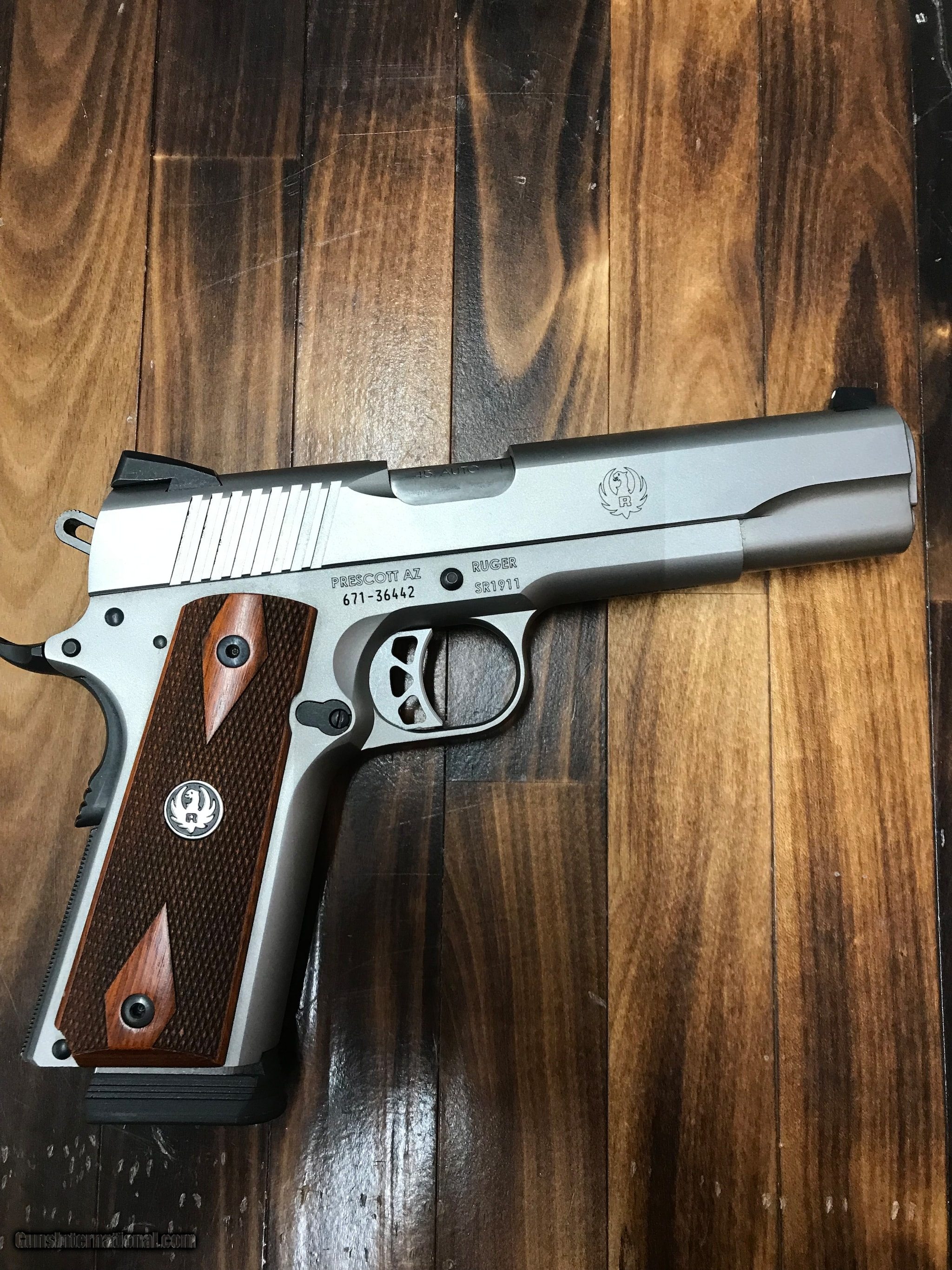 Description: Guns Listing ID: 1106789 This Ruger 1911 is not only reliable & accurate, but also slim, ergonomic & stylish. The brushed stainless hard-use 1911 features the grip safety, slide lock & thumb safety nicely contrasted in black. Modeled after the classic M1911, this American made pistol also features stunning double diamond checkered hardwood grips that work with the checkered mainspring housing to ensure a firm grasp with each shot fired, while also showcasing the classic Ruger emblem embellishment. With its well crafted, solid, dependable reliability, its no wonder its earned such a strong reputation as the working man‚‚s 1911. Comes in original box. See attached photos SOLD Manufacturer: RUGER Model: SR1911 STANDARD Caliber Info: .45 ACP Condition: Used - Non-Certified Barrels: 5 BARREL |