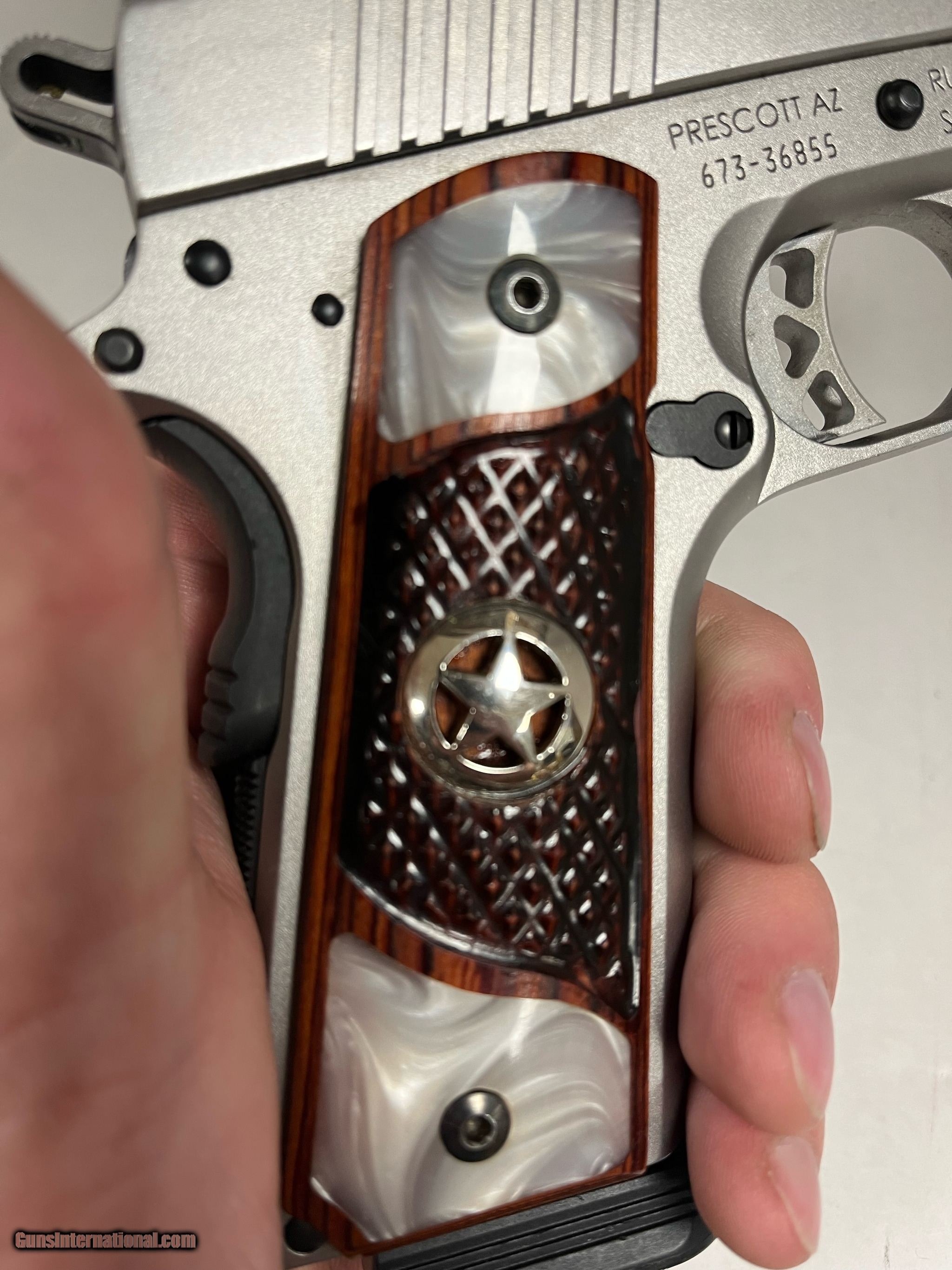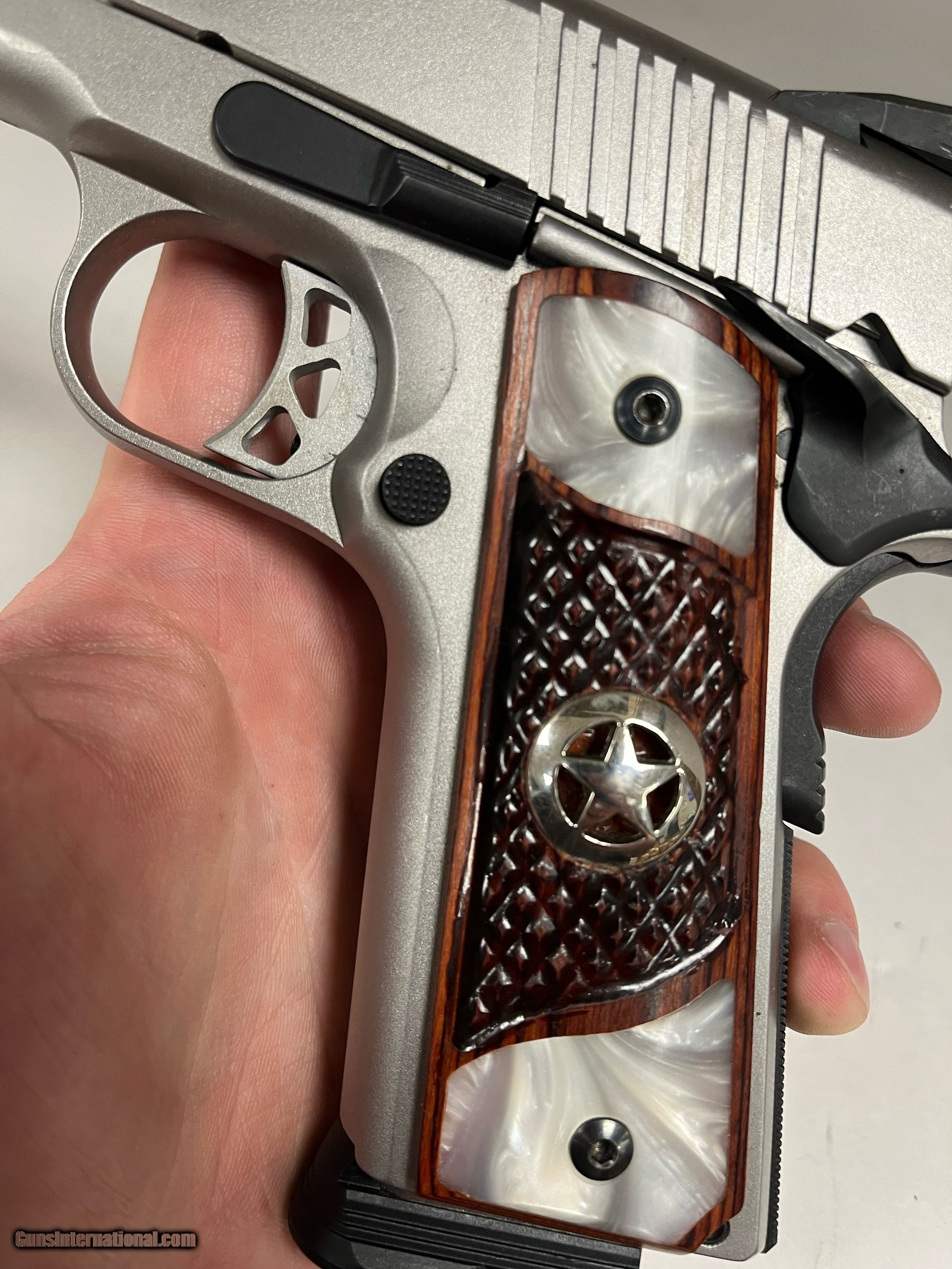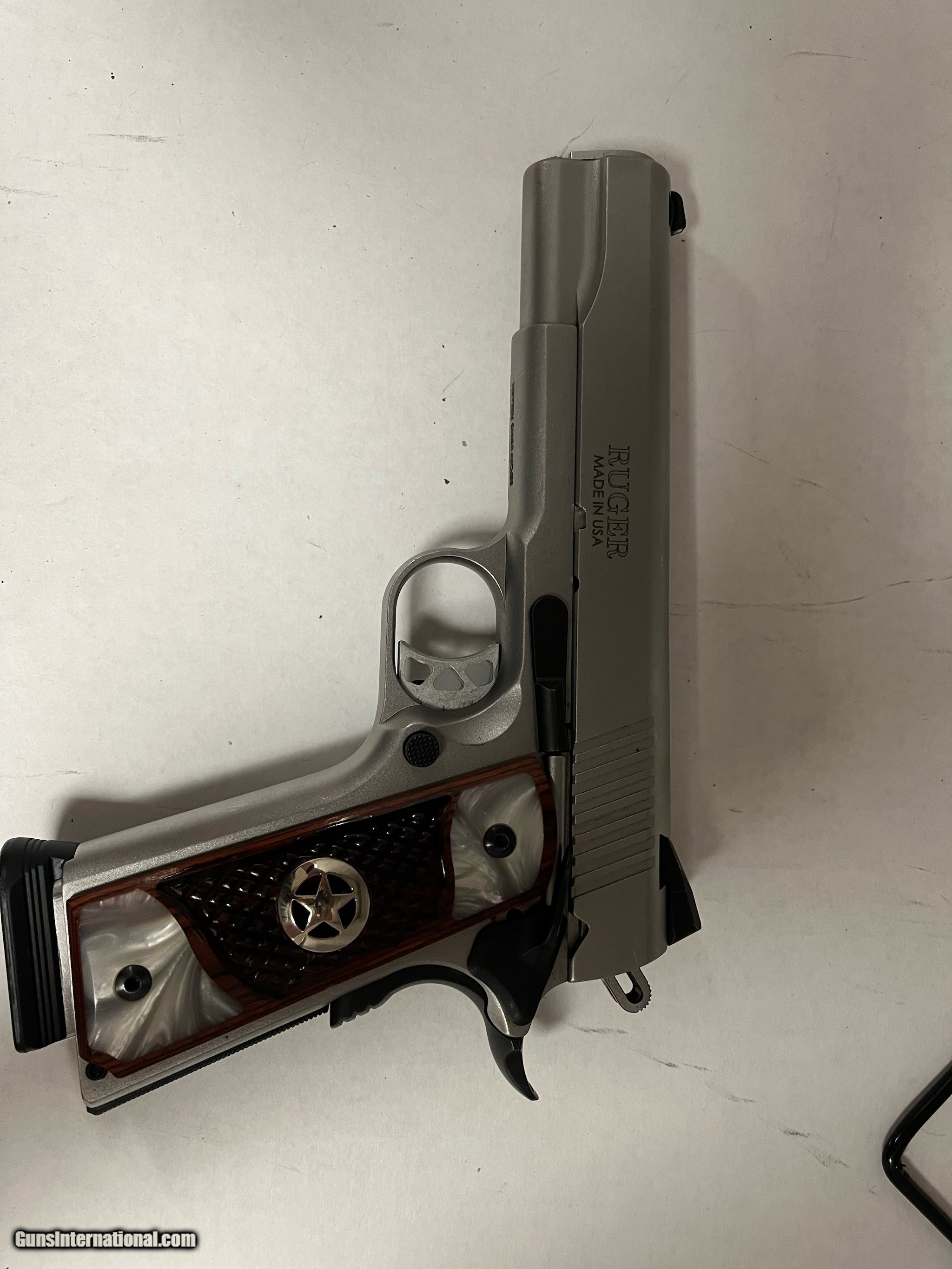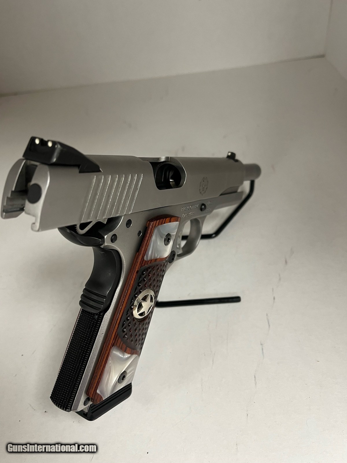 Description: Guns Listing ID: 519157 star appears to be re glued back in place on the right side SOLD Manufacturer: RUGER Model: SR1911 Caliber Info: 45 ACP Condition: Used - Non-Certified Barrels: 5 BARREL Finish: STAINLESS/WOOD GRIPS |