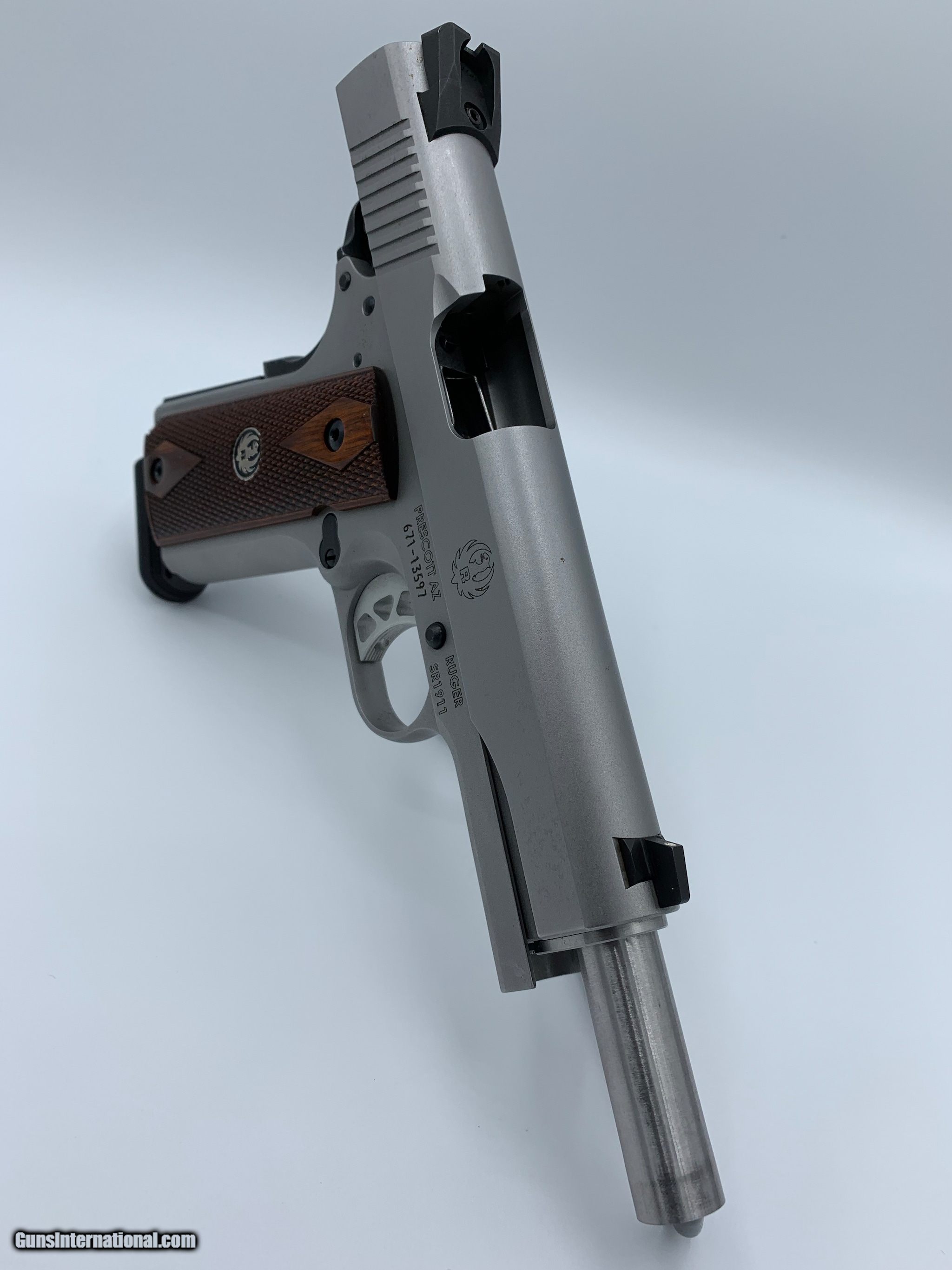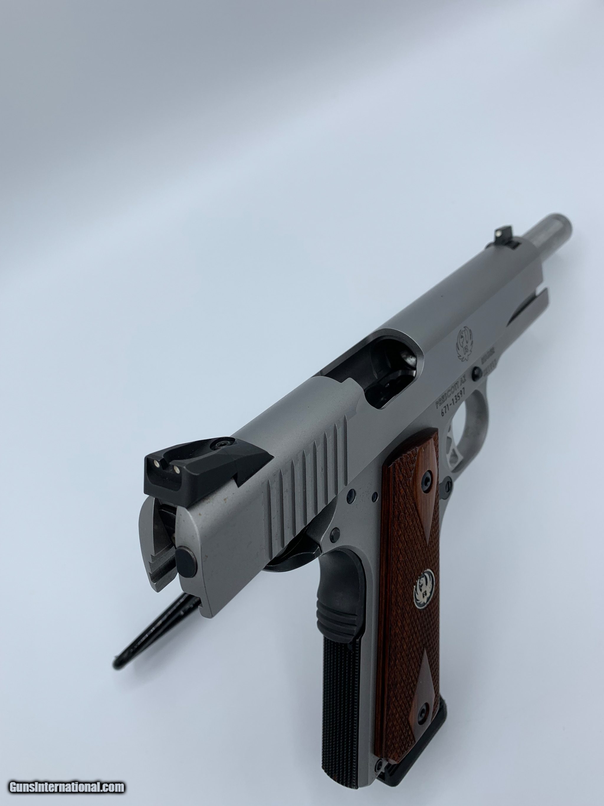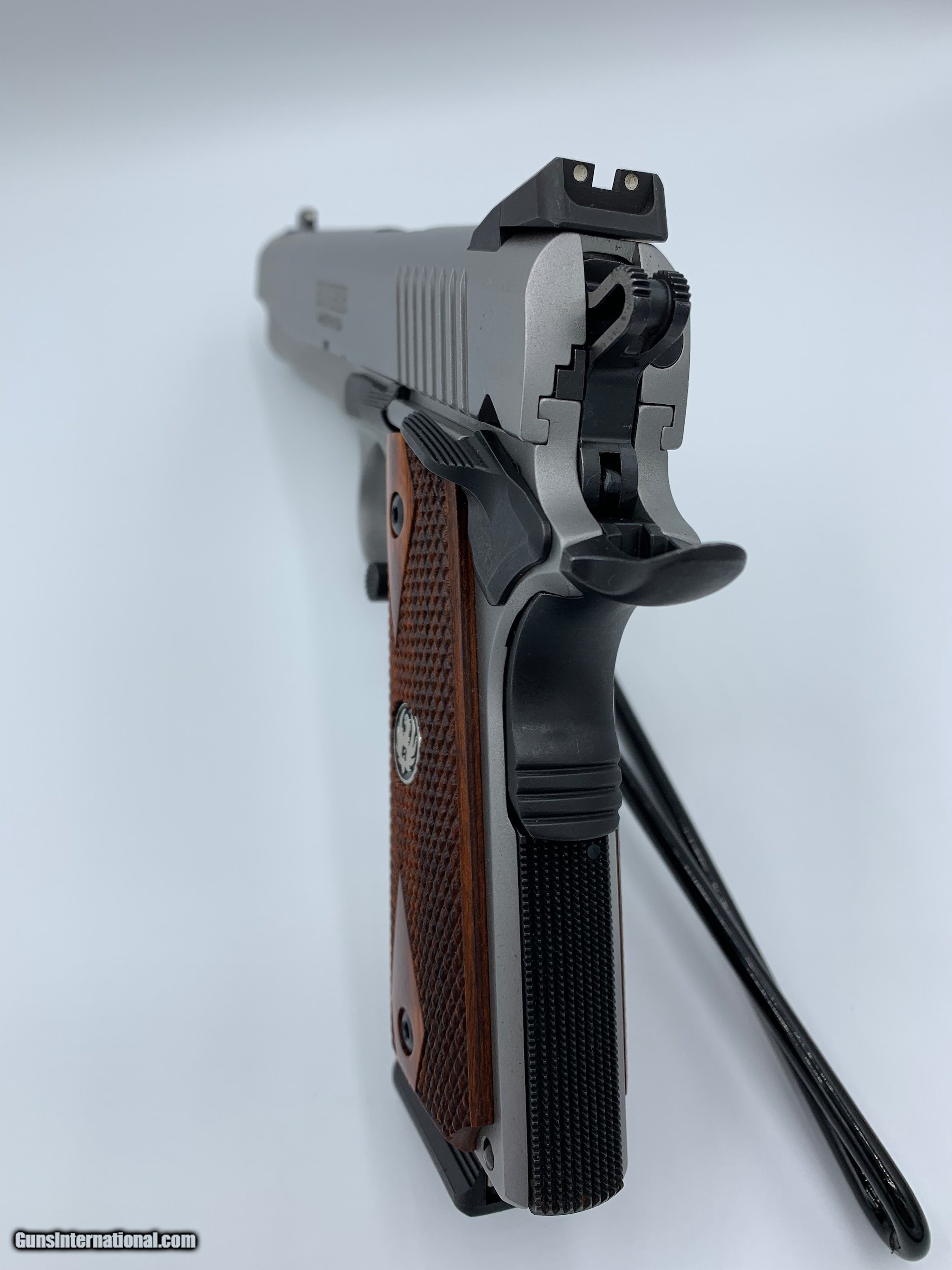 Description: Guns Listing ID: 733282 This is a preowned RUGER SR1911 45 auto pistol in VERY GOOD condition. Comes as pictured with 1 magazine and has minor cosmetic wear. Features and Benefits Semiautomatic action with an 8+1 magazine capacity 5\" low-glare stainless-steel barrel Low-glare stainless-steel grip frame Aluminum, skeletonized trigger with an adjustable over-travel stop and a skeletonized hammer Drift-adjustable Novak® 3-dot sights Oversize beavertail grip safety with an extended thumb safety Positive barrel lockup Oversize ejection port and an extended magazine release Serrated slide Visual inspection port Specifications Metal finish: Low-glare stainless Product weight: 39 oz. Manual Safety: Yes Barrel length (in.): 5 Handedness: Ambidextrous Product length (in.): 8.7 Front sight: Drift-adjustable Novak® 3-dot Magazine capacity: 8 Rear sight: Drift-adjustable Novak® 3-dot Caliber: .45 ACP I#0921586- EMM- WB SOLD Manufacturer: RUGER Model: SR1911 Caliber Info: .45 ACP Condition: Used - Non-Certified Barrels: 5 BARREL Finish: STAINLESS |