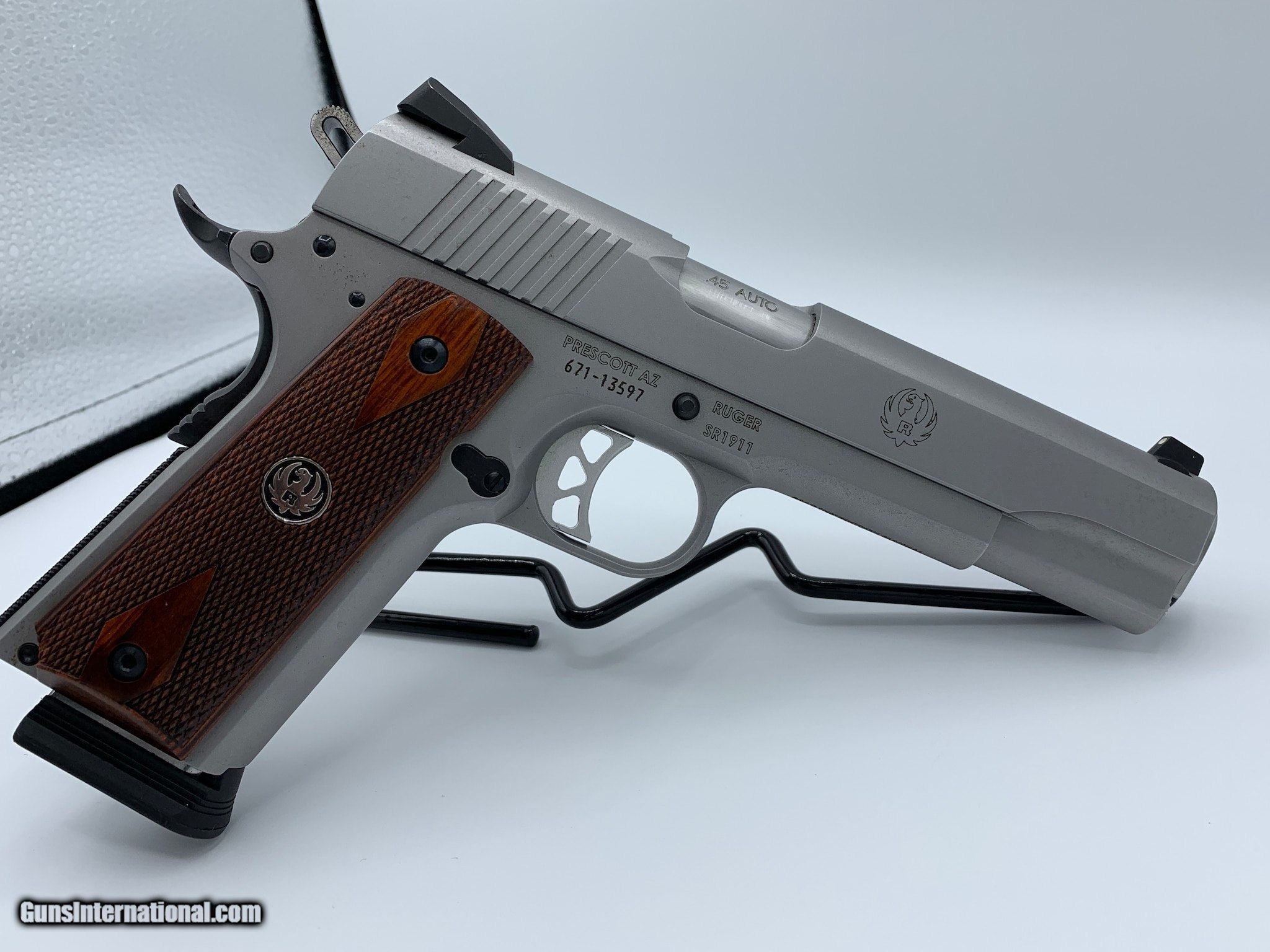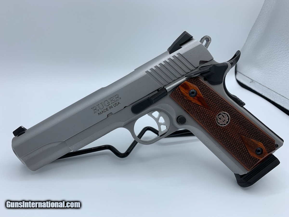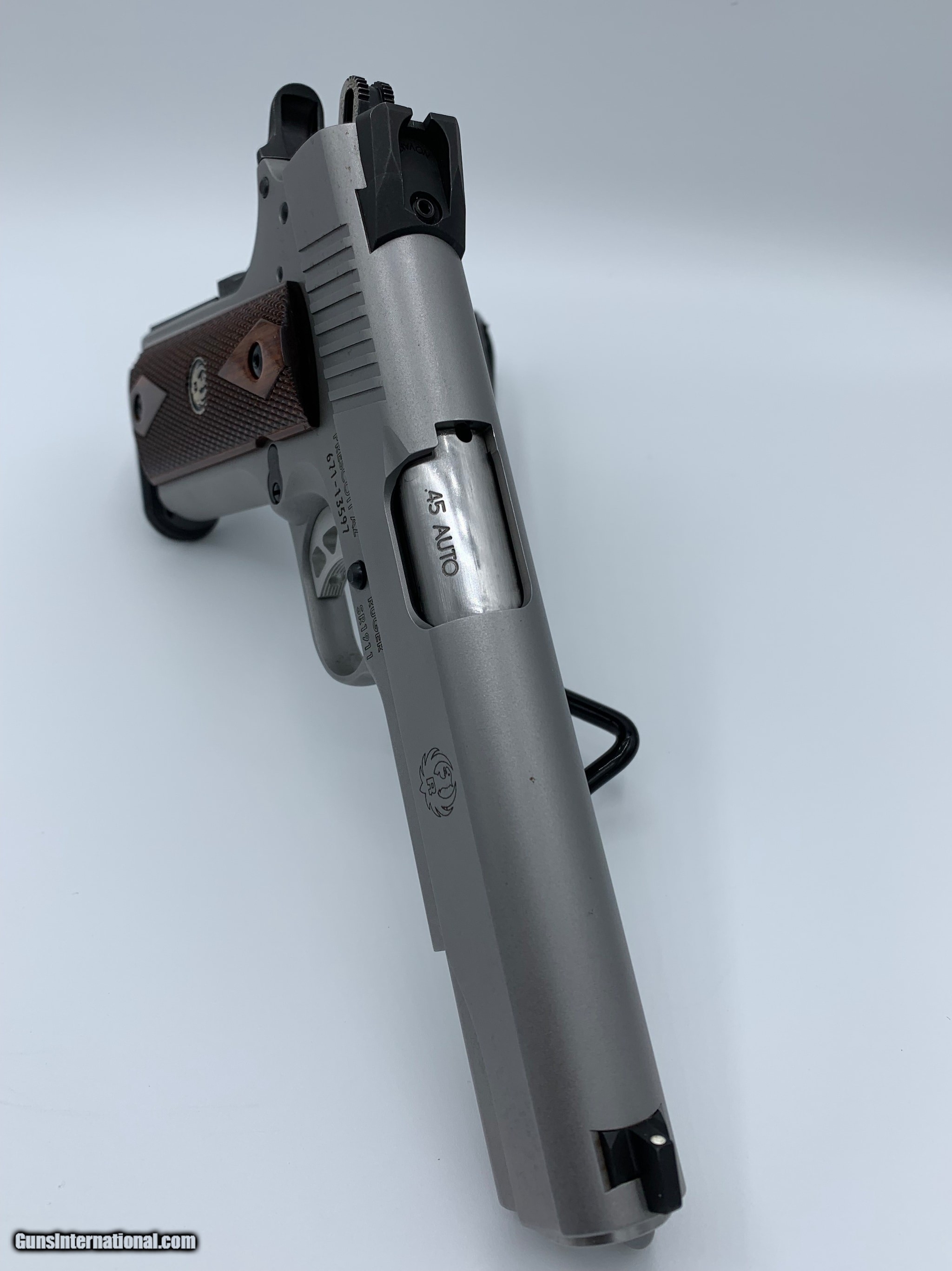 Description: Guns Listing ID: 733282 This is a preowned RUGER SR1911 45 auto pistol in VERY GOOD condition. Comes as pictured with 1 magazine and has minor cosmetic wear. Features and Benefits Semiautomatic action with an 8+1 magazine capacity 5\" low-glare stainless-steel barrel Low-glare stainless-steel grip frame Aluminum, skeletonized trigger with an adjustable over-travel stop and a skeletonized hammer Drift-adjustable Novak® 3-dot sights Oversize beavertail grip safety with an extended thumb safety Positive barrel lockup Oversize ejection port and an extended magazine release Serrated slide Visual inspection port Specifications Metal finish: Low-glare stainless Product weight: 39 oz. Manual Safety: Yes Barrel length (in.): 5 Handedness: Ambidextrous Product length (in.): 8.7 Front sight: Drift-adjustable Novak® 3-dot Magazine capacity: 8 Rear sight: Drift-adjustable Novak® 3-dot Caliber: .45 ACP I#0921586- EMM- WB SOLD Manufacturer: RUGER Model: SR1911 Caliber Info: .45 ACP Condition: Used - Non-Certified Barrels: 5 BARREL Finish: STAINLESS |