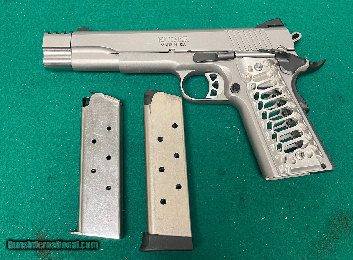 Description: Guns Listing ID: 740373 COMES WITH 2 MAGS NO BOX HAS CUSTOM GRIPS AND COMP SOLD Manufacturer: RUGER Model: SR1911 Caliber Info: .45 ACP Condition: Used - Non-Certified Barrels: 4.75 BARREL Finish: STAINLESS |