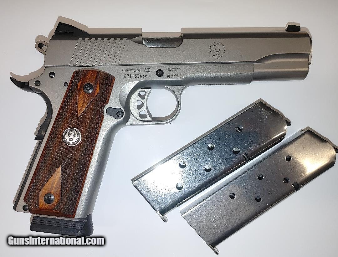 Description: Guns Listing ID: 688126 Ruger, SR1911, 1911, Semi-automatic, Metal Frame Pistol, Full Size, 45 ACP, 5\" Barrel, Stainless Steel, Low-Glare Stainless Finish, Hardwood Grips, Drift Adjustable Novak 3 Dot Sights, 8 Round, 3 Mags. Low-Glare stainless finish Classic, original 1911 Series 70 design Oversized beavertail grip Novak 3-dot sights Thumb safety SOLD Manufacturer: RUGER Model: SR1911 Caliber Info: 45 ACP Condition: Used - Non-Certified Barrels: 5 BARREL Finish: STAINLESS |