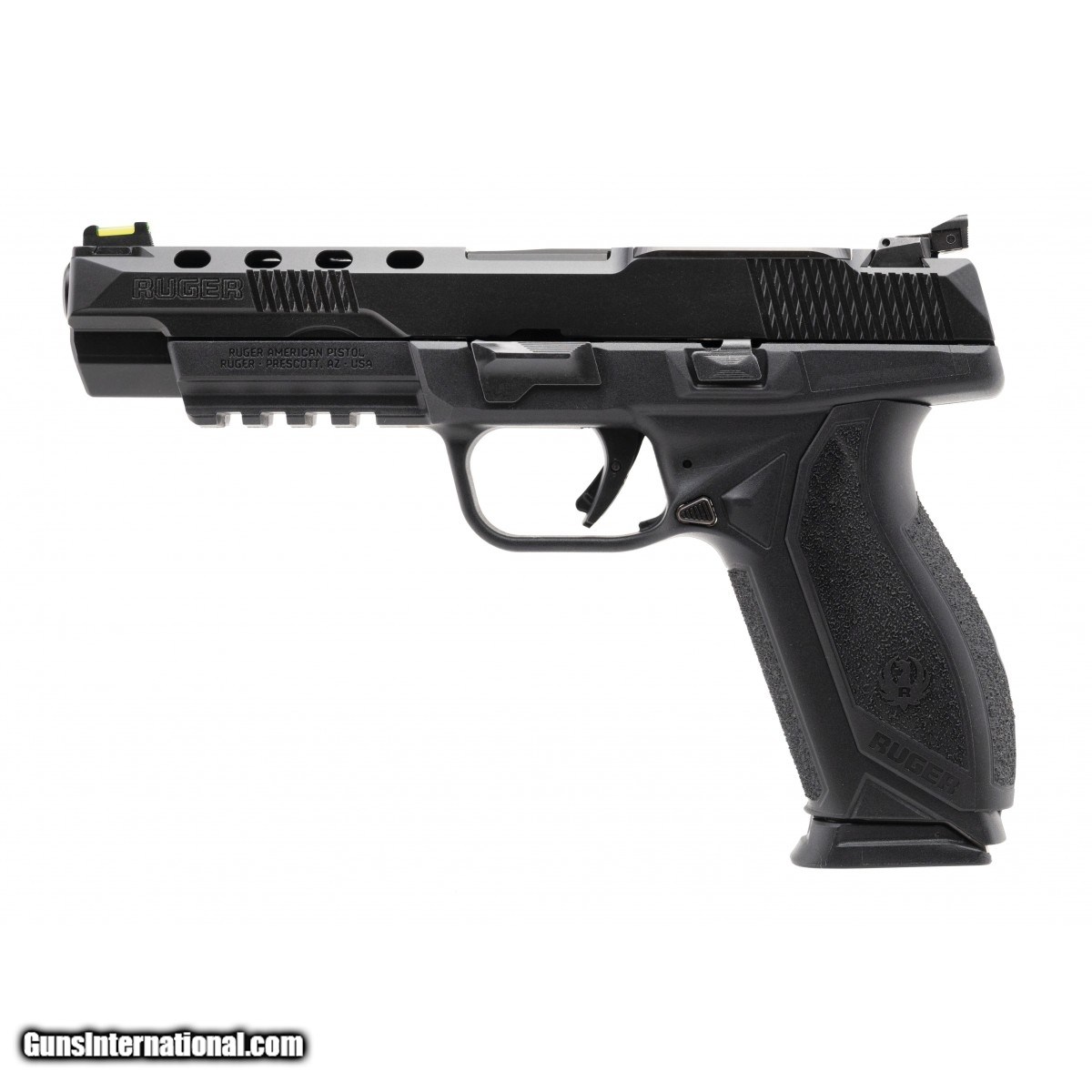 Description: " Ruger, american, striker fired, semi-automatic, polymer frame pistol, competition, 9mm, 5"" barrel, black nitride finish, fiber optic front and adjustable rear sights, integrated trigger safety, 17 rounds, 2 magazines, ported slide. NEW UPC: 736676086726 SOLD |