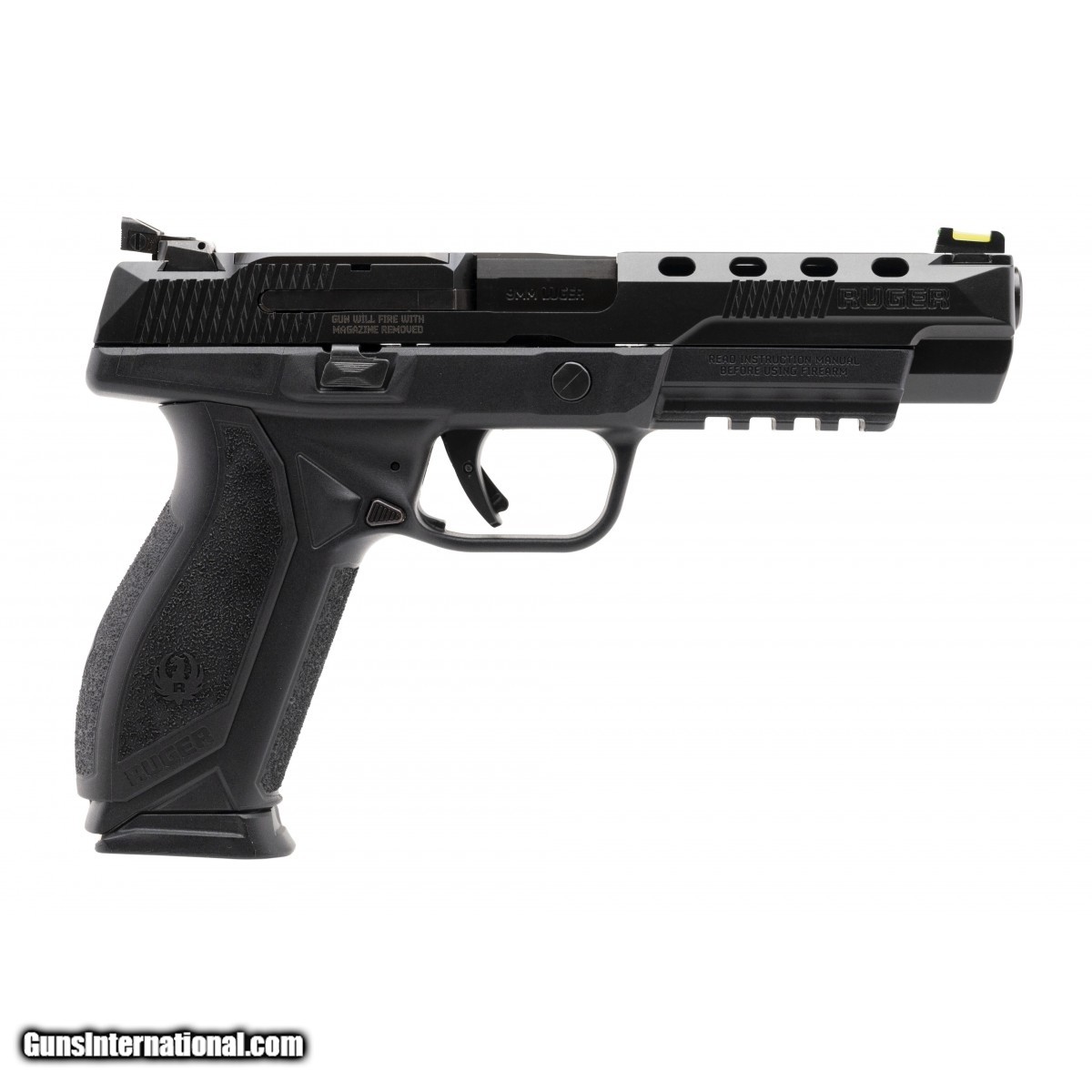 Ruger, american, striker fired, semi-automatic, polymer frame pistol, competition, 9mm, 5"" barrel, black nitride finish, fiber optic front and adjustable rear sights, integrated trigger safety, 17 rounds, 2 magazines, ported slide. NEW UPC: 736676086726