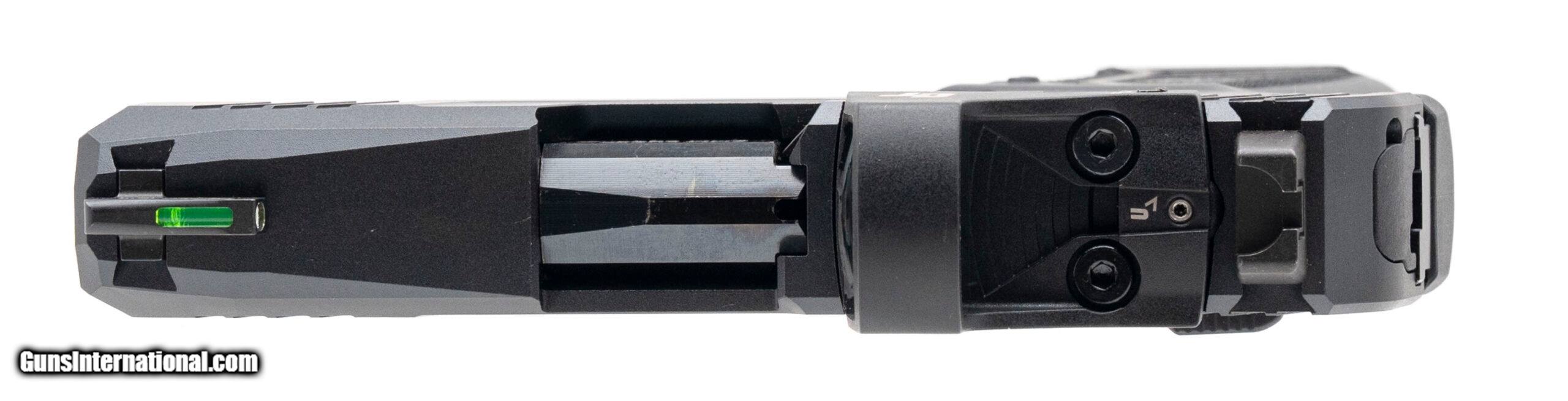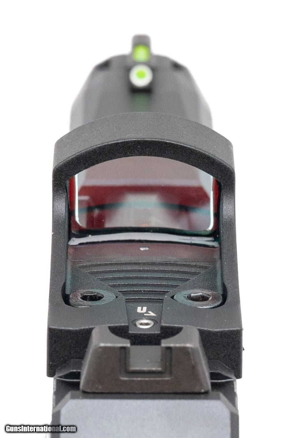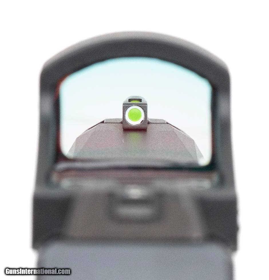 Description: "SN: 350067000. Modern production, 9mm with a 3.2"" barrel. Bore is excellent. Sub-compact striker-fired pistol with a Crimson Trace red dot optic, co-witnessed tritium fiber-optic front sight, manual thumb safety, blued finish, and black polymer frame. Includes an additional magazine, and original box. Overall condition is excellent. SOLD |