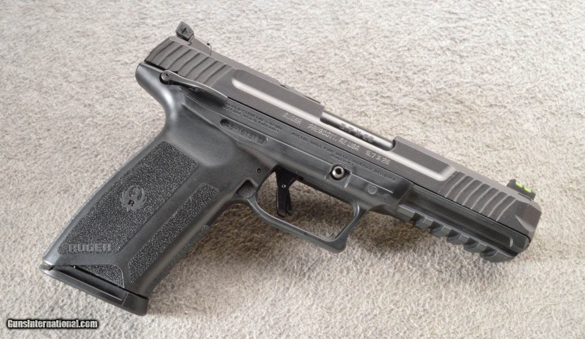 Description: Lightly used Ruger 57 chambered in 5.7x28mm. This gun features a 1911-style ambidextrous manual safety, right side slide release, reversible magazine release latch, slide is tapped for an optics adapter plate "not included". The rear sight is a serrated square notch that is windage and elevation adjustable, and the front sight is fiber optic. Comes with a factory Ruger hard case, manual, safety lock, 2 (20rd) factory ruger magazines. 5.7X28mm SOLD Chambers: 20+1 semi auto. Metal Condition: 99%. Bore Condition: Excellent bright bore with strong rifling. Triggers: Single. Weight: 1.5 lbs Sights: "Fiber optic, adjustable. Item Location: Hammond, IN |
