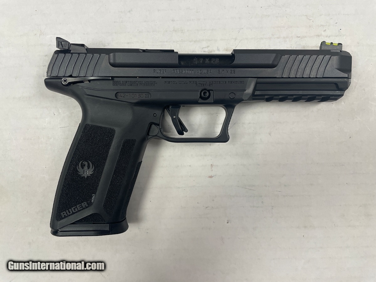 Description: Guns Listing ID: 919585 Ruger, 57, Double Action, Semi-automatic, Polymer Frame Pistol, Full Size, 5.7X28MM, 4.94\" Barrel, Black Oxide Finish, Fiber Optic Front and Adjustable Rear Sights, Ambidextrous Manual Safety, 20 Rounds, 2 Magazines, Ambidextrous Billet Steel Slide with Lightening Cuts Adjustable Rear Sight Ambidextrous Manual Safety Product Description The Ruger 57 utilizes Ruger‚‚s safe, reliable and proven Secure Action fire-control system that combines a protected internal hammer with a bladed-safety trigger. The trigger has a short, smooth pull, clean break and positive reset. Impressive ergonomics include an easy trigger reach, 1911-style ambidextrous manual safety, robust slide release and reversible magazine release latch. The alloy steel barrel features a black nitride treatment for wear resistance. Specifications UPC 736676164011 Manufacturer Ruger Manufacturer Part # 16401 Model 57 Action Semi-automatic Type Double Action Size Full Size Caliber 5.7X28MM Barrel Length 4.94\" Color Black Grips Textured Capacity 20 Rounds Accessories 2 Mags Safety Ambidextrous Sights Fiber Front & Adjustable Rear Sights Subcategory Pistols - Polymer Frame Material Polyme SOLD Manufacturer: RUGER Model: 57 Caliber Info: 5.7X28MM Condition: Used - Non-Certified Barrels: 4.94 BARREL |