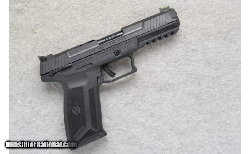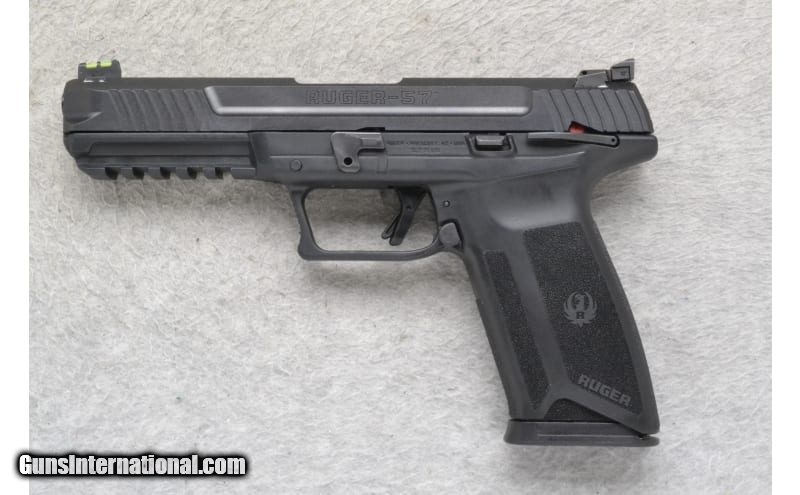 Description: This Ruger Model 57 is a right hand semi-auto pistol in 5.7x28mm Cal. It has a 5 inch barrel with front and rear slide serrations. There is a green high visibility dot front sight, adjustable notch rear sight and ambidextrous safety. The grip is textured black polymer. It has a lower accessory rail. 5.7X28mm SOLD Chambers: 20 round detachable magazine Metal Condition: Excellent with handling marks Bore Condition: Excellent Barrels: 5 inches Weight: 26 ounces Sights: Green high visibility front sight and adjustable notch rear sight Item Location: Richfield, WI |