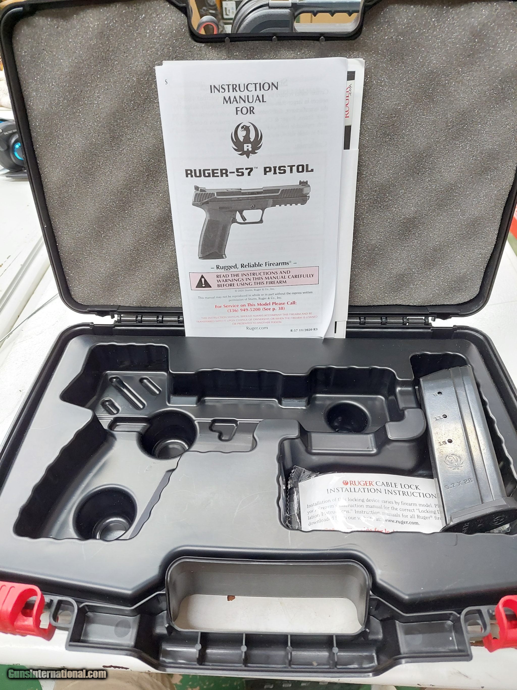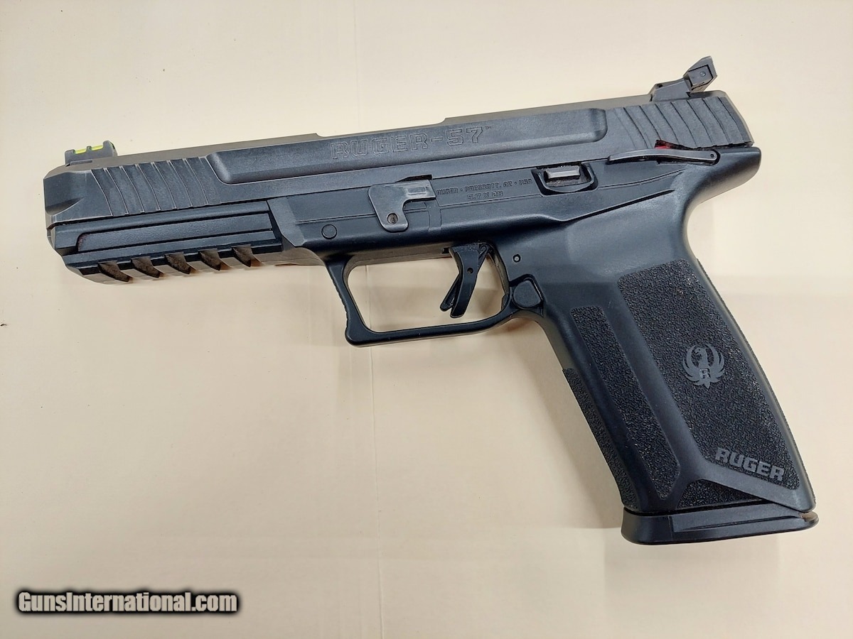 Description: Guns Listing ID: 699986 Caliber: 5.7x28mm Model: Ruger-5.7 Capacity: 20+1 Action: Double Action Only Frame Finish: Black Overall Length: 8.65\" Frame Material: Polymer Hand: Right Slide Finish: Black Oxide Slide Material: Steel Slide Description: Serrated Black Oxide Steel Grips: Black Polymer Sight Configuration: Fiber Optic Front / Adj Rear Includes: 2 Magazines Safety: Ambidextrous Manual Barrel Description: Black Nitride Finish Barrel Length: 4.94\" Max Capacity: 20 Weight: 24.50 oz Frame Description: Polymer Frame w / Picatinny Rail This pistol is used but in very good condition. Comes with the original box. SOLD Manufacturer: RUGER Model: 57 Caliber Info: 5.7X28MM Condition: Used - Non-Certified Barrels: 4.94 BARREL |
