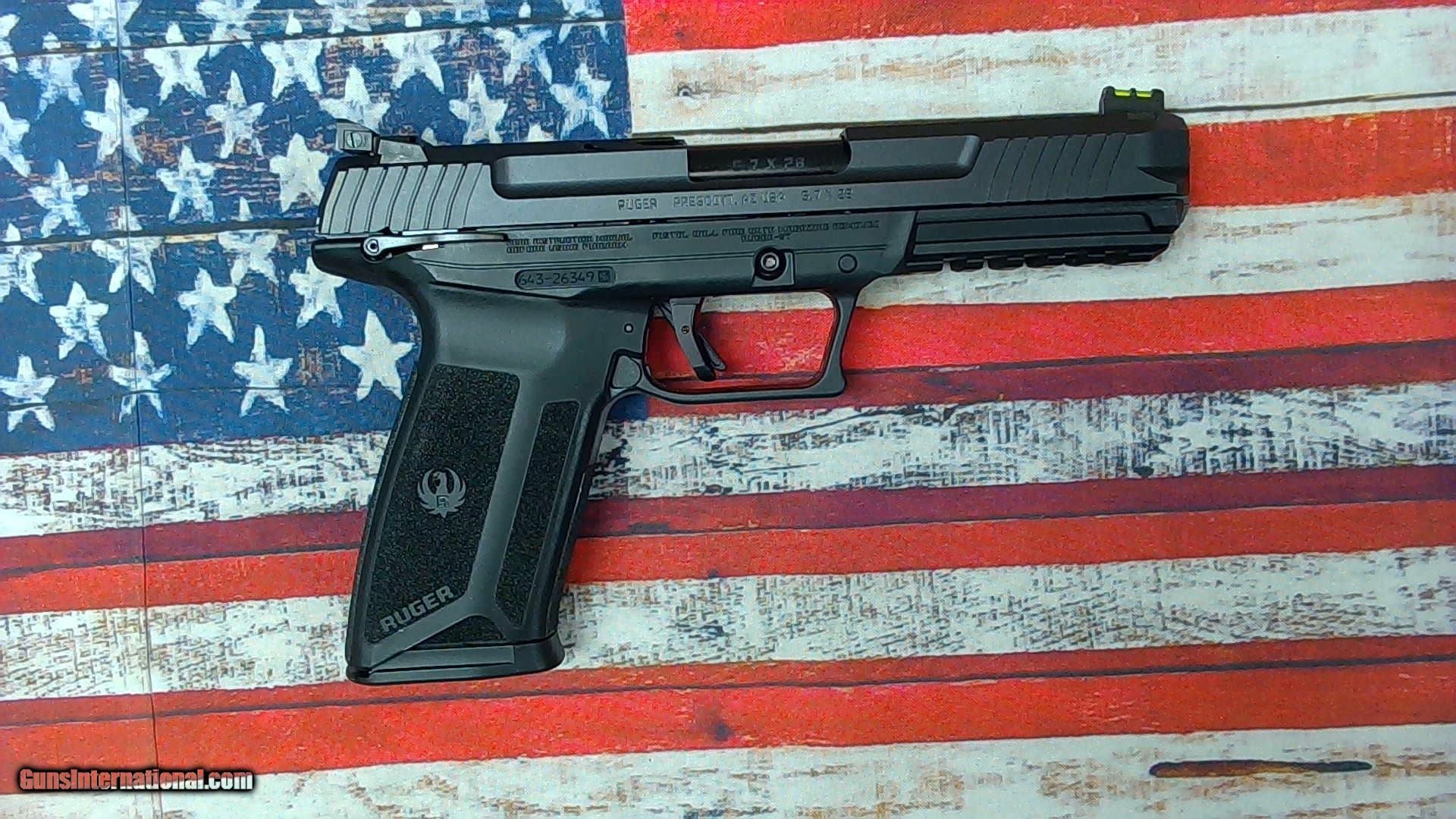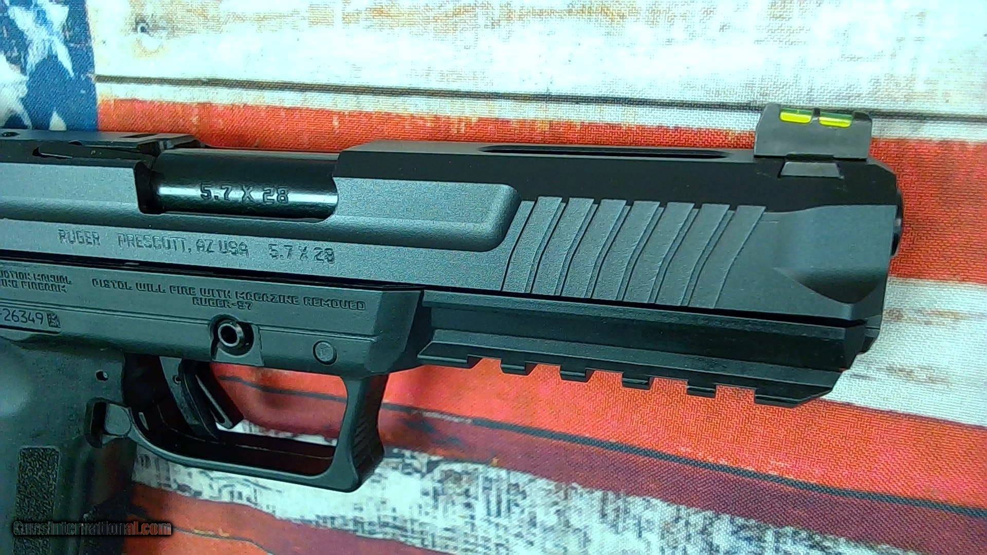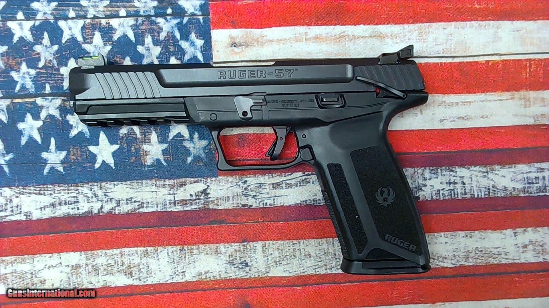 Description: Guns Listing ID: 700411 Very good condition - light wear. The Ruger-5.7, Chambered in the high performance and low-recoiling 5.7x28mm caliber, this ergonomic, smooth shooting and accurate pistol is as full-featured as they come. This model includes a 4.94\" barrel, manual thumb safety, adjustable fiber-optic sights, a full sized picatinny rail, and two 20 round magazines. MANUFACTURER: Ruger FAMILY: 57 Series MODEL: Ruger-57 Pistol TYPE: Semi-Auto Pistol ACTION: Double Action Only CALIBER/GAUGE: 5.7 x 28mm FINISH: Black Oxide FINISH TYPE: Black FRAME: Polymer Frame BARREL: 4.94\" OVERALL LENGTH: 8.65\" DRILLED / TAPPED RATE-OF-TWIST: 1-in-9 CAPACITY: 20 + 1 # OF MAGAZINES: 2 MAG DESCRIPTION: 20 rd. Steel Magazines SIGHTS: FS: Fiber Optic/RS: Adjustable SIGHT TYPE: Adjustable Sights WEIGHT: 24.5 oz. SHIPPING WEIGHT: 3.65 lbs. SAFETY FEATURES: 1911-Style Ambi Manual Safety ADDL INFO: Visual Inspection Port ADDL INFO: Picatinny-Style Accessory Rail ADDL INFO: Reversible Magazine Release MFG MODEL NO: 16401 UPC: 736676164011 SOLD Manufacturer: RUGER Model: 57 Caliber Info: 5.7X28MM Condition: Used - Non-Certified Barrels: 4.94" barrel |