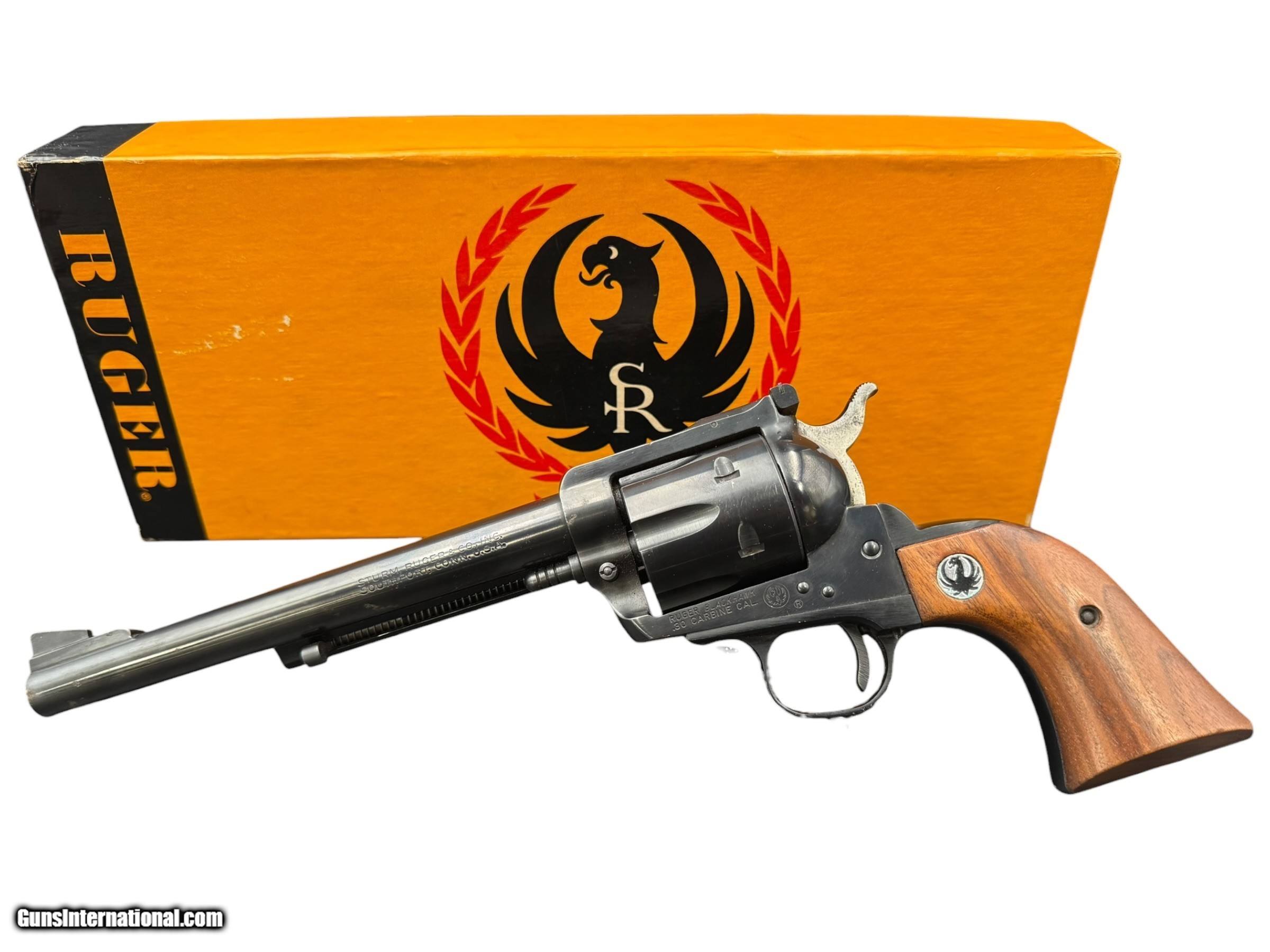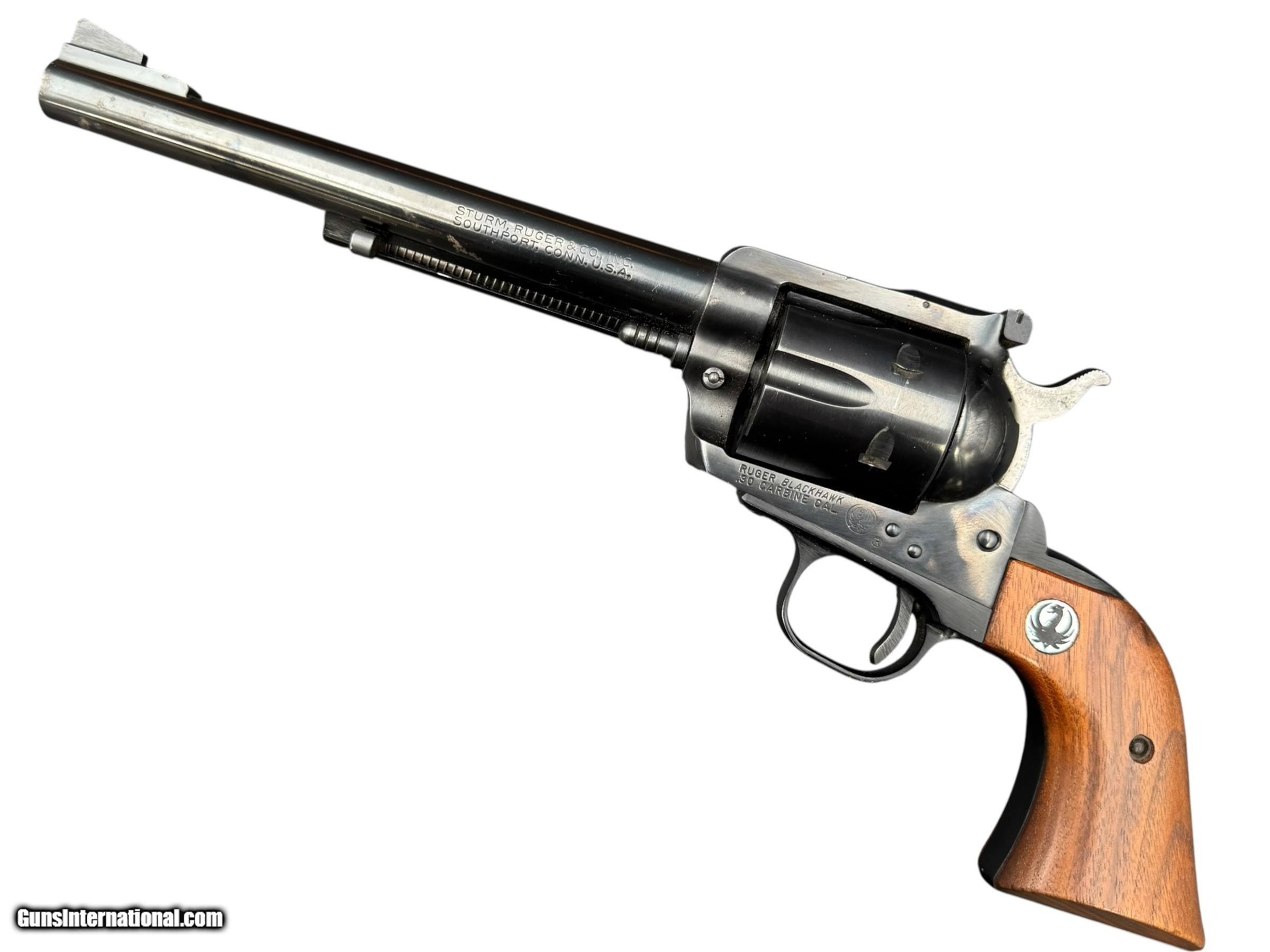 Description: Ruger Blackhawk single-action revolver chambered in .30 Carbine, featuring the desirable 7.5" barrel and classic blued steel finish paired with factory wood grips bearing the Ruger medallions. This revolver is built on Ruger’s robust Blackhawk frame and is known for its strength, accuracy, and smooth single-action trigger pull. The .30 Carbine chambering delivers flat trajectory and impressive velocity, making this a unique and fun revolver for the range or a standout addition to any Ruger or single-action collection. Finish shows honest wear consistent with use, with clear markings, clean lines, and solid lockup. Bore is shiny. A very sharp example overall. Features & Details