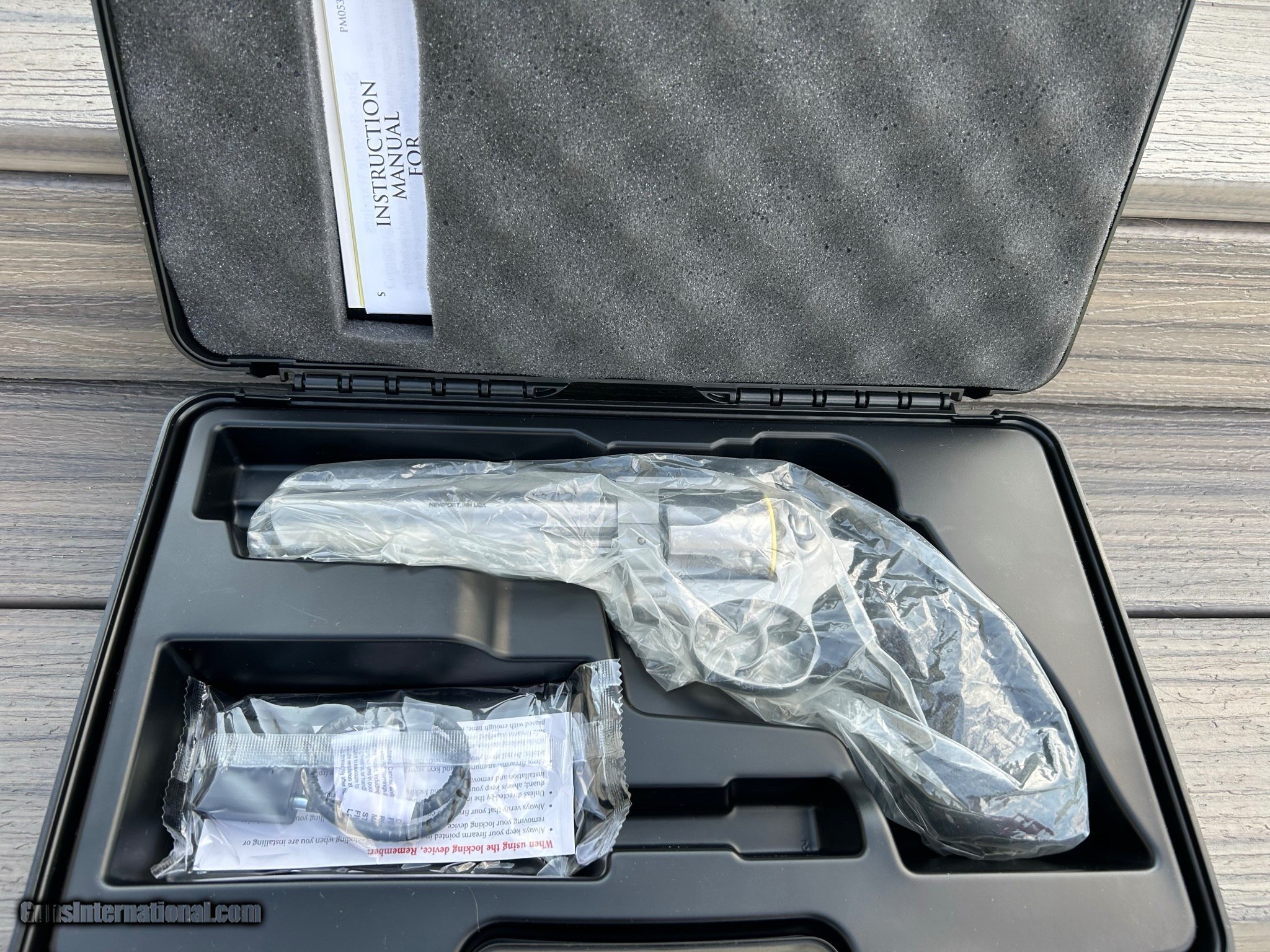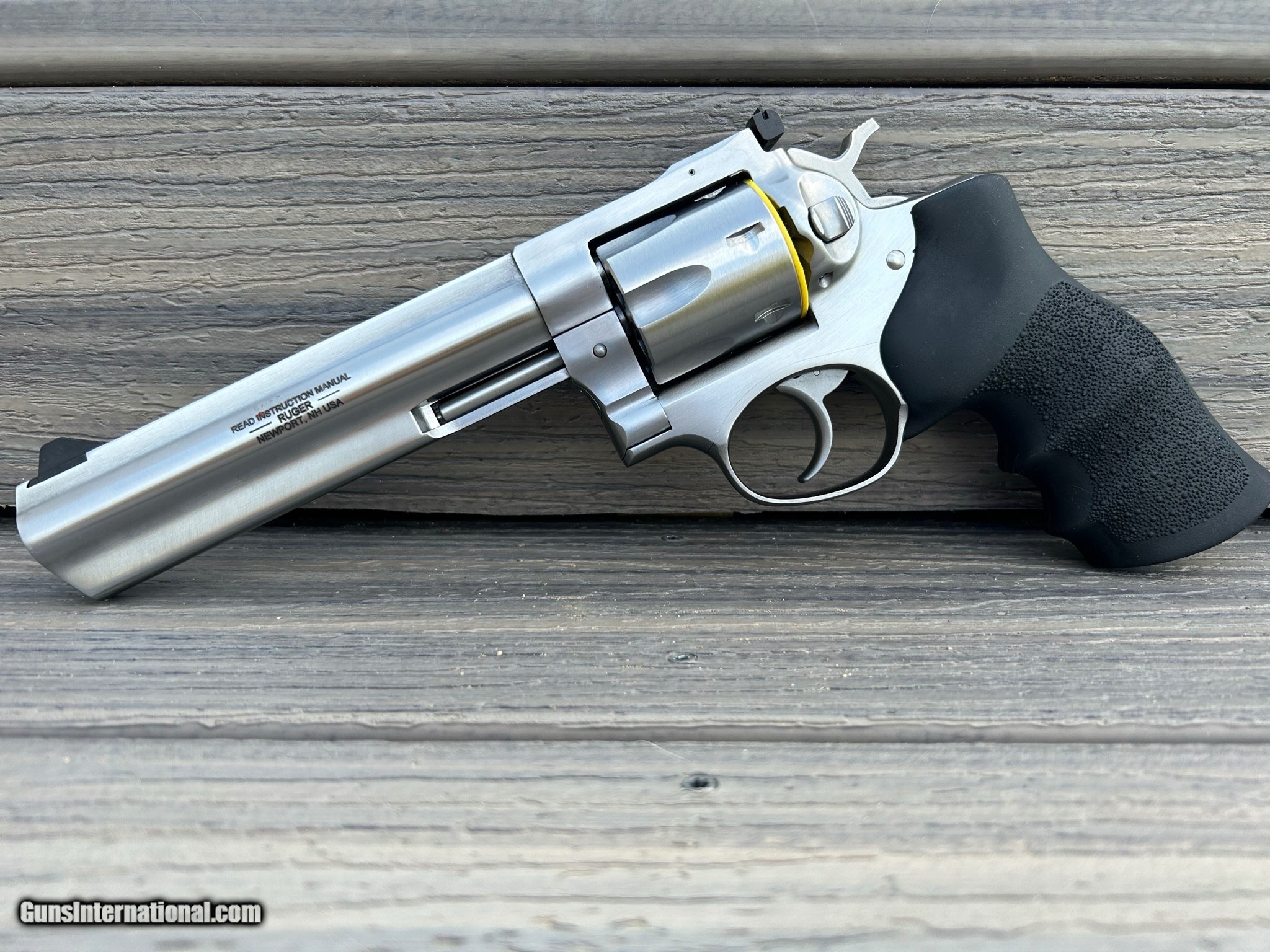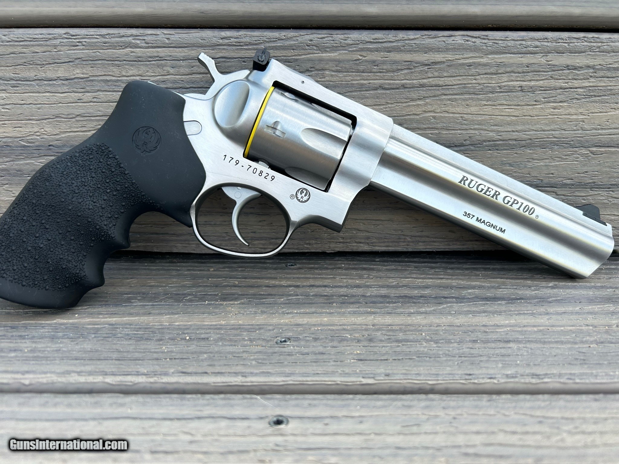 Description: Ruger GP100 Standard, Double Action, Revolver, 357 Magnum, 6" Barrel, Stainless Steel, Satin Finish, Silver, Hogue Monogrip, Ramp Front and Adjustable Rear Sights, 6 Rounds, KGP-161 01707 The Ruger GP100 Double-Action Revolvers are among the most comfortable shooting revolvers. The triple-locking cylinder is locked into the frame at the front, rear and bottom for more positive alignment and dependable operation shot after shot. It's patented grip frame design easily accommodates a wide variety of custom grips and the patented transfer bar mechanism provides an unparalleled measure of security against accidental discharge. With no special tools required, maintenance and assembly is easy. Ruger, GP100 Standard, Double Action, Revolver, 357 Magnum, 6" Barrel, Stainless Steel, Satin Finish, Silver, Hogue Monogrip, Ramp Front and Adjustable Rear Sights, 6 Rounds SOLD Handgun Caliber: .357 Magnum Manufacturer: Ruger Model: GP100 Barrel Length: 6 Condition: Factory New |