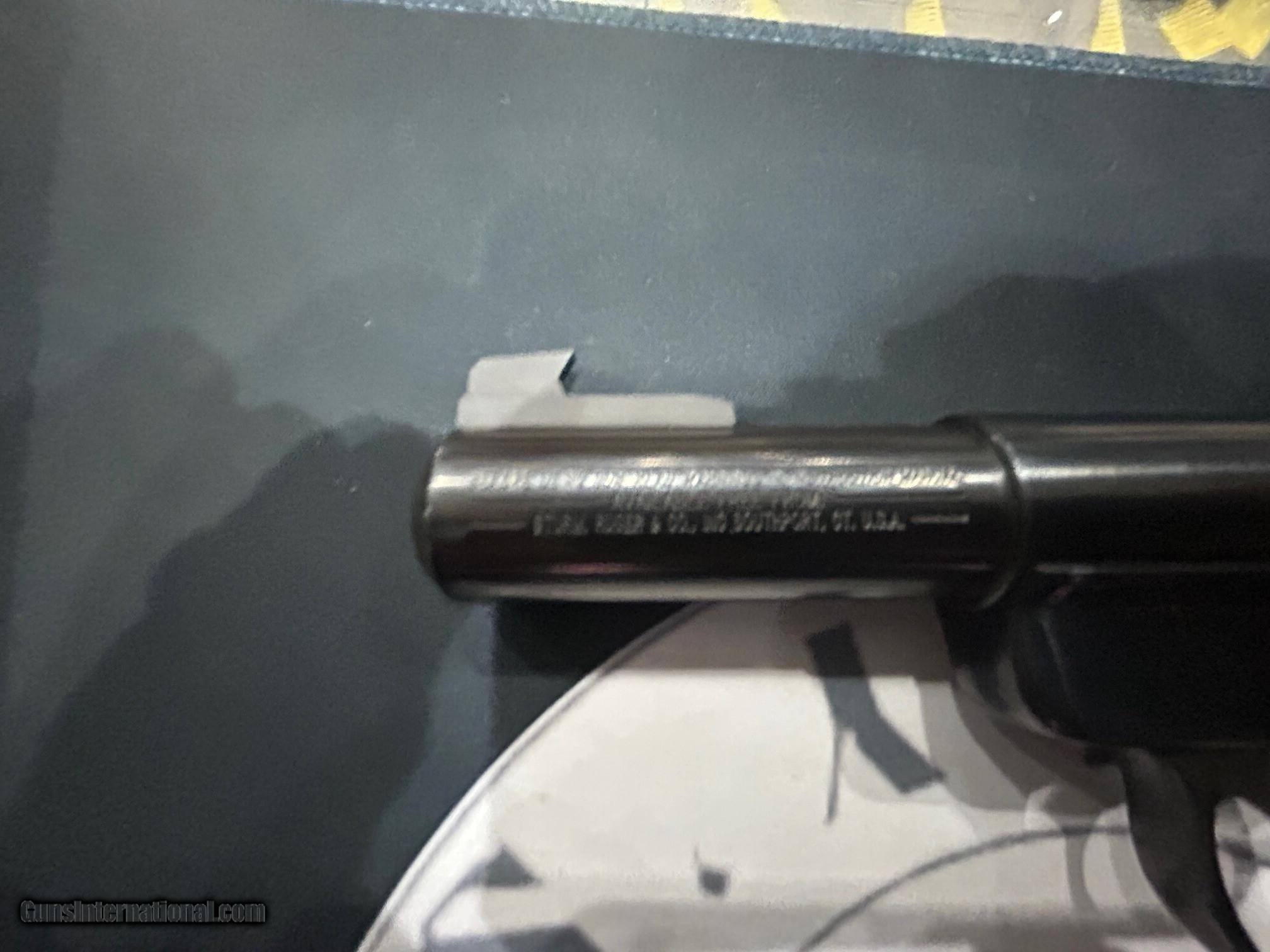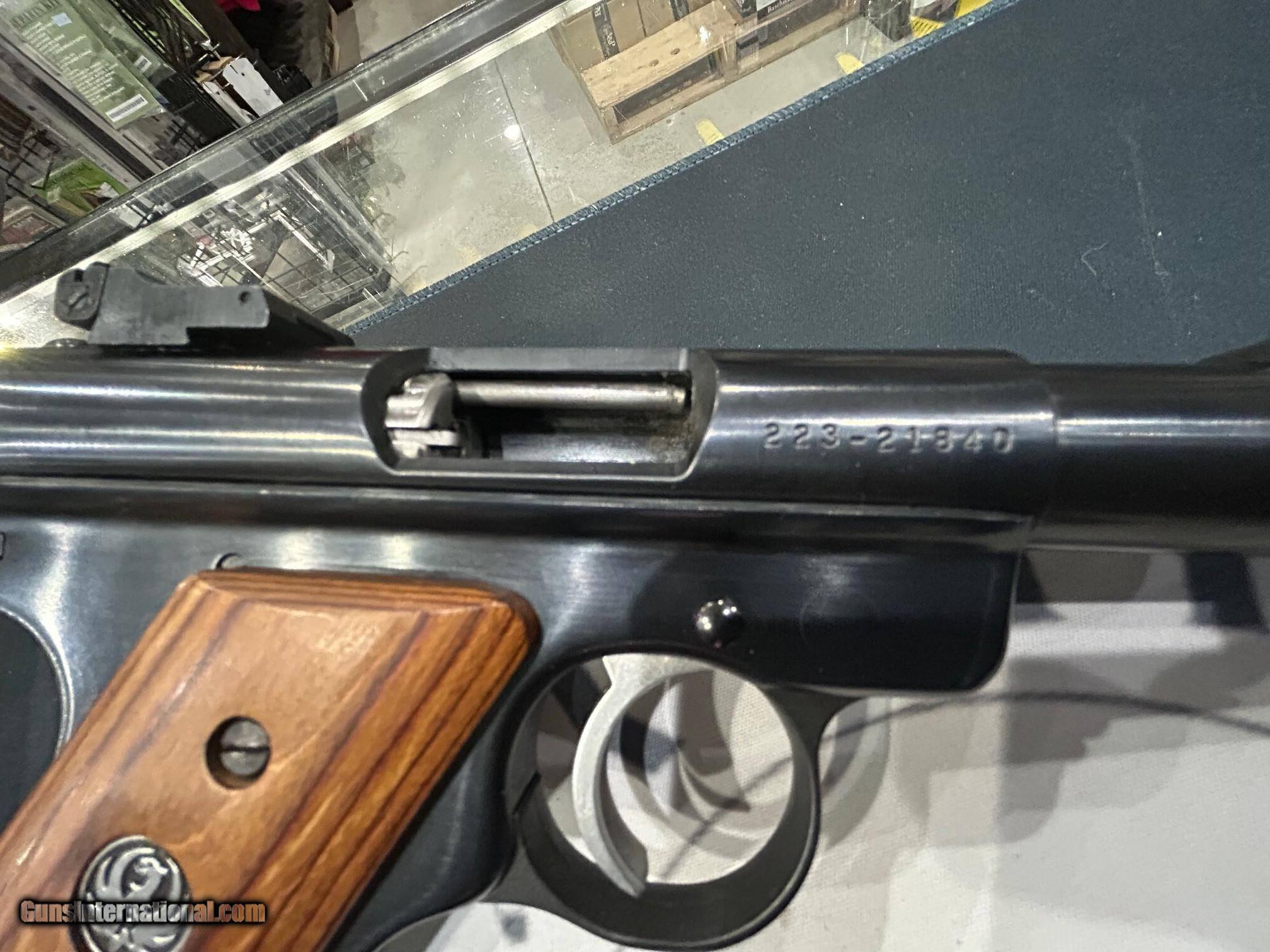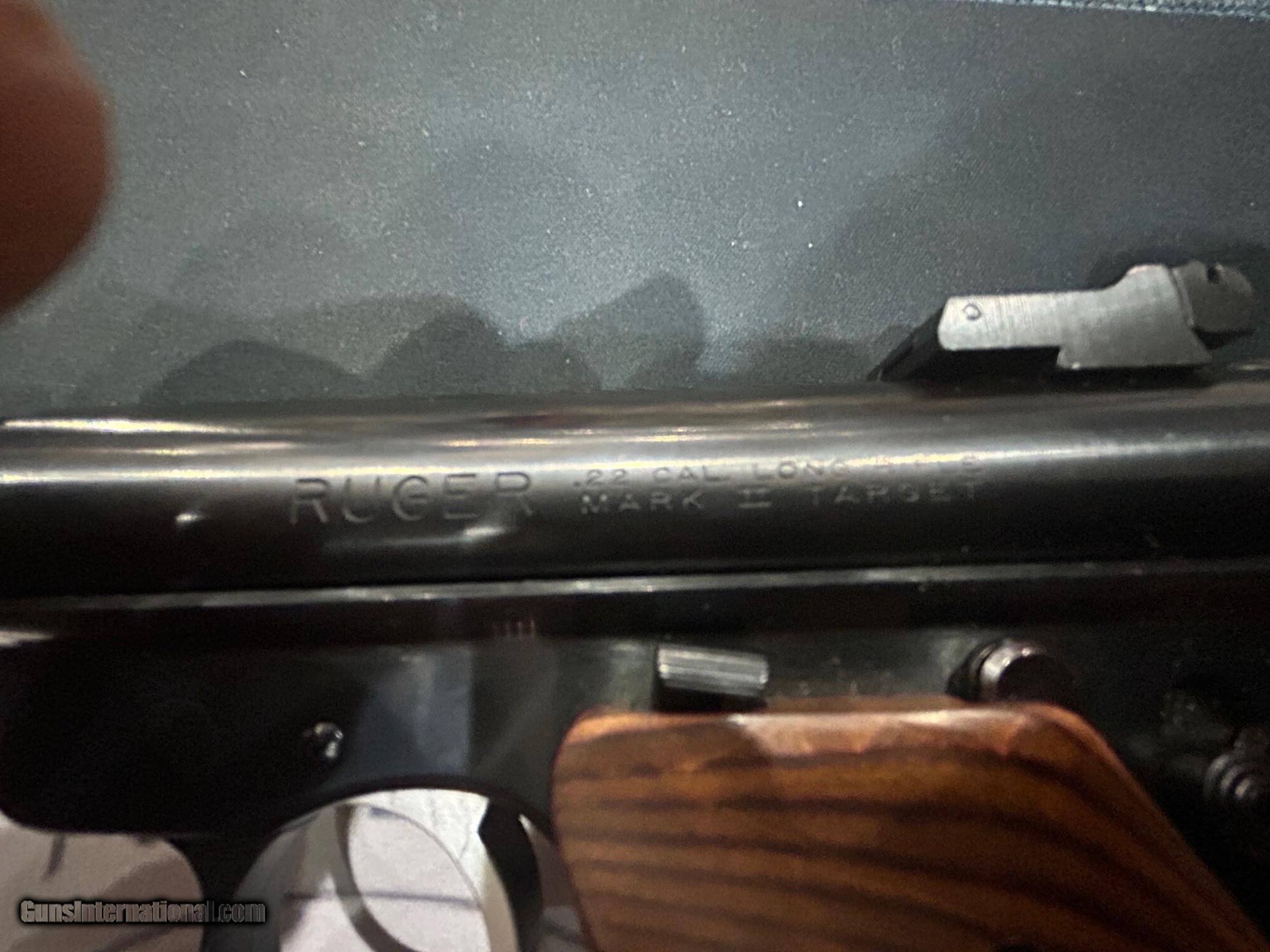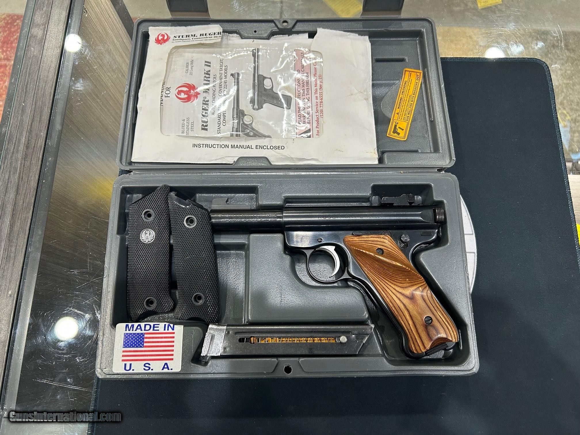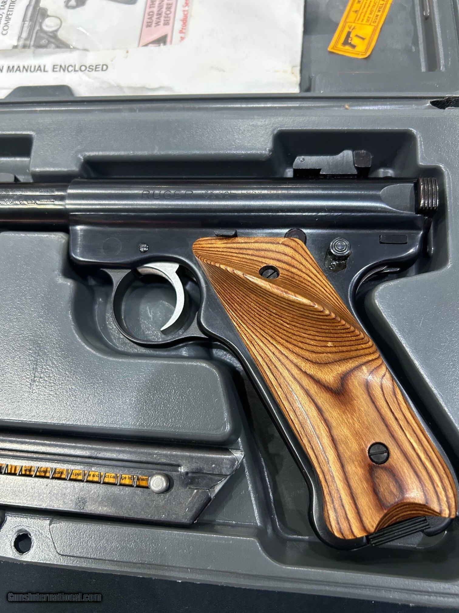 Description: Ruger Mark II Target – .22 LR – Original Box, Extra Grips, and Two Magazines Manufacturer: Sturm, Ruger & Co. Model: Mark II Target (Catalog MK4B) Caliber: .22 Long Rifle Barrel Length: 5.5" Bull Barrel Finish: Blued Grips: Laminated Wood Target Grips (with original factory Ruger black grips included) Condition: Excellent Serial Number: 223-21840 Includes: Original factory box, instruction manual, two magazines, and extra grip panels Description: This listing is for a Ruger Mark II Target semi-automatic pistol in .22 LR, complete with its original factory box, manual, and accessories. This pistol features Ruger’s heavy 5.5-inch bull barrel for superb accuracy, fully adjustable rear sight, and a crisp single-action trigger that the Mark II line is known for. The pistol retains nearly all of its original blued finish with only the lightest handling marks visible. It currently wears laminated target grips with Ruger medallions, and also comes with the original factory black checkered plastic grips should you wish to return it to its stock configuration. Mechanically excellent throughout — the action cycles smoothly, the bore is bright and sharp, and the trigger remains clean and crisp. A classic and highly desirable rimfire target pistol that set the benchmark for reliability and precision in .22 LR handguns. Condition Report: