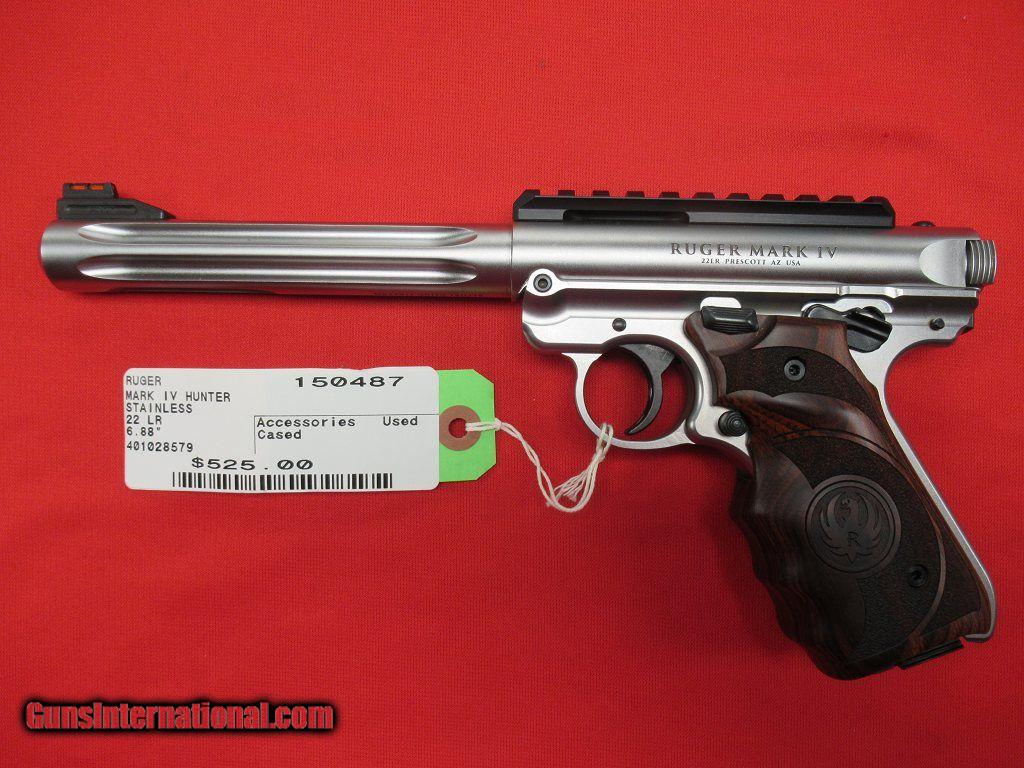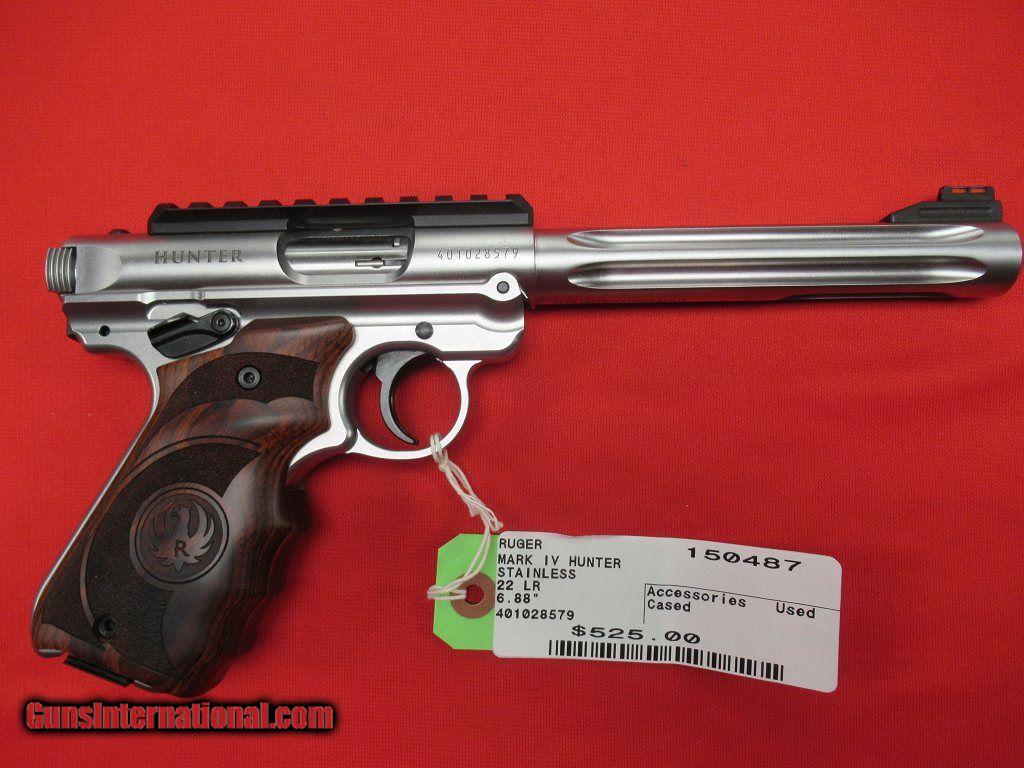 Description: This is the new Mark IV Stainless Hunter. It features a stainless frame, stainless fluted heavy barrel, fiber optic front sight, adjustable rear sight, checkered laminate grips, contoured ejection port, and an ambidextrous manual safety. This gun has a new simple one button takedown that allows for easy field stripping. . This gun has been fired approximately 200 times and remains in excellent condition. SOLD |