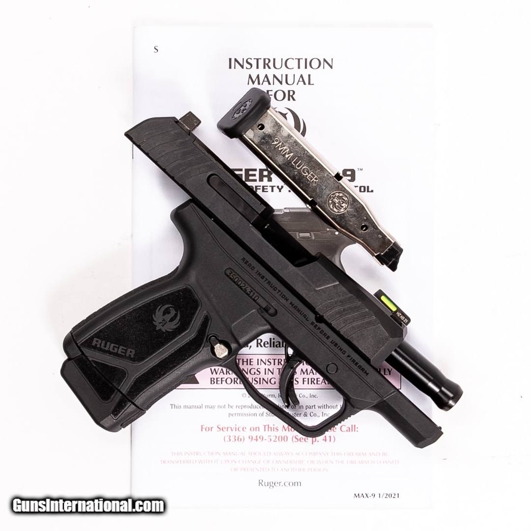Description: Guns Listing ID: 319131 This compact Ruger Max-9 is a semi-automatic 9mm pistol that‚‚s slim, lightweight, and well-suited for personal protection. It offers rugged construction with a precision-machined fire control chassis, through-hardened alloy steel slide, cold hammer-forged alloy steel barrel, and a high-performance, glass-filled nylon grip frame. This model has a thumb safety and green fiber optic front sights. It is in excellent condition! Purchase includes the original box, manual, two 10-round magazines, optic plate, and an extra magazine pinky extension SOLD Manufacturer: RUGER Model: Max-9 Caliber Info: 9 MM LUGER Condition: Used - Certified Barrels: 3.25 BARREL Finish: BLACK |