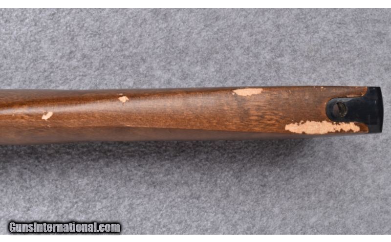 Description: Barrel blue shows an area of old pitting. Buttstock has shipping scuffs to the comb and right side. Bore remains excellent. Complete with box. SOLD Manufacturer: S/N 620-10XXX Caliber Info: .22 Mag. Metal Condition: Good Wood Condition: Fair Bore Condition: Excellent Barrels: 18 Triggers: Factory Stock: Uncheckered Hardwood Stock Dimensions: 13 1/8" LOP Fore End: Uncheckered Hardwood Butt Pad: Black Synthetic Weight: 5 1/2" LB Sights: Bead Front - Folding Notch Rear Item Location: Wheeling, WV |