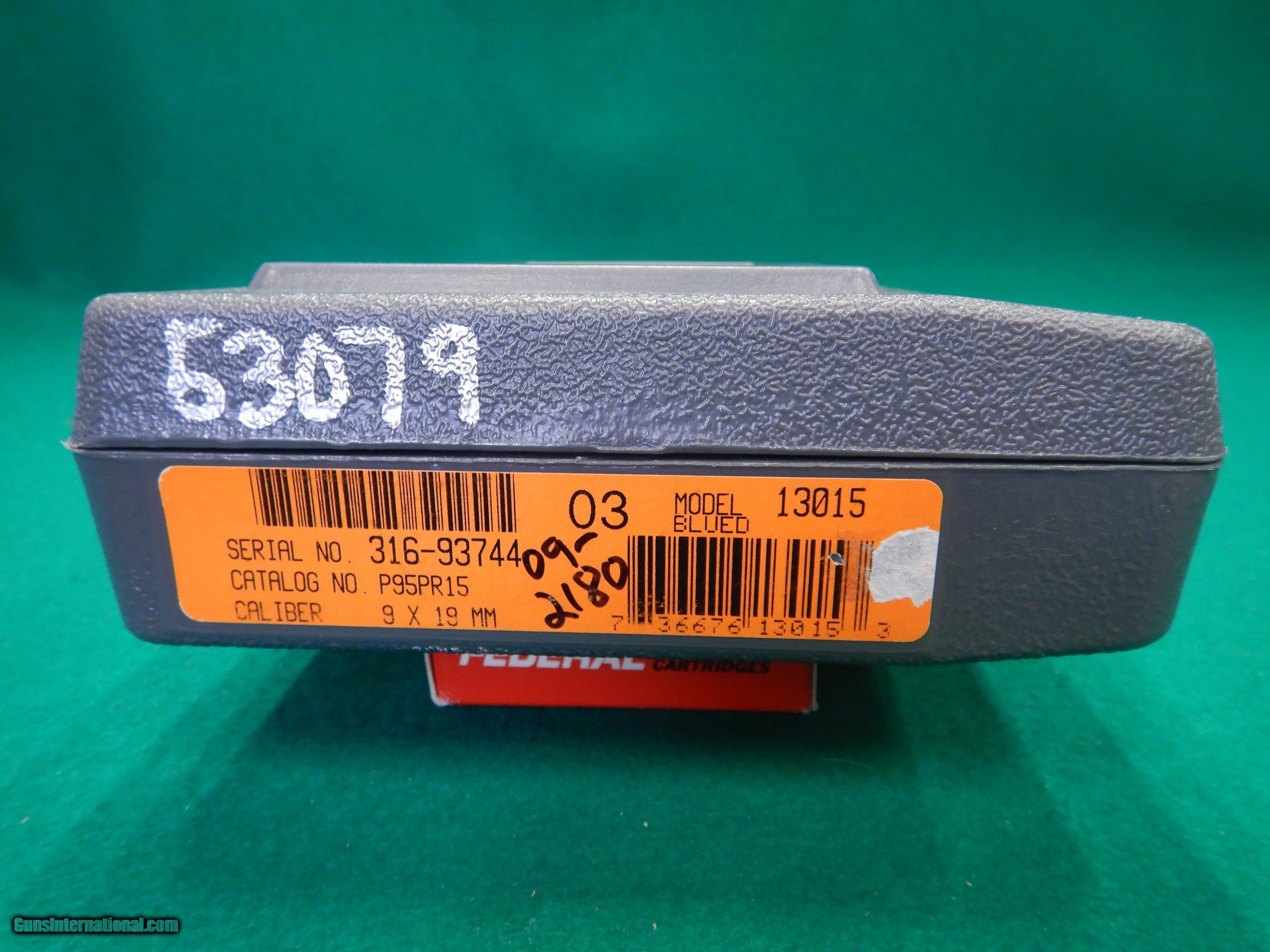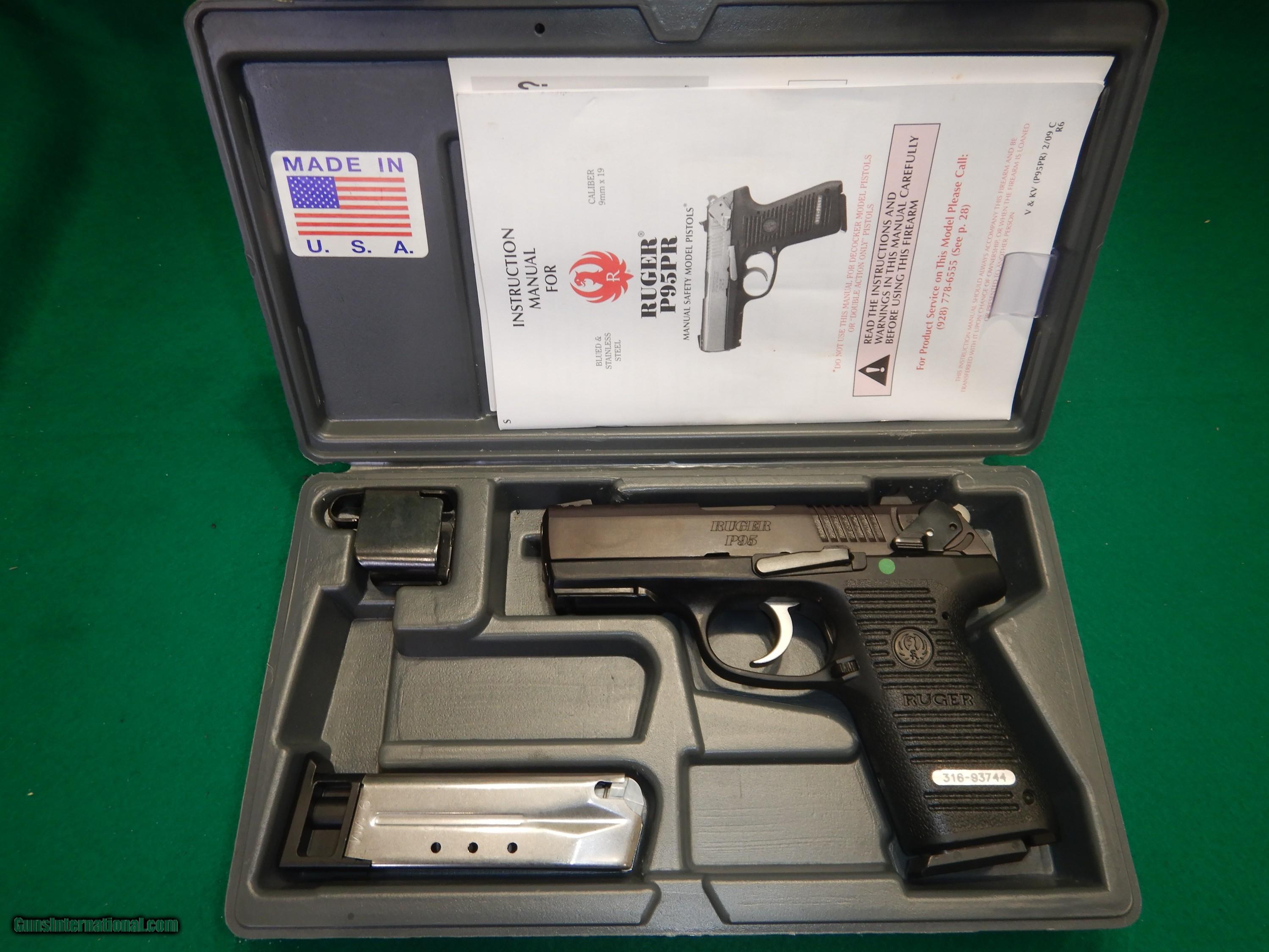 Description: Ruger P95PR15 9MM Pisol In Box. S/N: 316-93744. Selling as used in excellent condition and appears unfired. Ruger 15 + 1 Round 9MM w/Picatinny Rail/Blue Finish/3.9\" Barrel Each metal frame P95 series pistol is made of hard coated A356T aircraft quality aluminum alloy; Ruger\'s proprietary Terhune Anticorro stainless steel (chrome-molybdenum steel in blued models); nearly indestructible resin grip panels; custom, compounded polymer frames of the P95 andP97; and long strand fiberglass filler that is a natural shock absorber. P95 series pistols easily field strip for cleaning, without the use of special tools, into five major subassemblies. Specifications: