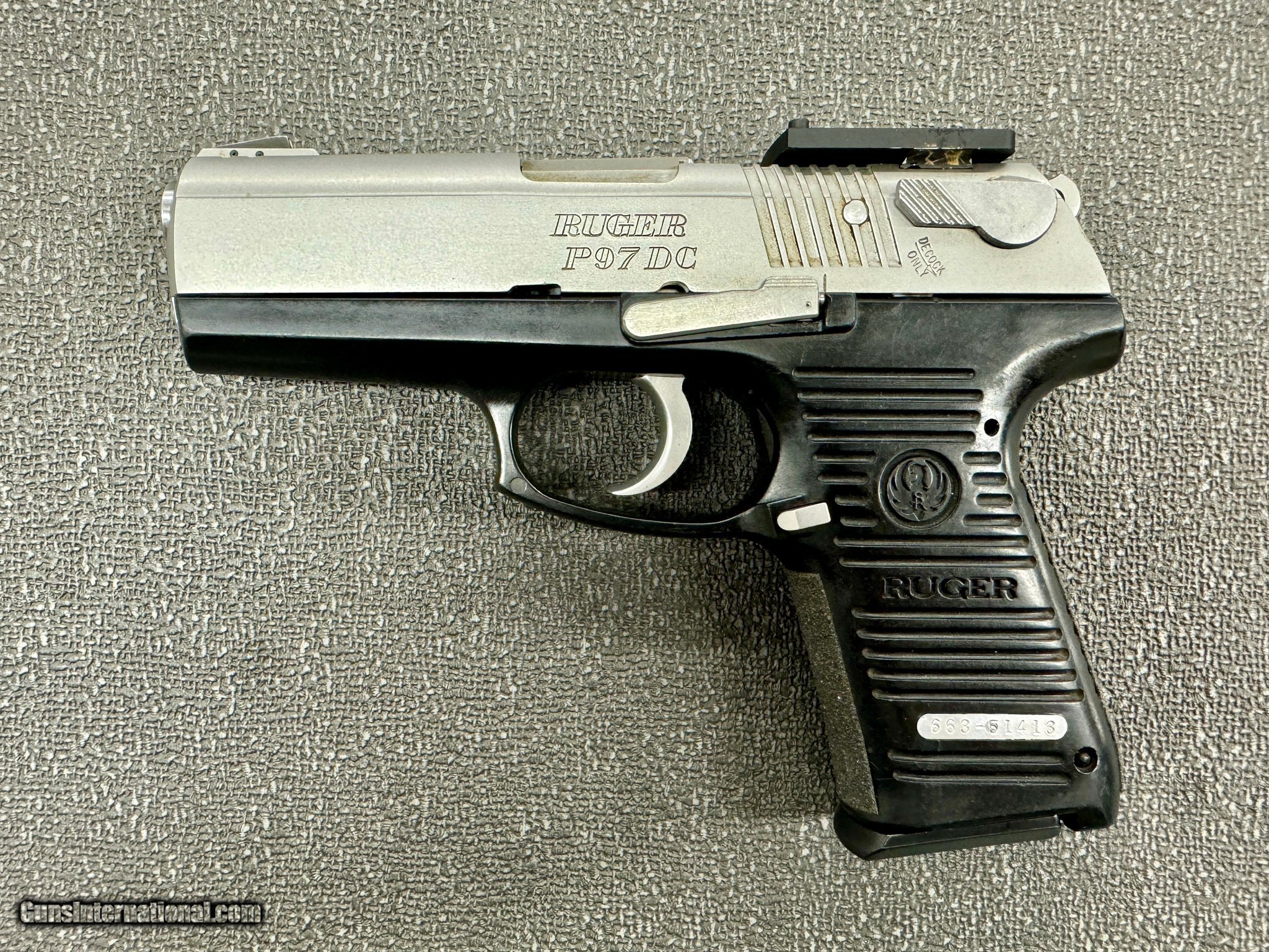 Description: Guns Listing ID: 1269918 I have a Ruger P97 DC, chambered in .45acp. This handgun comes with 4 mags total, no box. It also appears to have an aftermarket red dot plate attached to the rear sight. SOLD Manufacturer: RUGER Model: P97 DC Caliber Info: .45 ACP Condition: Used - Non-Certified Barrels: 4.5 BARREL Finish: STAINLESS & BLACK |