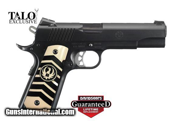 A Brand New Ruger SR1911 Night Watchman TALO Edition 10MM Semi-Automatic. Black Nitride Finish. White Chevron Ivorylite Grips. Night Sights. Skeletonized Trigger. Rear Slide Serrations. Extended Thumb Safety. Beavertail Grip Safety.