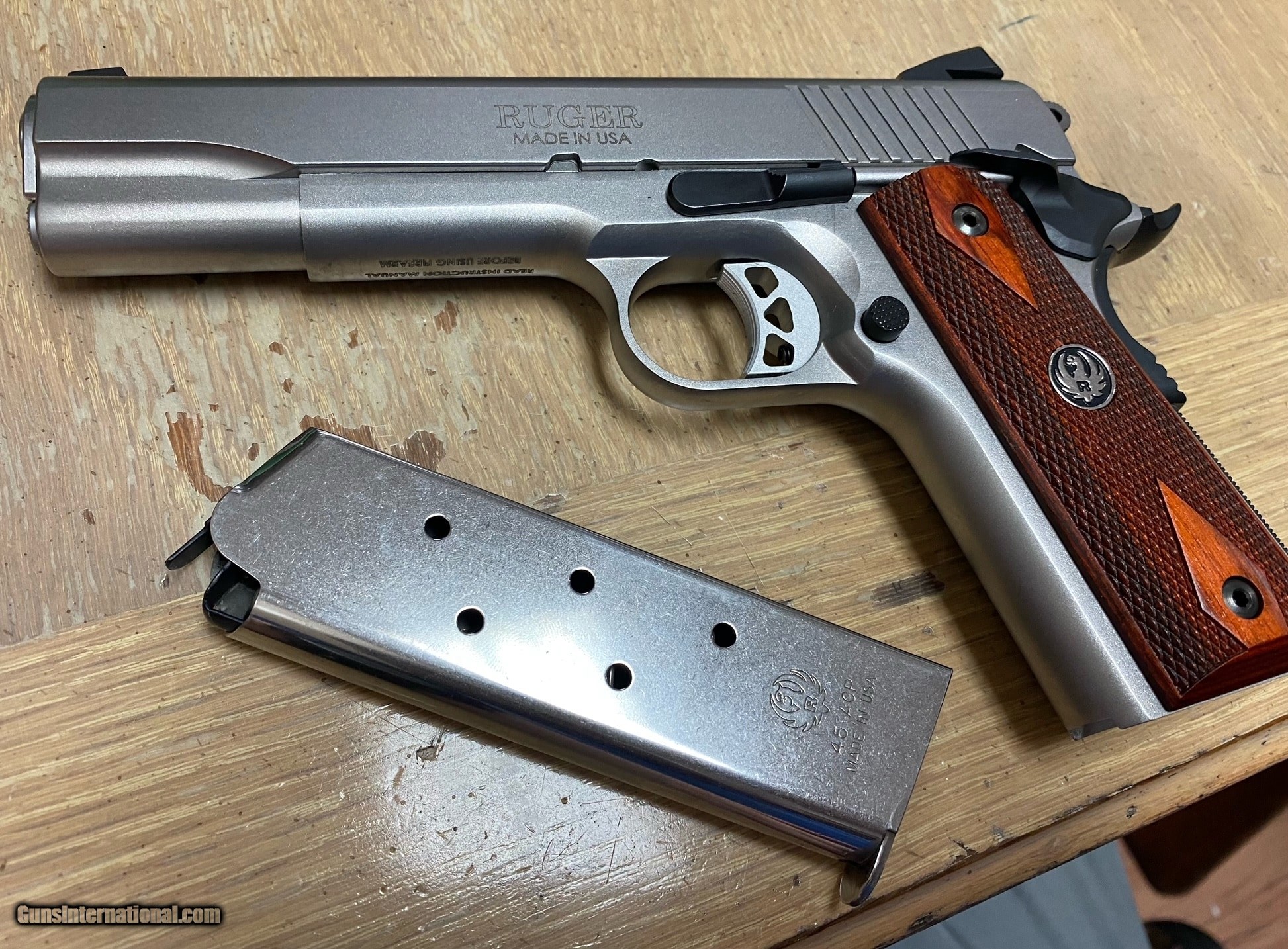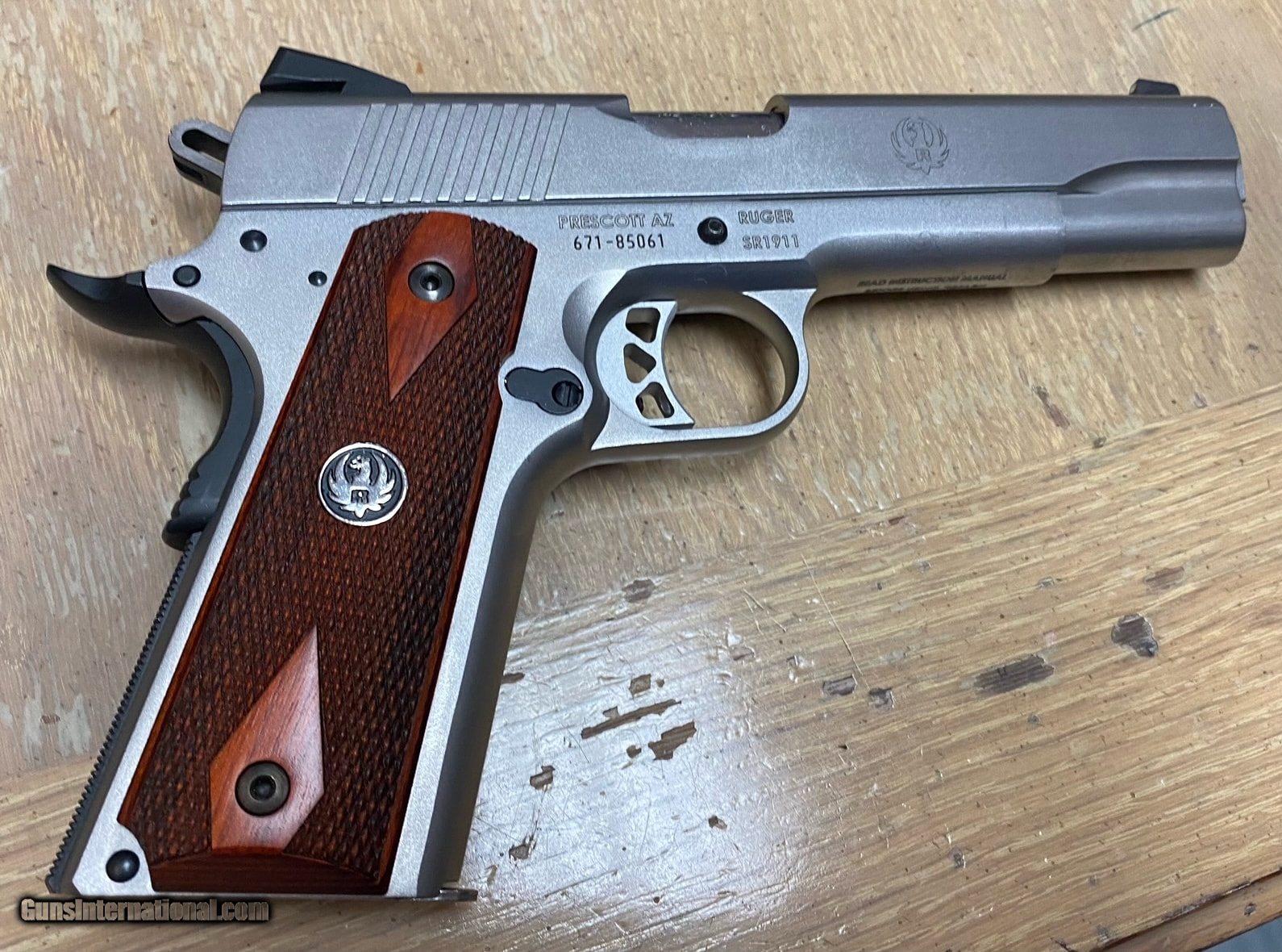 Description: Guns Listing ID: 563524 Up for sale is a Used - Excellent Condition Ruger SR1911 .45 ACP 7+1 5\" Stainless Steel / Wood Grips. Pistol is used in an estimated 90% condition overall, light handling marks on the underside of the frame froward of the trigger guard, minor chamber wear with excellent bore. Includes black zip case with factory manual. SOLD Manufacturer: RUGER Model: SR1911 Stainless Steel / Wood Grips Caliber Info: .45 ACP Condition: Used - Non-Certified Barrels: 5 BARREL Finish: STAINLESS |
