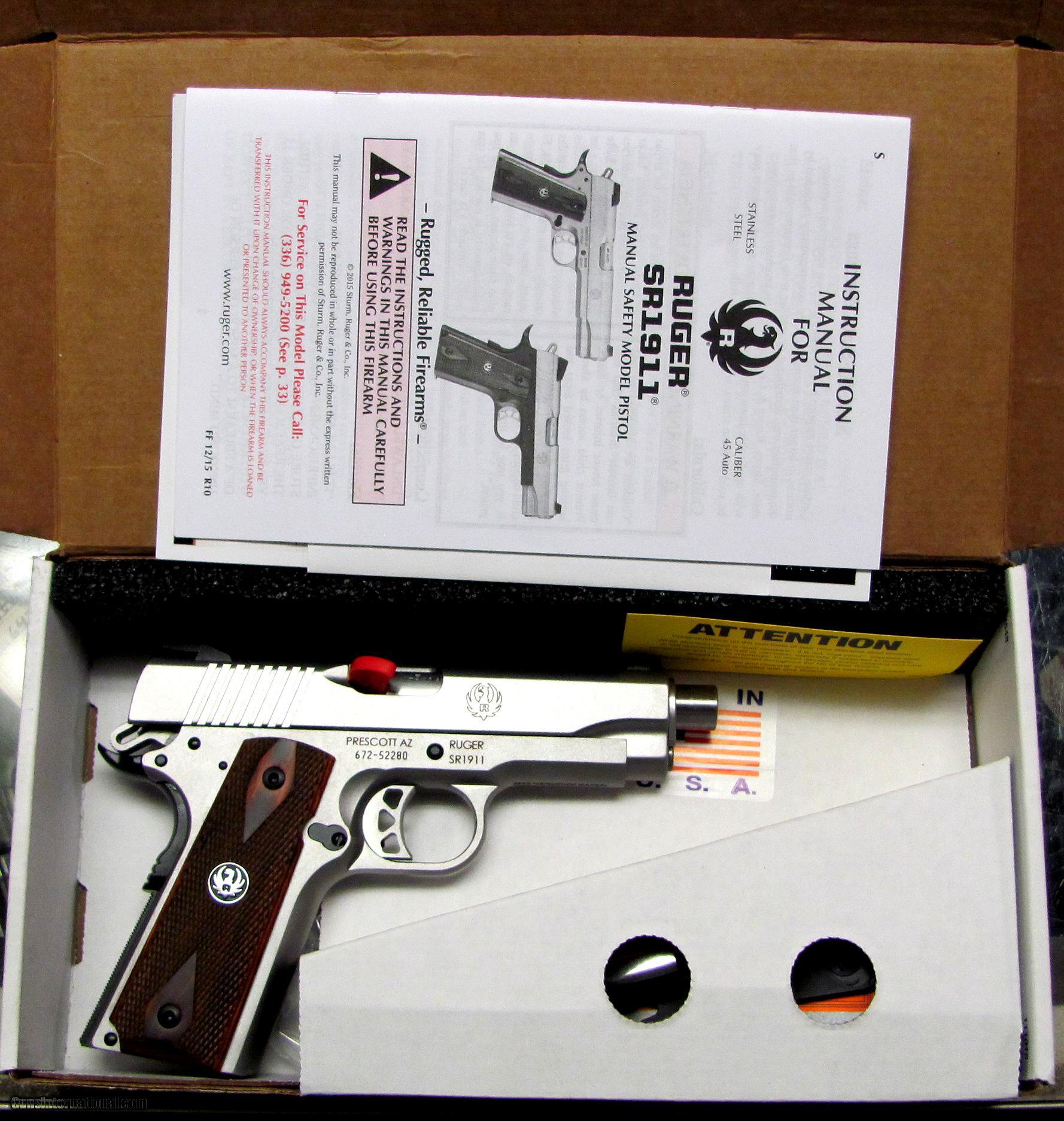 Description: RUGER model SR1911SCMD in .45 CAL., with 4 1/4" barrel. Color STAINLESS STEEL. RUGER MODEL SR 1911 SCMD, NEW UNFIRED WITH FACTORY BOX AND ALL PAPERS. OUR NEW STOCK # D31801 Condition NEW. Serial number 672-52280. SOLD |