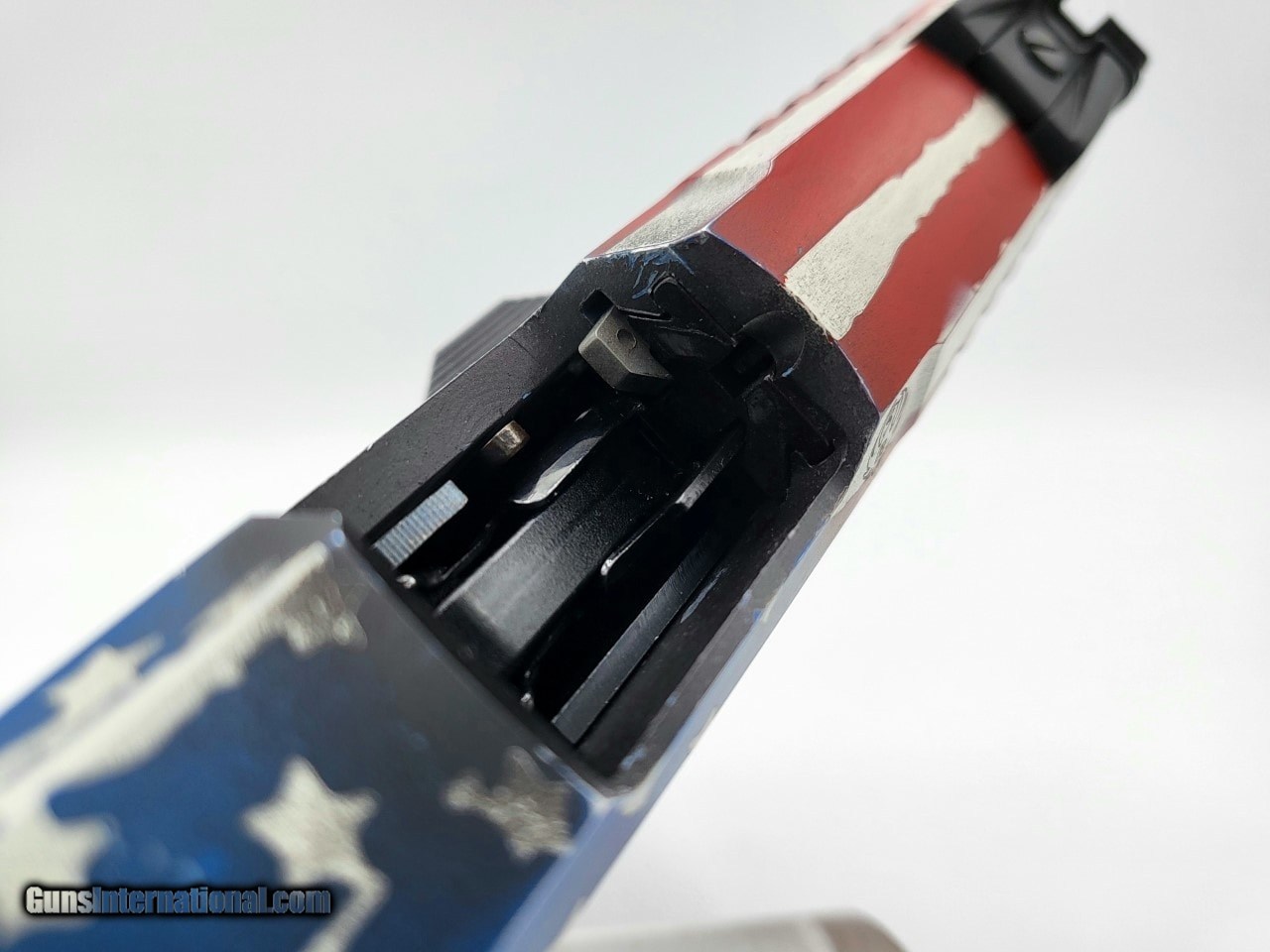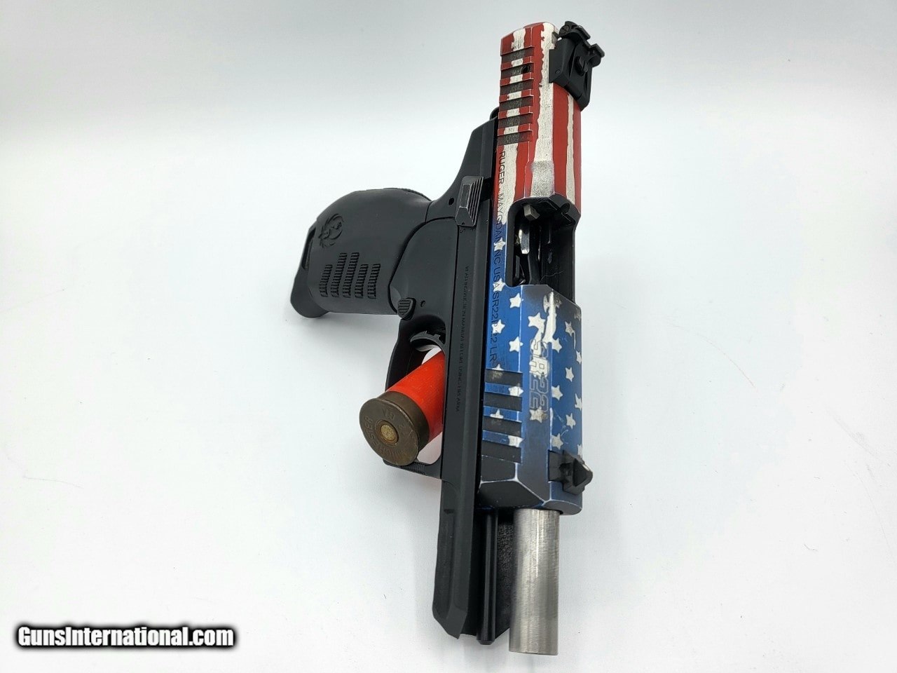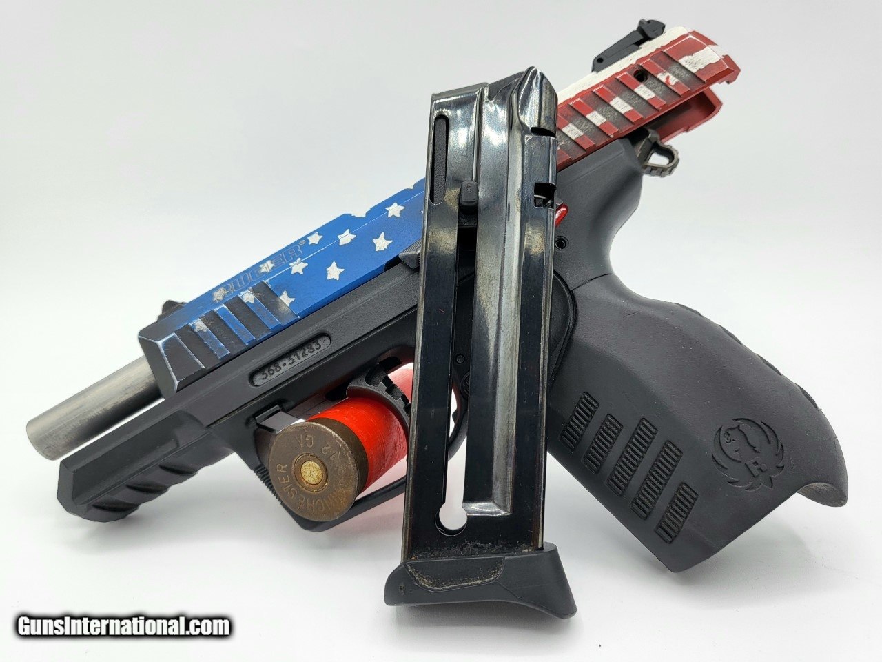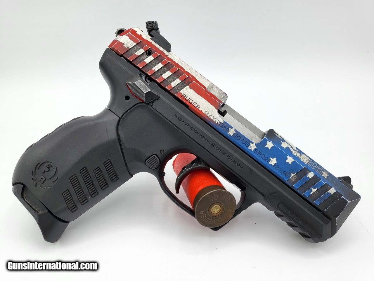 Description: Guns Listing ID: 791258 This is a pre-owned Ruger SR22 in very good condition with minimal user wear and wear on the front sight, this pistol comes with a 10+1 round magazine in .22 long rifle. Capacity10+1 Slide MaterialAluminum Barrel Length3.50\" Grip FrameBlack Polymer Barrel TypeStandard Slide FinishAmerican Flag Cerakote® Barrel FinishStainless Width0.97\" SightsAdjustable 3-Dot Weight17.5 oz. Overall Length6.40\" Height4.90\" Grooves6 Twist1:16\" RH I#0820430 SEM AG SOLD Manufacturer: RUGER Model: SR22 Caliber Info: .22 LR Condition: Used - Non-Certified Barrels: 3.5 BARREL Finish: AMERICAN FLAG |