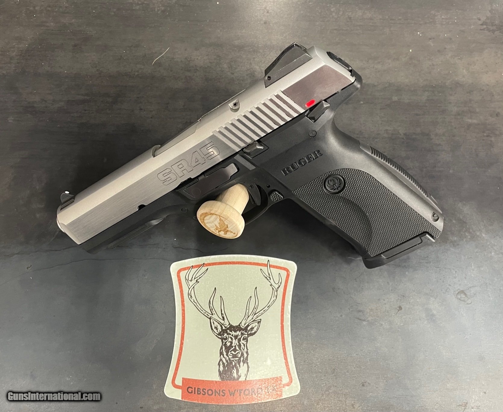Description: Guns Listing ID: 555202 Chambered in 45 ACP, the Ruger SR45 is a semi-automatic handgun with a slim and ergonomic profile. The glass-filled, checkered nylon grips offer reversible backstraps while providing a secure, comfortable grasp and reduced felt recoil. The slide is constructed of steel and 3-dot sights aid in target acquisition. Other features include ambidextrous controls, loaded chamber indicator, and an integral accessory rail forward of the trigger guard. This SR45 is well-suited as a range gun or duty weapon, as well as for home defense or personal protection. Gun is lightly used, comes with original factory box. SOLD Manufacturer: RUGER Model: SR45 Full Size .45ACP Caliber Info: .45 ACP Condition: Used - Non-Certified Barrels: 4.5 BARREL Finish: STAINLESS AND BLACK |