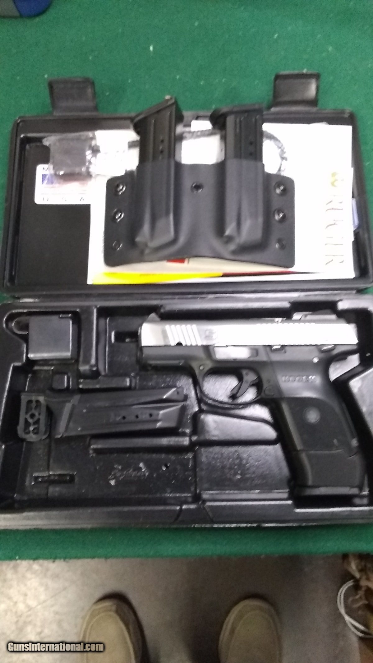Description: Guns Listing ID: 642273 This Ruger SR9C is in excellent condition and comes with three 17rd. mags, one 10rd. mag, and a double mag pouch. Gun is in very good condition. SPECS: 9mm Luger 3.5\" barrel 6 grooves 1:10\" twist 10 and 17 round capacity Ambidextrous thumb safety and D-shaped ambidextrous magazine release Black, high performance, glass filled nylon grip frame Stainless steel slide Brushed stainless finish High visibility adjustable 3 dot sights Reversible back strap Accessory rail Grip extension adapter included 6.85\" overall length 4.61\" tall 1.27\" wide 5.58\" tall with grip extension adapter 23.40 ounces SOLD Manufacturer: RUGER Model: SR9C Caliber Info: 9MM LUGER (9X19 PARA) Condition: Used - Non-Certified Barrels: 3.5 barrel |