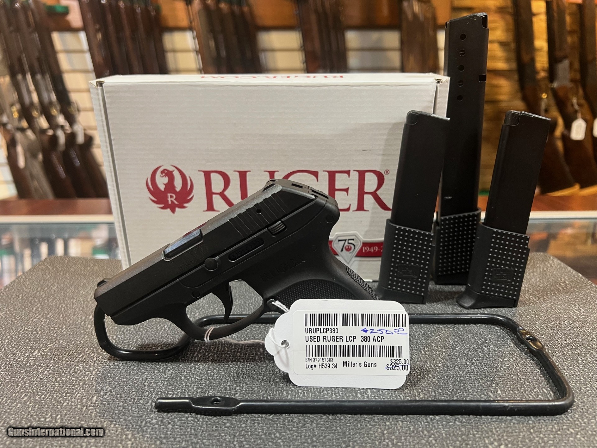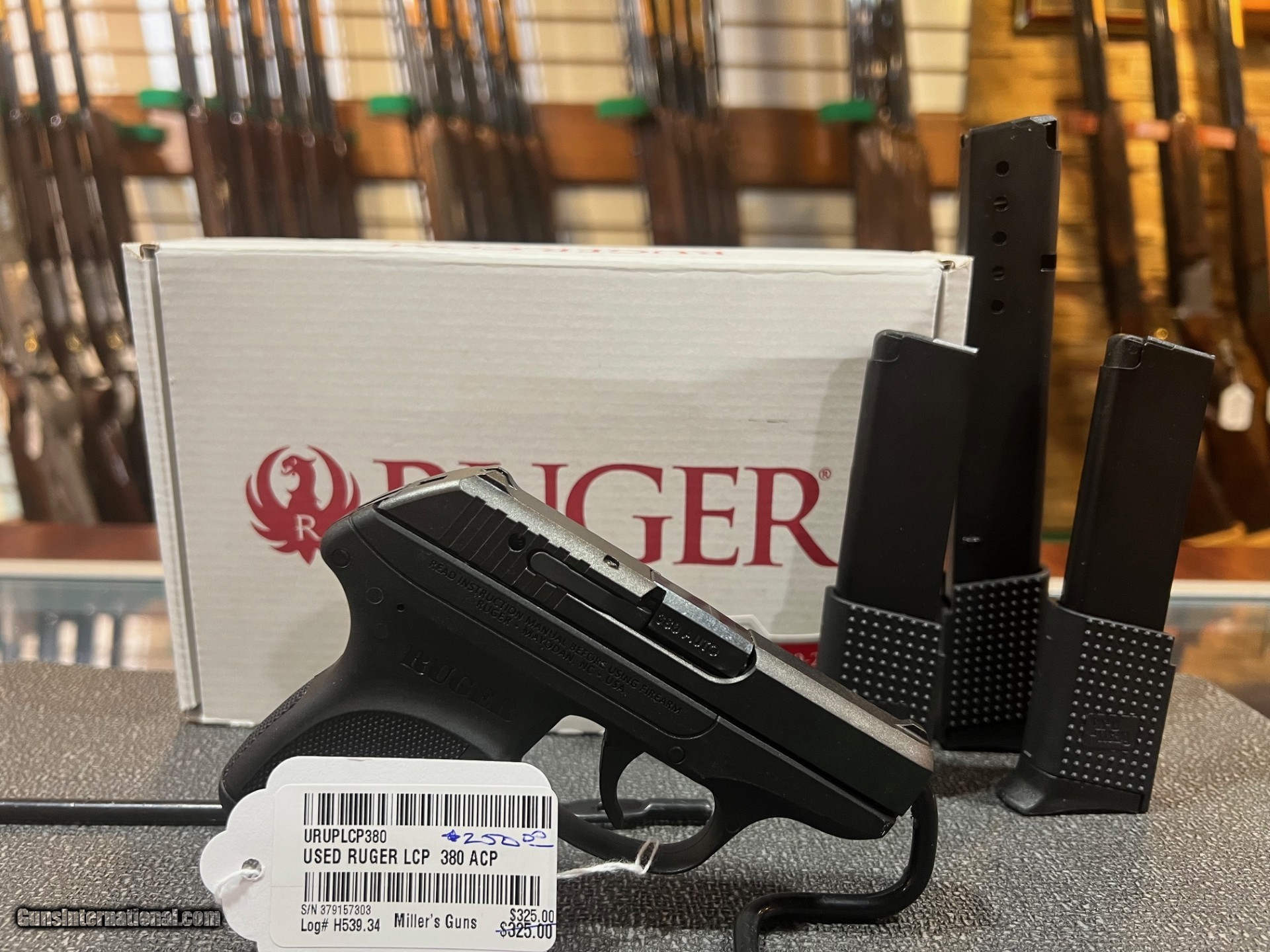 Description: Pre Owned Factory Box Caliber 380 ACP 4 Magazines 1 6 rd 1 13 rd 2 10 rd SOLD Handgun Caliber: .380 ACP (9x17mm Browning Short) Manufacturer: Ruger Model: LCP Serial Number: 379157303 Condition: GOOD Metal Condition: GOOD Bore Condition: GOOD |