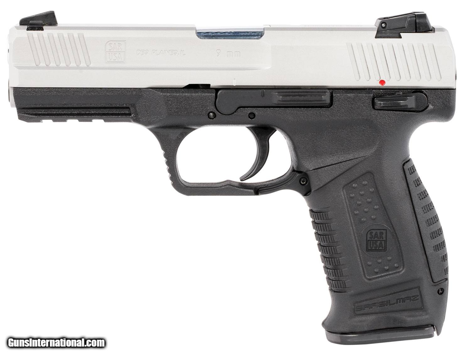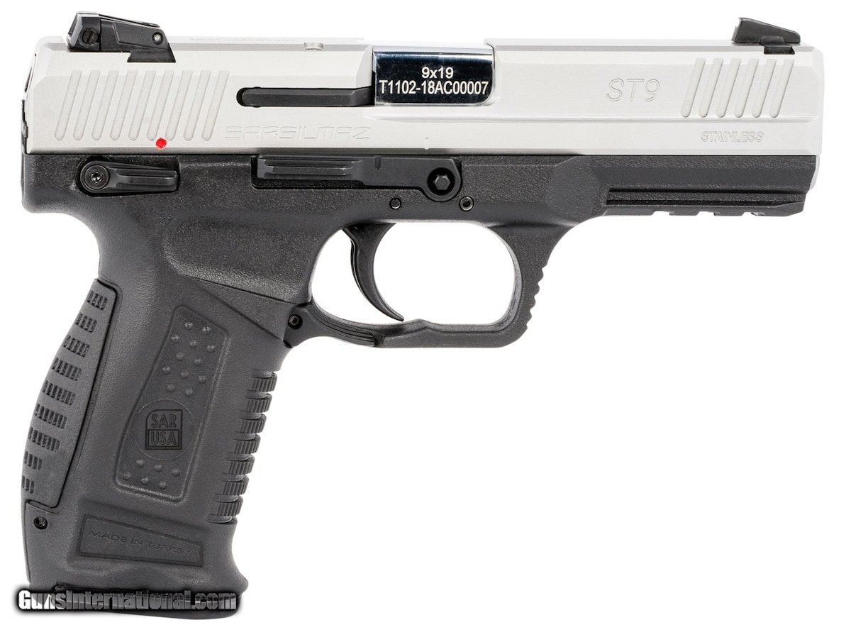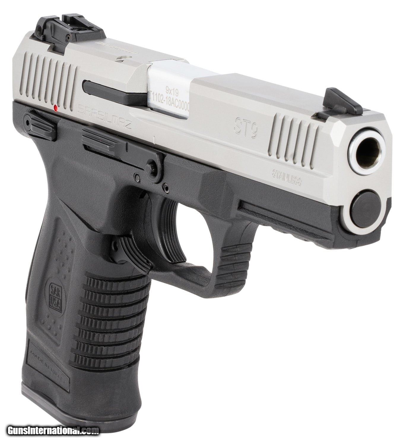 Description: Guns Listing ID: 597296 The ST9 is a striker fire polymer frame pistol with a host of features. These features include ambidextrous magazine release, and frame safety, 3 dot adjustable low profile sights, interchangeable backstraps to customize your fit, front and rear serrations on the slide to make it easy to manipulate the slide, and picatinny frame rail to add your favorite accessories. The rear of the slide features a red flag indicator that shows when the pistol is cocked and loaded. When the trigger is pulled, the red flag disappears to show the gun is not loaded and safe. This pistol will soon become one of your favorites due to its flexibility. SOLD Manufacturer: SAR ARMS Model: ST9 Caliber Info: 9MM LUGER (9X19 PARA) Condition: new Barrels: 4.5 BARREL |