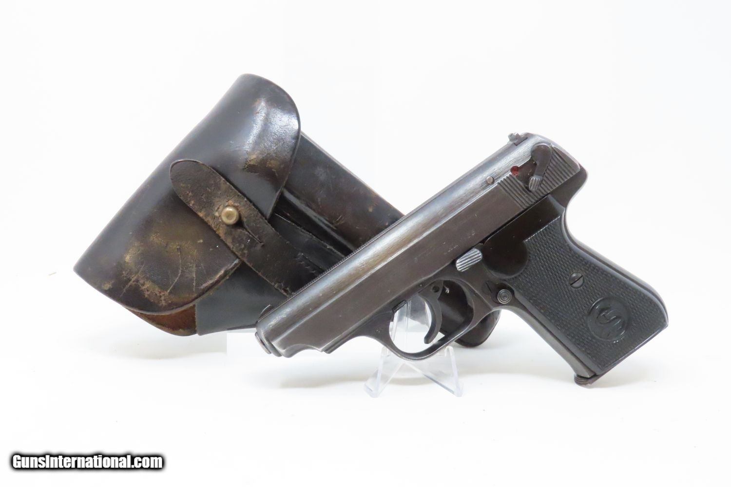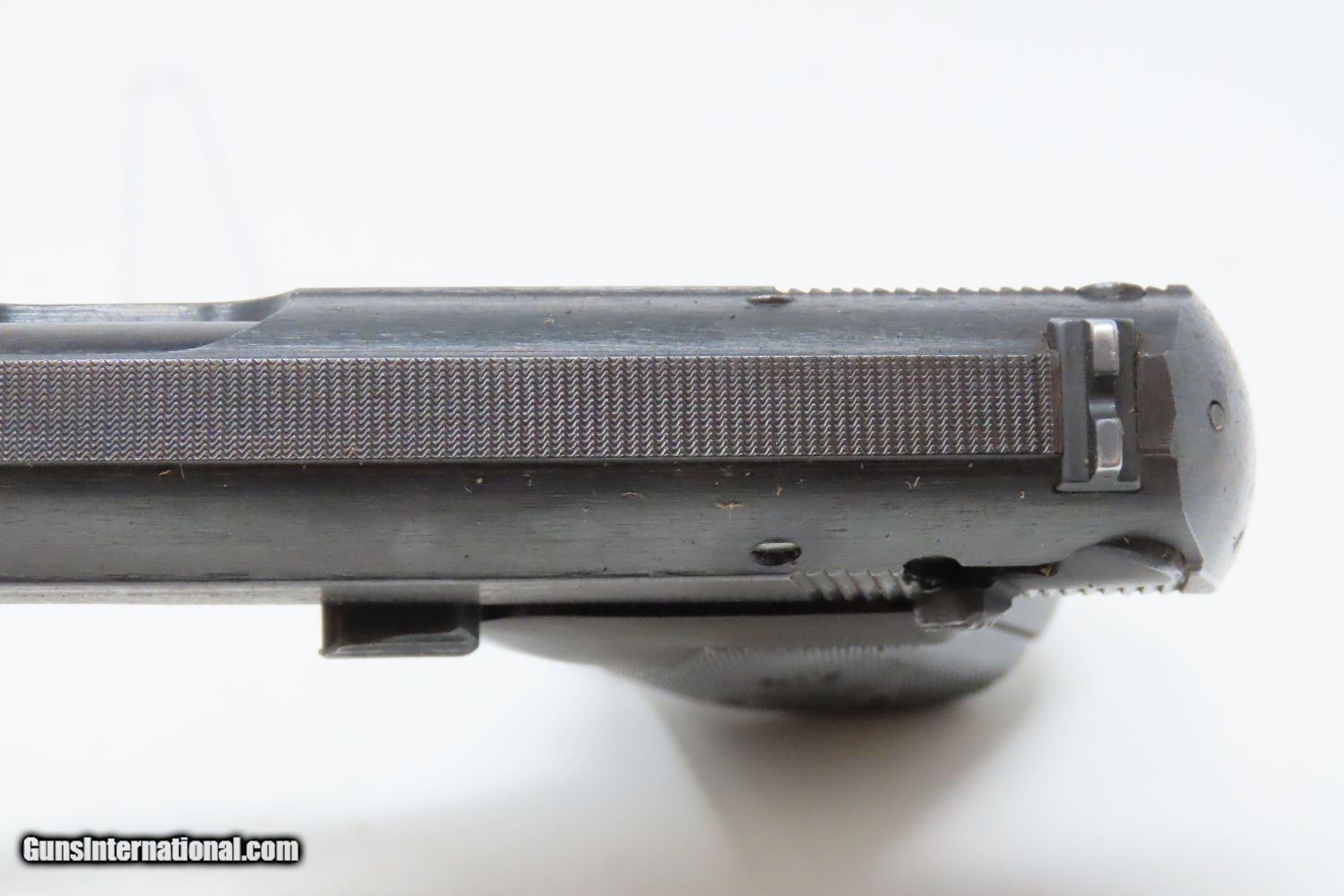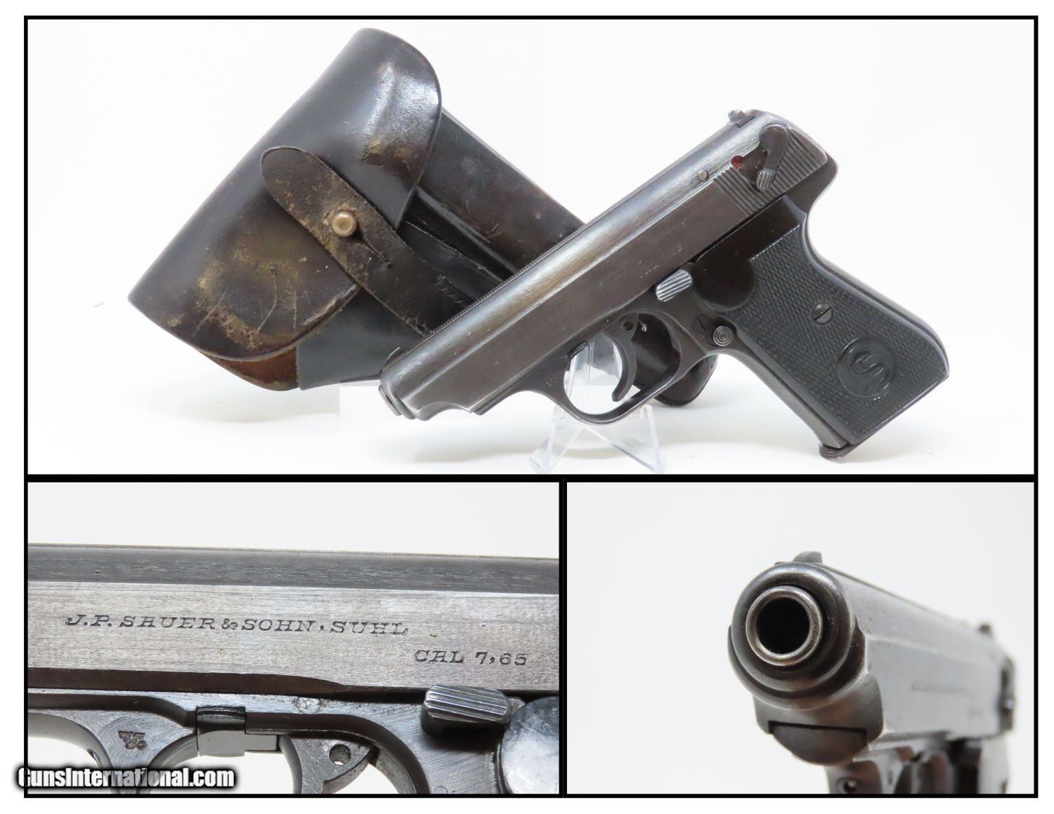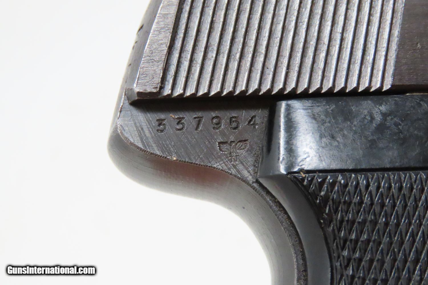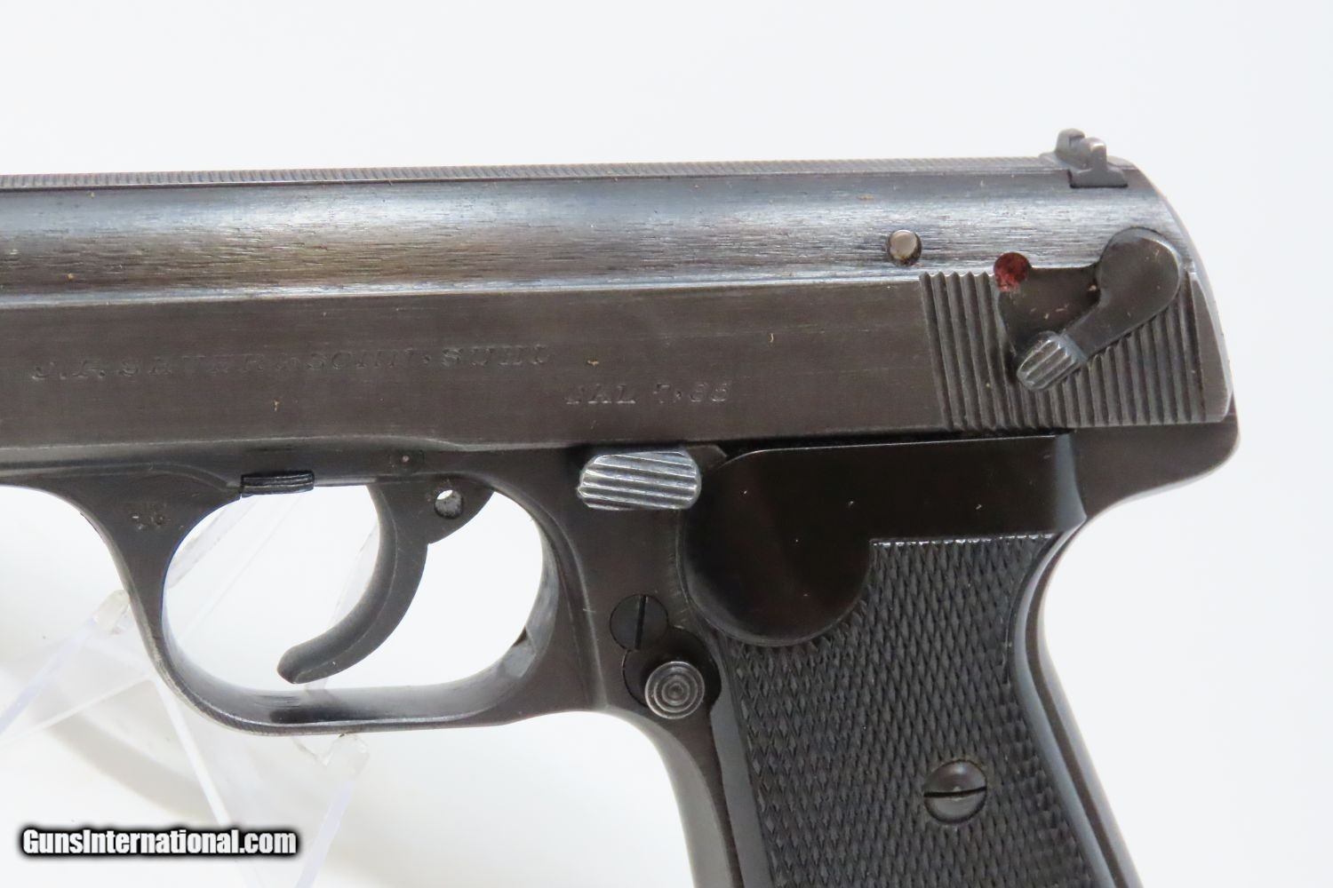Description: “EAGLE C” Marked WORLD WAR II J.P. SAUER & SOHN Model 38H Semi-Auto PISTOL With HOLSTER Rig! Here we present a J.P. Sauer & Sohn Model 38H Semi-Automatic Pistol manufactured circa 1942 in Suhl, Germany with a production run from 1938 through the end of World War II in 1945 with approximately 200,000 examples made. The "H" in the model number indicates this pistol uses a shrouded hammer as opposed to the striker style firing of earlier Sauer models. This pistol was issued to the German Army and was a favorite of the Luftwaffe as it could be carried while parachuting behind enemy lines. The Eagle over Swastika C proof mark on the frame is a Military acceptance mark indicating that this pistol was issued to the German Army instead of the police. The Sauer 38H was produced in three basic models. The slide of the first model says "JP Sauer und Sohn" on the left along with the caliber. The second version says only "CAL 7.65", and the third version omits the safety and the cocking/decocking lever. Towards the end of the war, weapons produced were simplified for quicker, cheaper production. For the 38H, this meant simpler markings, rough finish, and the elimination of features like the slide-mounted safety. The overall condition is fine. Original blue finish. The action is excellent. The bore is fine, bright with sharp rifling. The grips are in great shape. The holster is in very good condition. This firearm is classified as a Curio & Relic. Barrel is 3-3/8 inches. Caliber: 7.65s17mmSR Browning (.32 ACP) Overall condition as seen in photos. Very Fast. Very Safe. FREE SHIPPING. Will need to be sent to your local FFL or C&R licensee. This firearm is classified as a Curio & Relic. Guaranteed AUTHENTIC & Includes CERTIFICATE OF AUTHENTICITY. ancestryguns $1600 #215531 SOLD Curio/Relic: Yes |