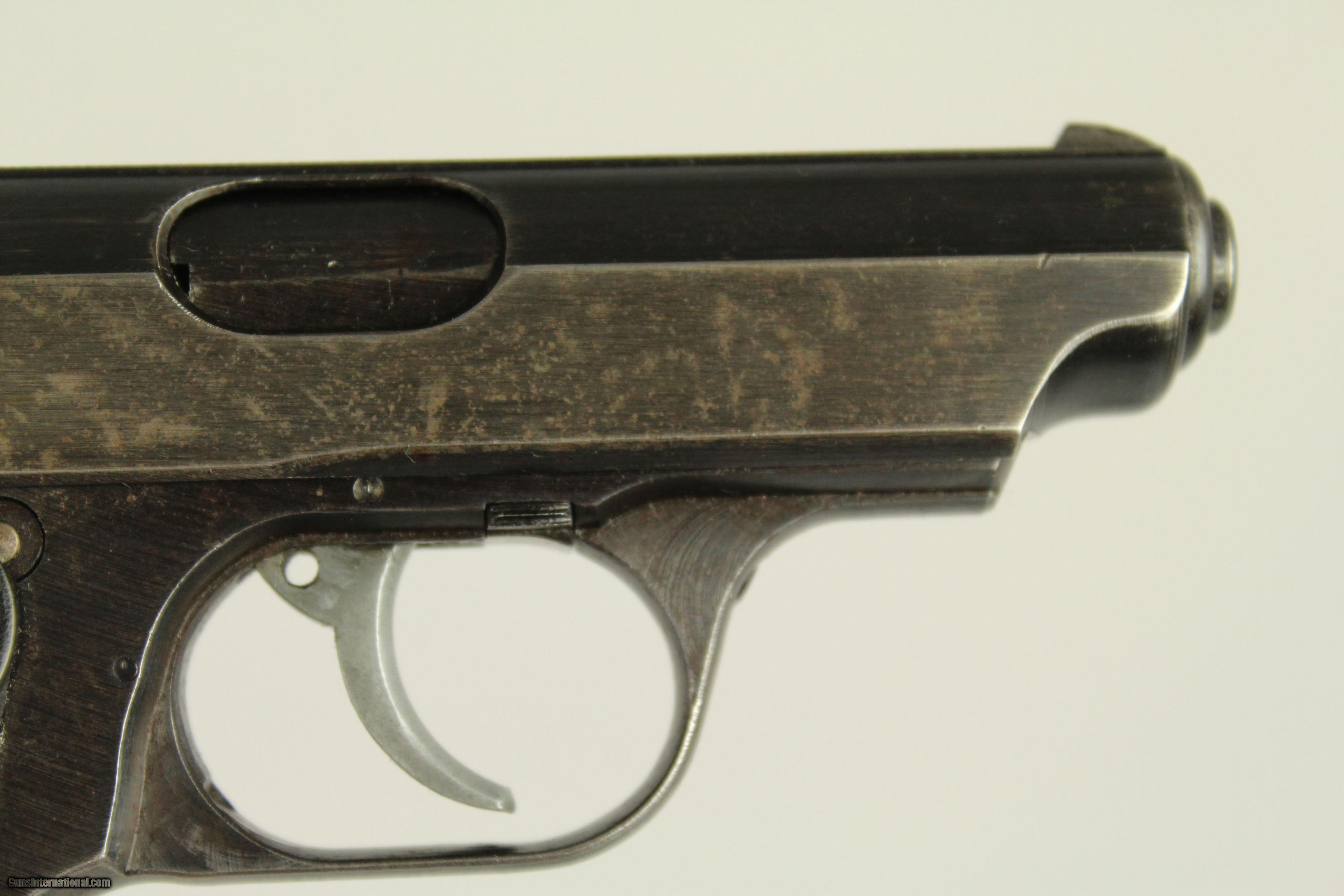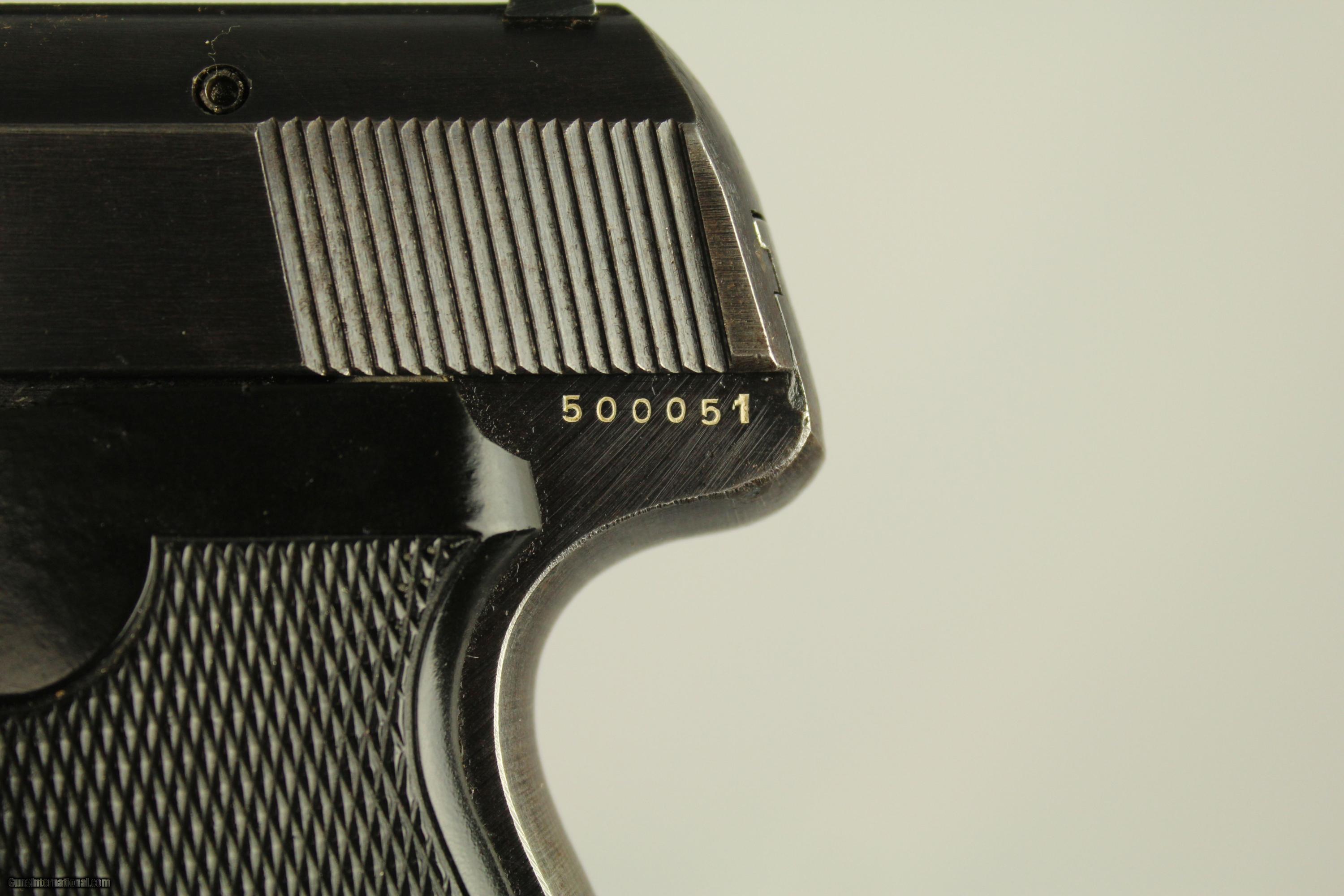 Description: 1943 Dated Rig Nazi POLICE Marked Sauer 38H Pistol SCARCE Example of a Third Reich Police Pistol Here we present a J.P. Sauer & Sons 38H Police Marked Pistol with Holster, made circa 1943. The Model 38 was introduced in 1938 with the “H” designating it as a “hammerless” action. It was made up until the end of World War II, when Germany was finally defeated and the factory closed down. One of the very modern and neat features of this pistol is the cocking and de-cocking lever on the left side of the frame. Yes, you can either use the double action to pull the trigger or push down the lever to put this gun into single action mode. This example is marked with an “Eagle/F”, a Nazi German Police acceptance marking. This was one of the last variants of this weapon that saw its safety lever deleted from the design for speed and ease of manufacture as those things became paramount. The holster is marked “OTTO SINDEL/BERLIN/1943” on the front and “347” on the back. The condition of the holster is fine. The overall condition of this specimen is excellent. The original blue finish is 98%. The markings are clear and legible. The serial numbers match. The magazine is unnumbered. The original grips bear a clear Sauer monogram and sharp checkering. The bore is clean and shiny. The action is excellent. This firearm is classified as a Curio & Relic. Compare to $2100! Barrel is 3-3/8 inches in length. Caliber: .32 ACP (7.65x17mm Browning) The bore is in fine condition and the action is strong. Overall condition as seen in photos. Here is an exceptional WWII Police marked Sauer 38H with an outstanding holster! Very Fast. Very Safe. FREE SHIPPING. Will need to be sent to your local FFL. Guaranteed AUTHENTIC & Includes CERTIFICATE OF AUTHENTICITY. ancestryguns $1400 #21947 SOLD Curio/Relic: Yes |