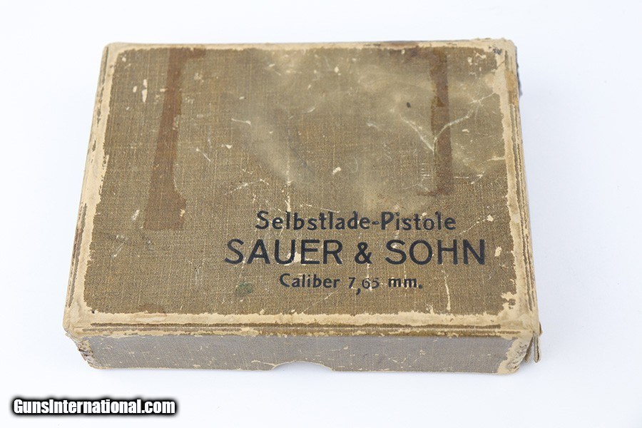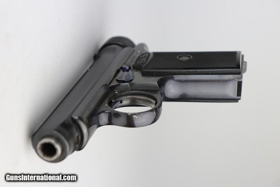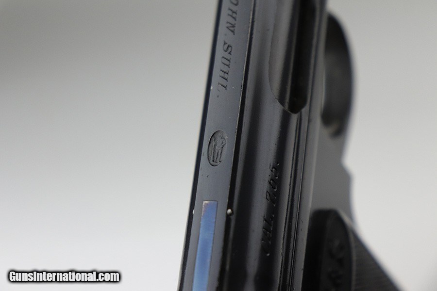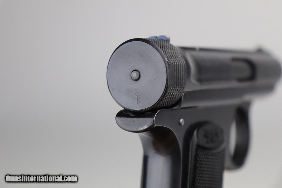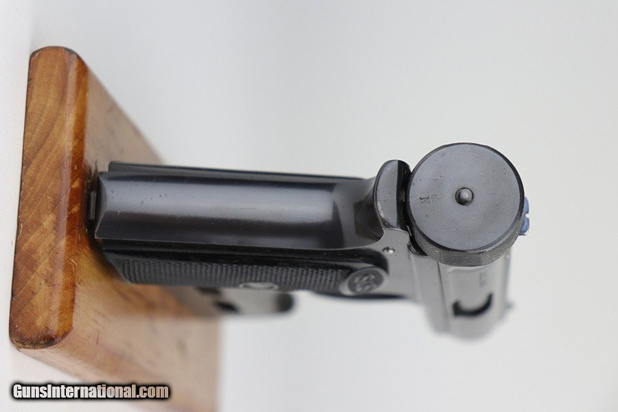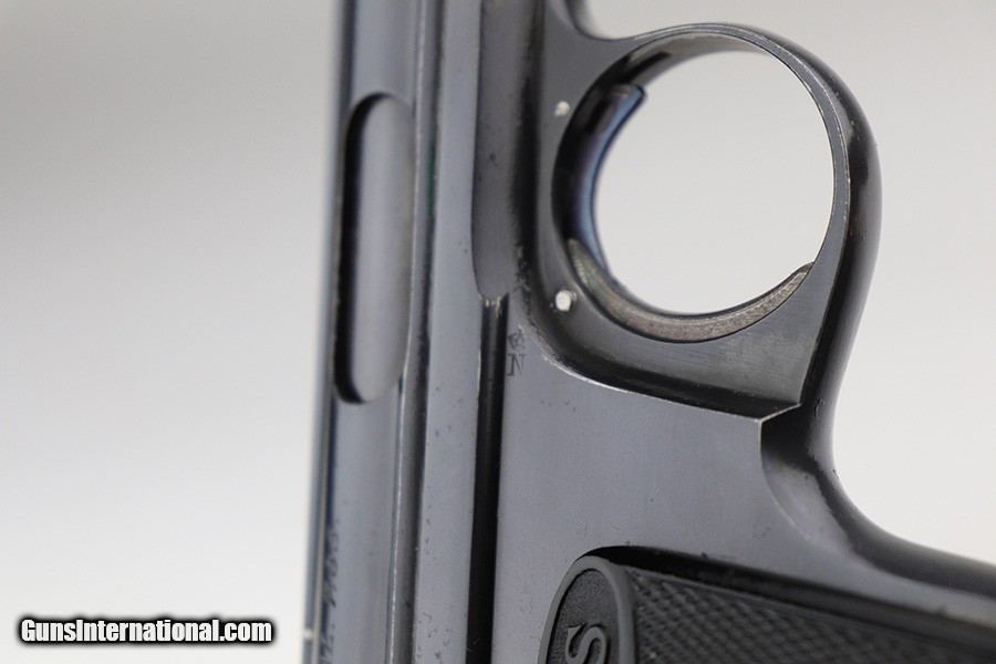 Description: This is a very nice example of a Sauer Model 1913 that comes in the original matching box. The box is hand-numbered in pencil on the back. The box is worn and torn along the edges in general. The gun is all matching and has the proper "Crown N" commercial proofs. Comes with excellent black grips and a proper magazine. The gun has retained about 94% of its original finish. Fire blue mostly intact on the safety lever. There is an area of noticeable scratching around the safety lever and some minor dings on the underside of the frame, underside of the trigger guard, and on the front strap. The safety lever is very loose. The rifling in the bore is a bit worn and there is spotty oxidation throughout. SOLD Curio/Relic: Yes Handgun Caliber: .32 ACP (7.65x17mm Browning SR) Manufacturer: Sauer Bore: 5/10 Condition: ~94% |