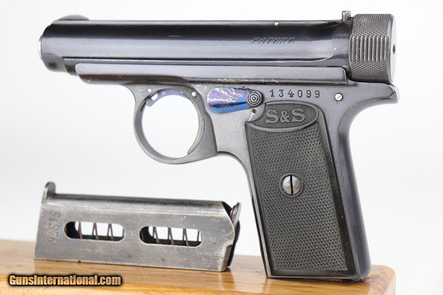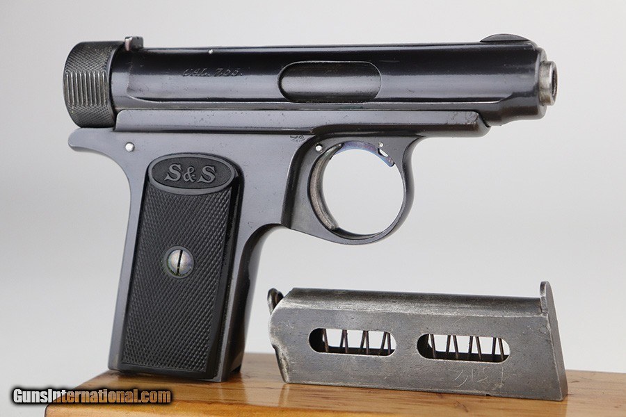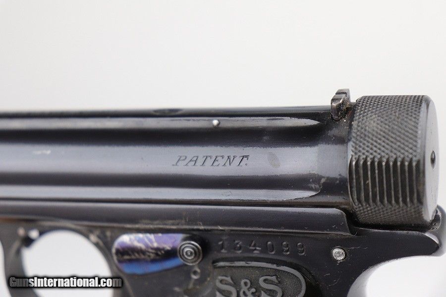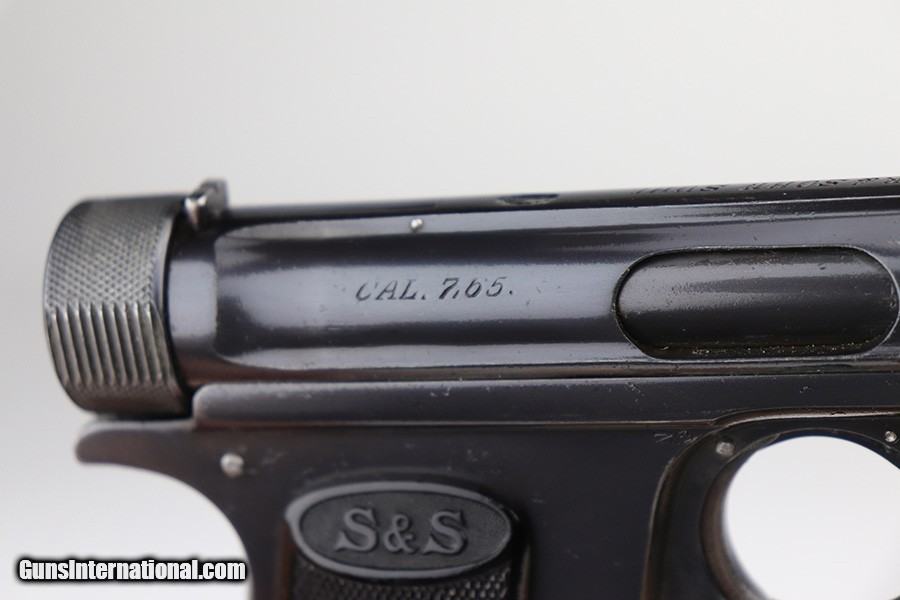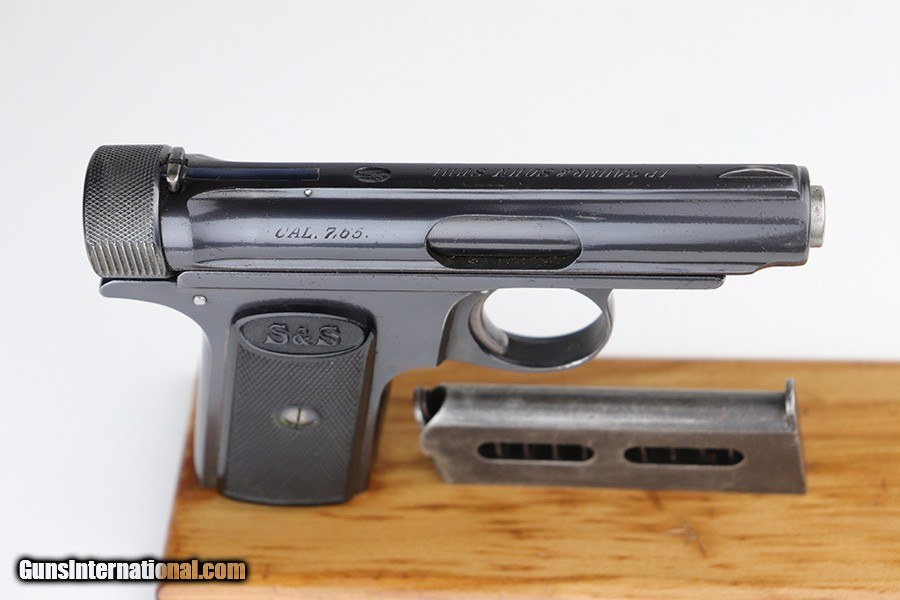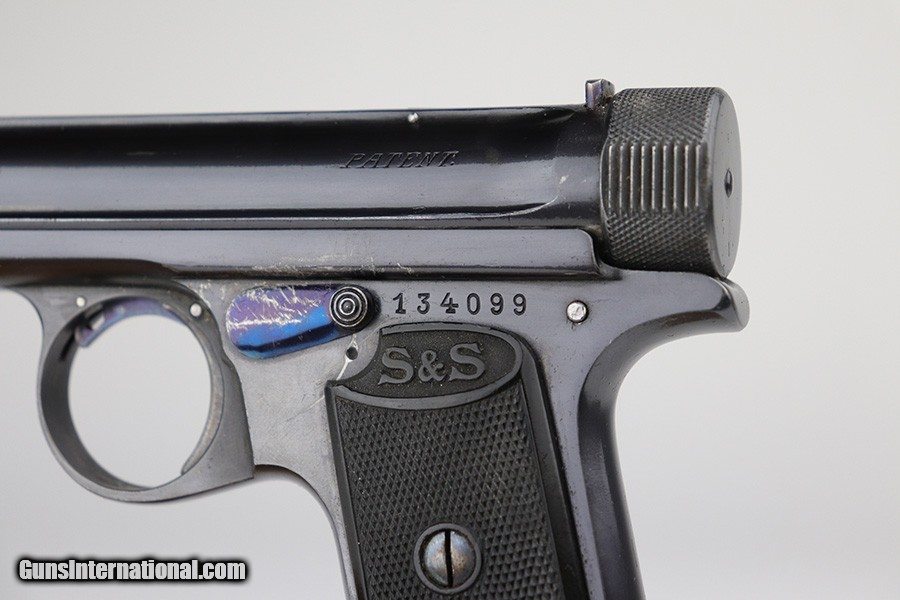 Description: This is a very nice example of a Sauer Model 1913 that comes in the original matching box. The box is hand-numbered in pencil on the back. The box is worn and torn along the edges in general. The gun is all matching and has the proper "Crown N" commercial proofs. Comes with excellent black grips and a proper magazine. The gun has retained about 94% of its original finish. Fire blue mostly intact on the safety lever. There is an area of noticeable scratching around the safety lever and some minor dings on the underside of the frame, underside of the trigger guard, and on the front strap. The safety lever is very loose. The rifling in the bore is a bit worn and there is spotty oxidation throughout. SOLD Curio/Relic: Yes Handgun Caliber: .32 ACP (7.65x17mm Browning SR) Manufacturer: Sauer Bore: 5/10 Condition: ~94% |